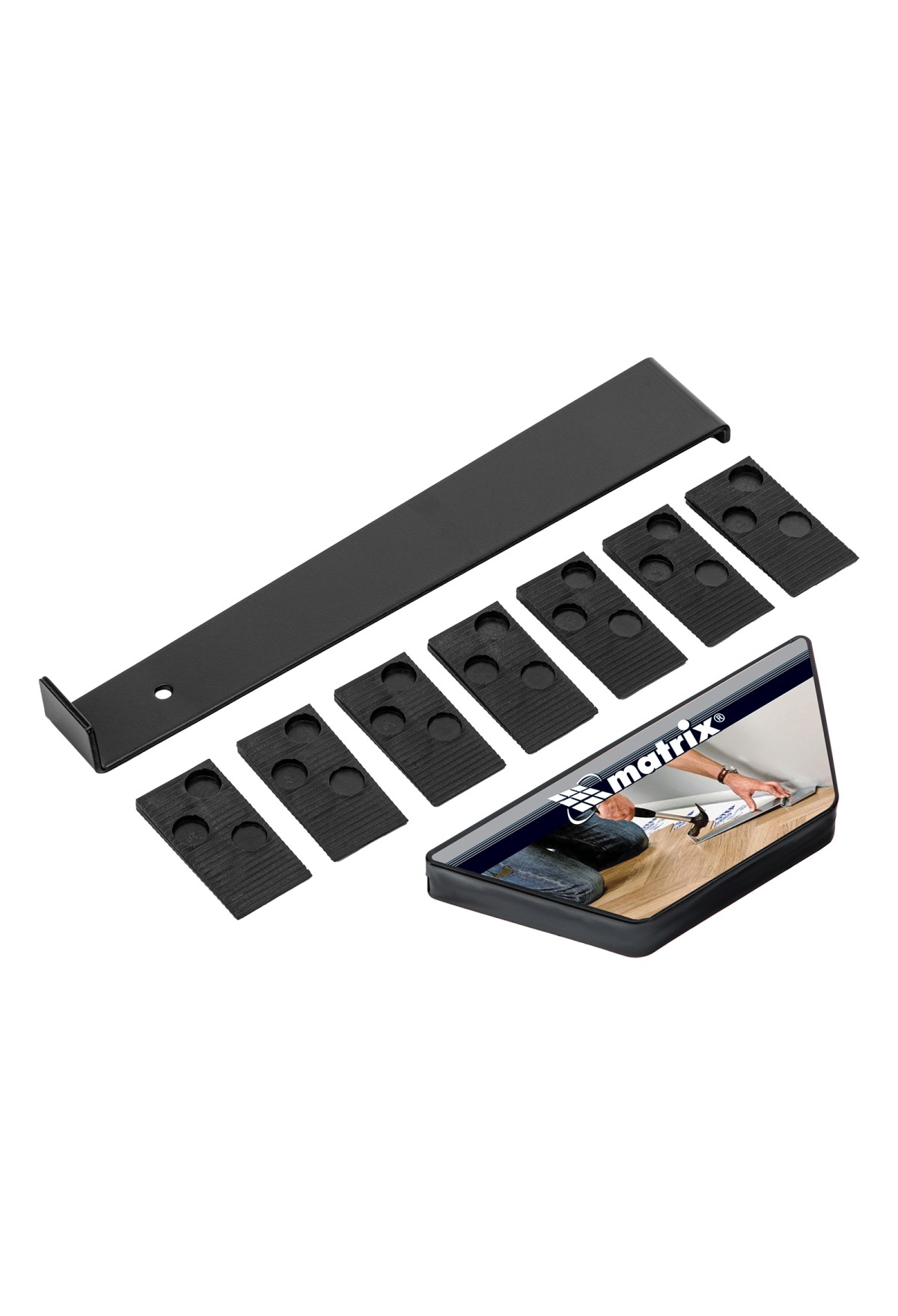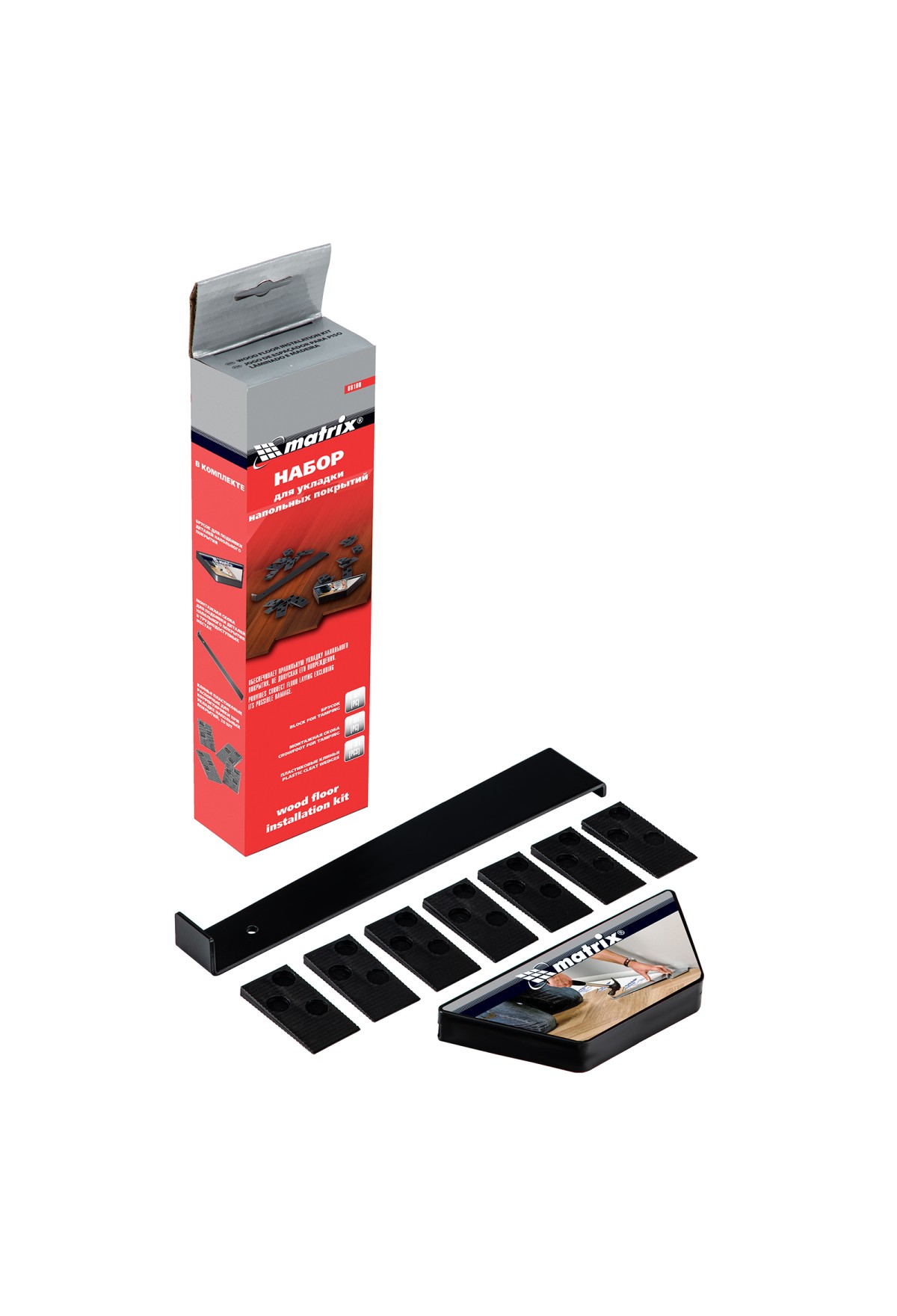 Набор Matrix 88100 предназначен для правильной укладки напольных покрытий без дефектов и повреждений. Набор включает все необходимое для монтажа: распорные клинья, брусок и скобу. Клинья позволяют точно выровнять первый ряд и отрегулировать зазор между панелями и стеной. При помощи скобы можно подбить последний ряд для плотной усадки. Брусок защищает замок панелей, если нужно подбить стыки молотком.