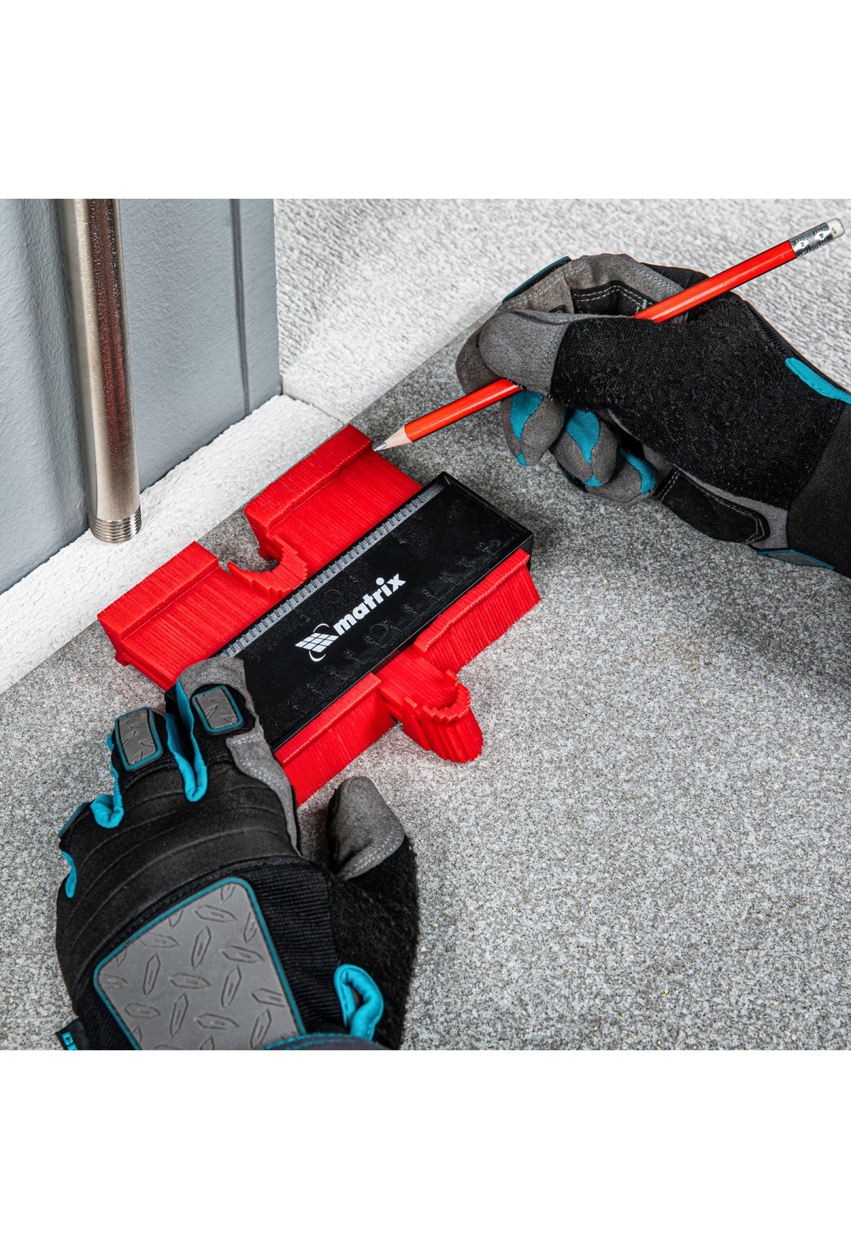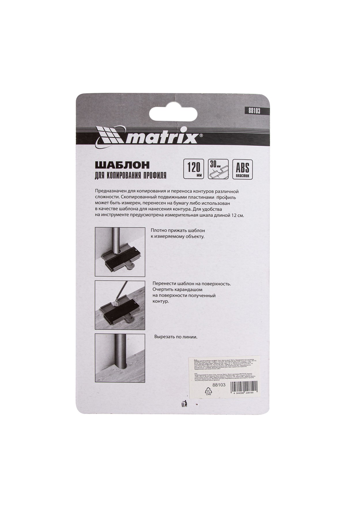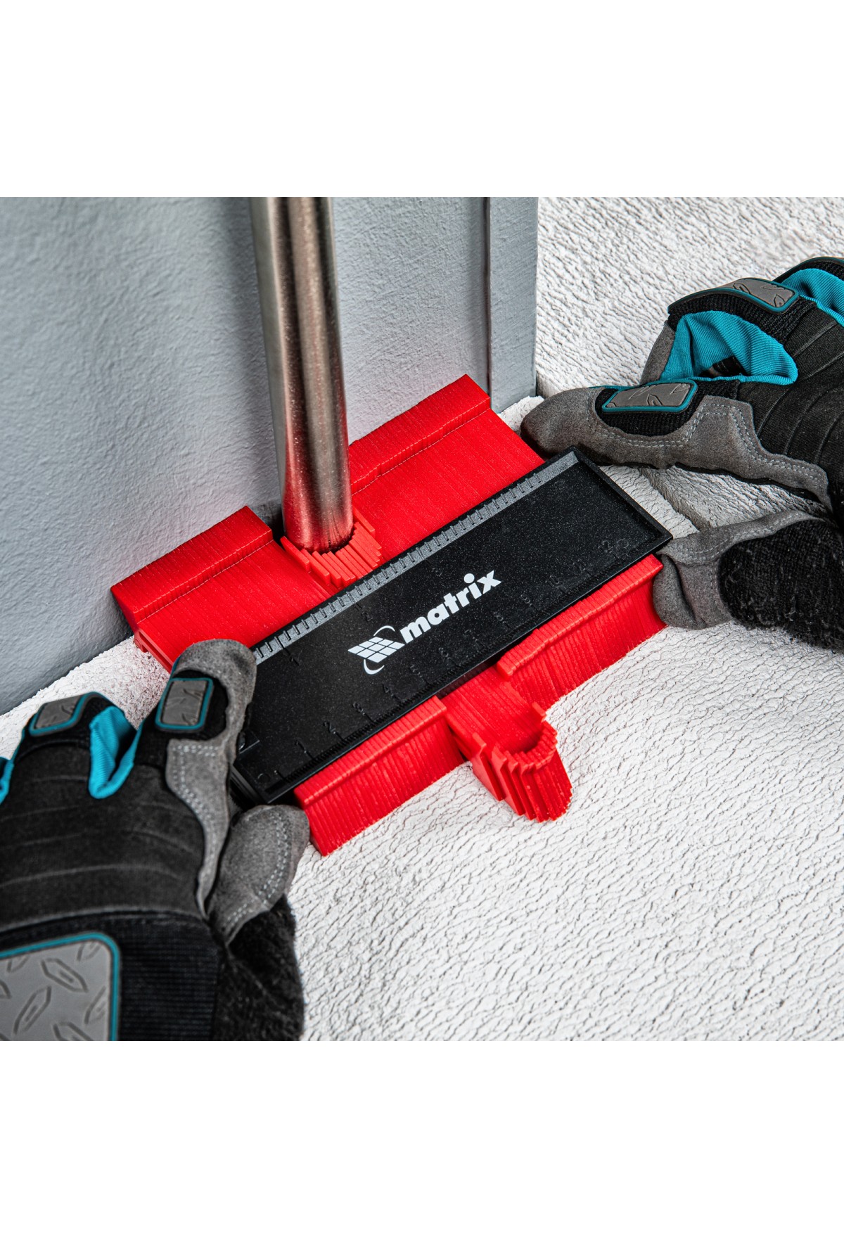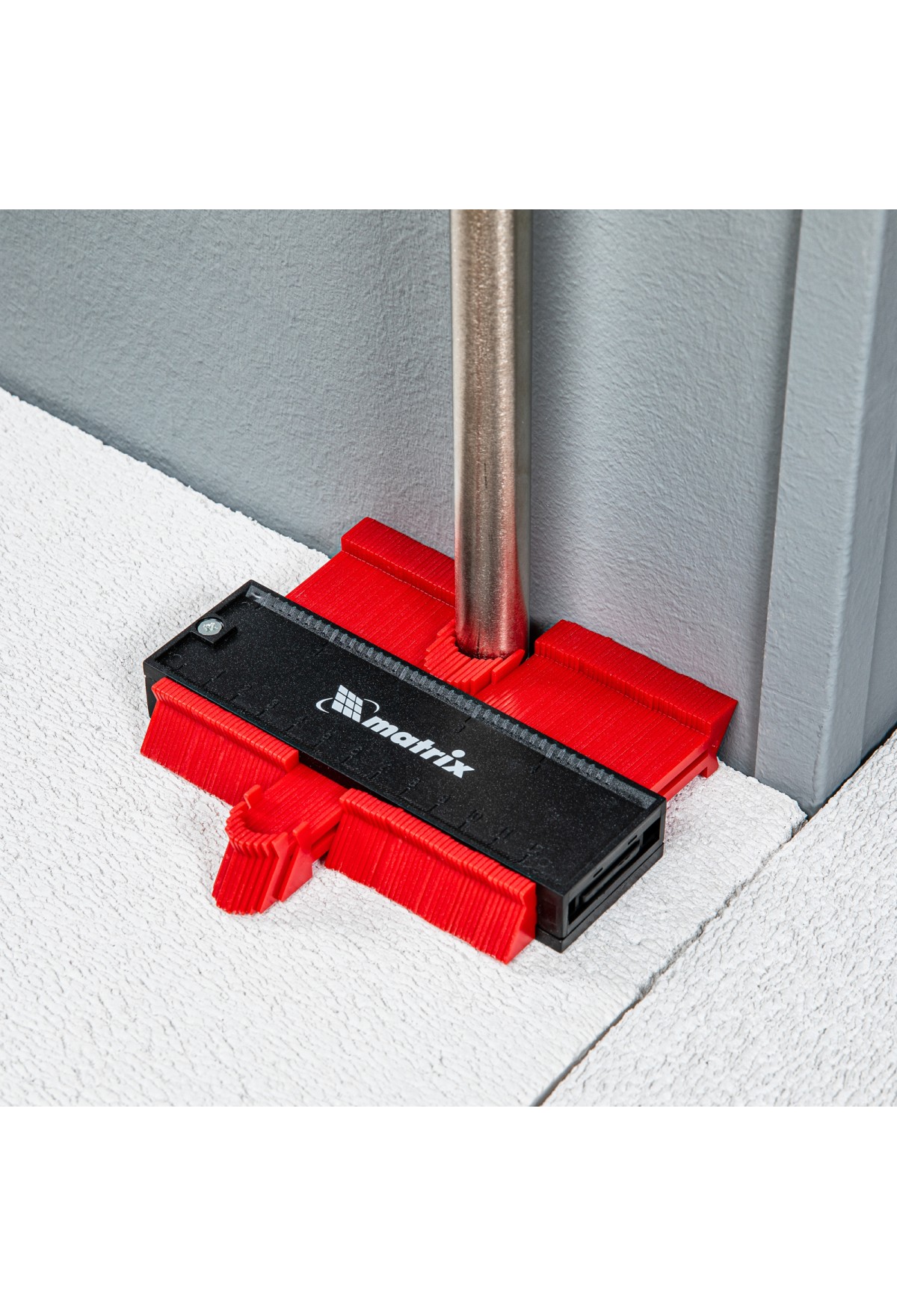 Пластиковый шаблон для копирования профиля Matrix 88103 предназначен для копирования и переноса контуров различных форм. Шаблон необходим для точной подрезки отделочных материалов (ламината, линолеума, кафельной плитки, гипсокартона и др.) при обходе труб водоснабжения, углов и других рельефных препятствий. Перенос контуров осуществляется при помощи выдвижных пластиковых пластин. Шаблон оснащен измерительной шкалой длиной 12 см.