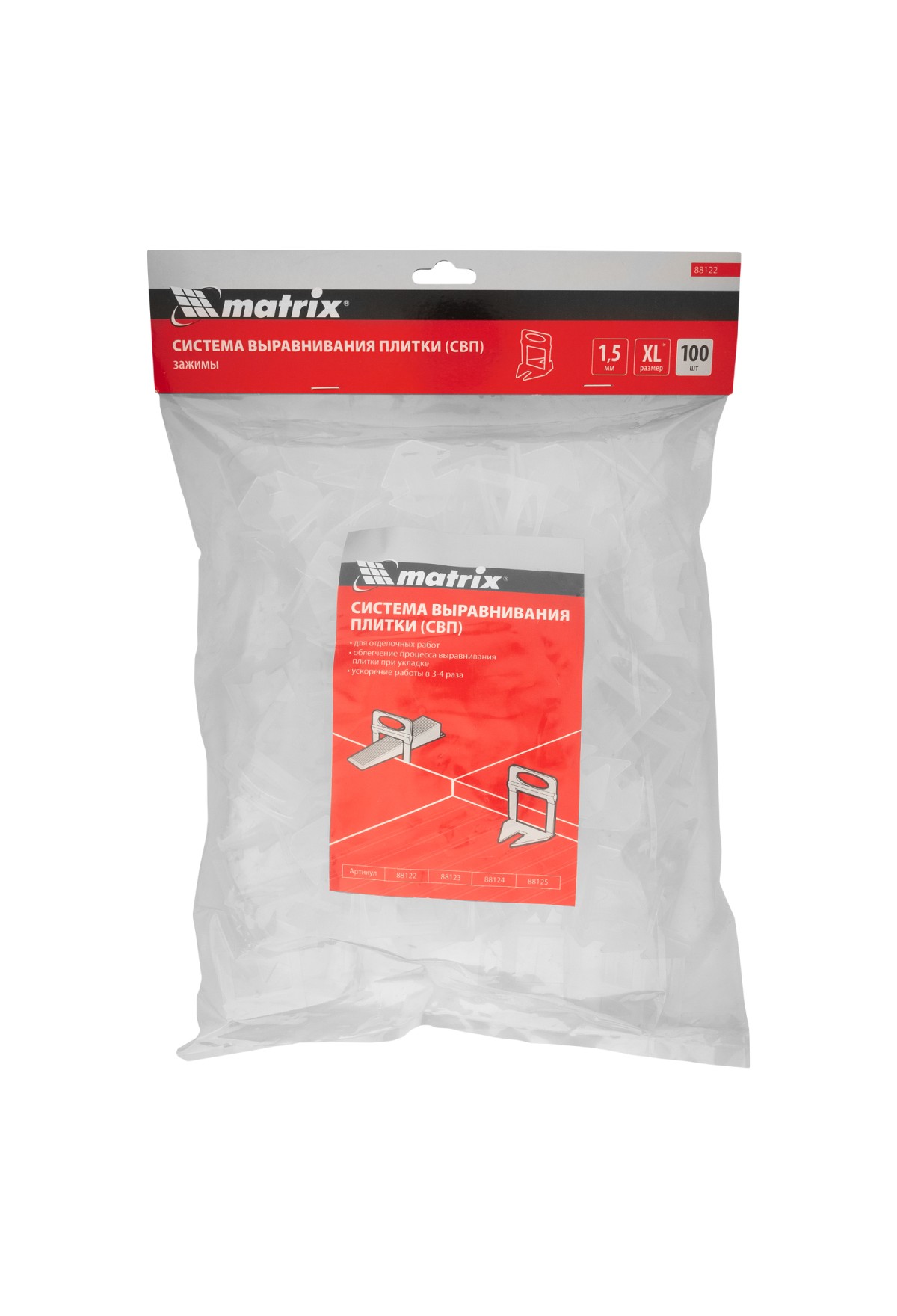 Система выравнивания плитки (СВП Ворота XL) Matrix 88122 состоит из зажимов (100 шт. в пакете), используемых совместно с клиньями Matrix 88123. Зажимы позволяют добиться качественного результата за счет того, что межплиточные швы получаются ровными и аккуратными, плитка не смещается, а клей распределяется равномерно. Зажимы для плитки (СВП) предназначены для формирования швов толщиной 1,5 мм при работе с керамической или керамогранитной плиткой.