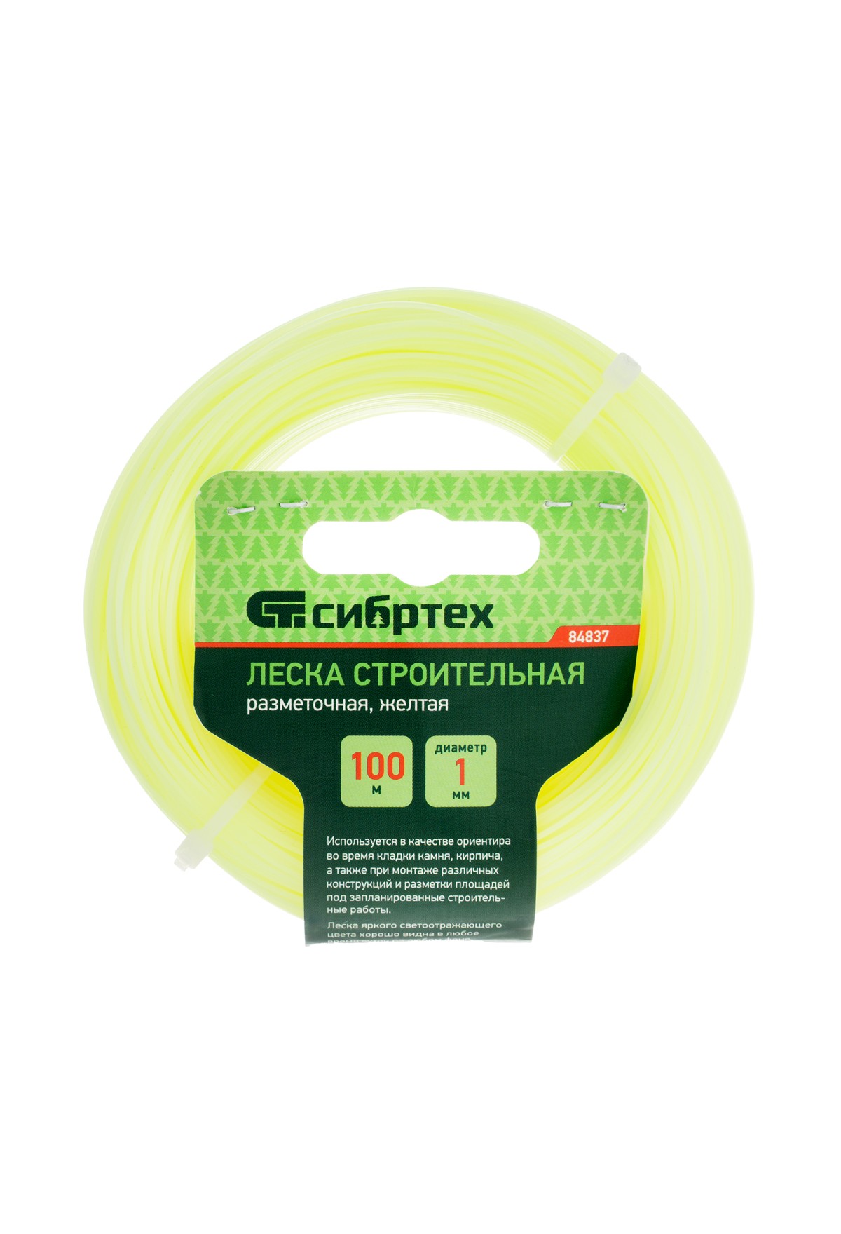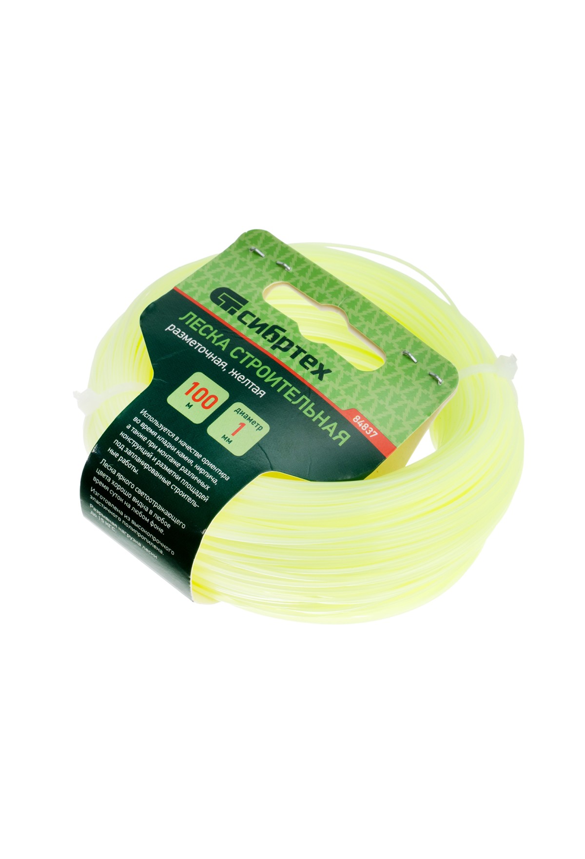 Леска строительная Сибртех 84837, длина 100 м, диаметр 1 мм, желтого цвета, пригодится на строительной площадке как ориентир при укладке материалов, установке конструкций. Также она будет полезна для садоводов для разметки территории. Если леску натянуть, то получается идеально ровная линия, что повышает точность работы, а также позволяет проводить замеры с ее помощью.