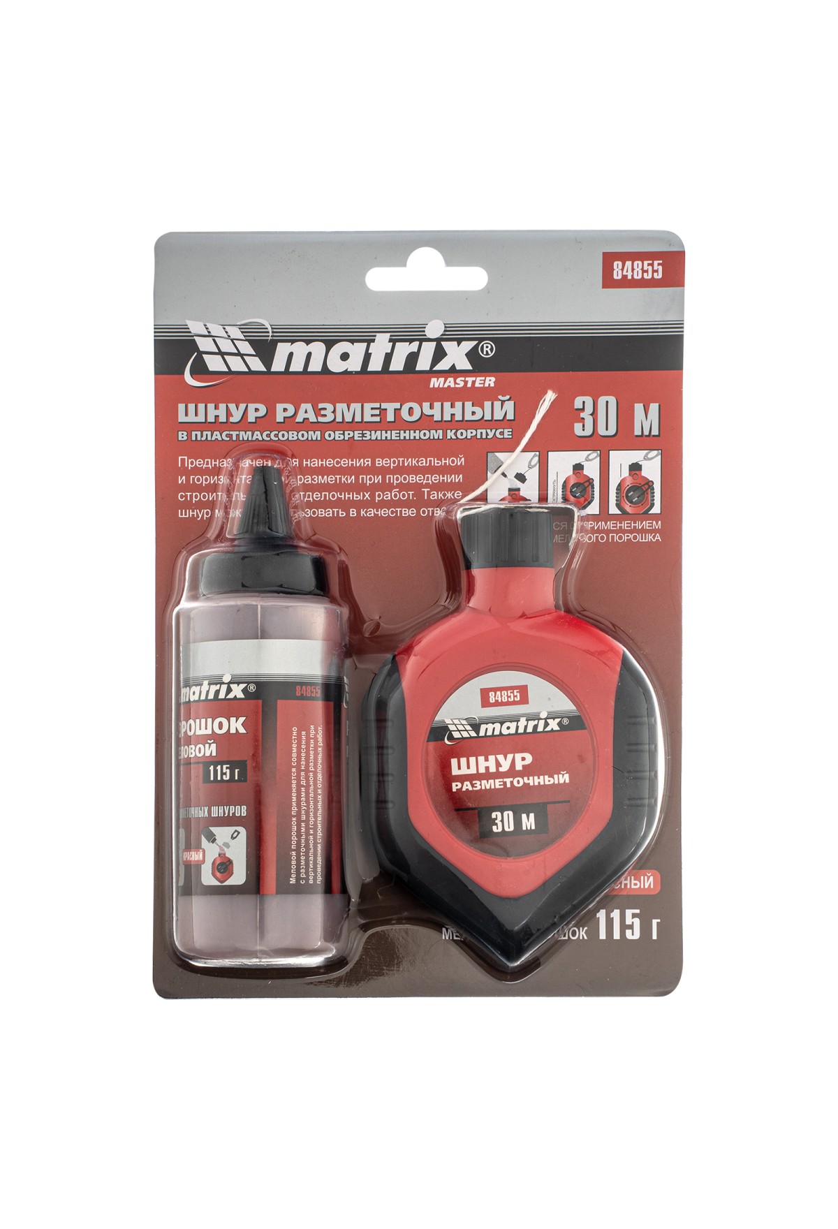 Разметочный шнур Matrix 84855 в пластмассовом обрезиненном корпусе, поставляется с красным порошком и используется для построения прямых разметочных линий на горизонтальных и вертикальных поверхностях. Используется во время проведения строительных и ремонтно-отделочных работ.