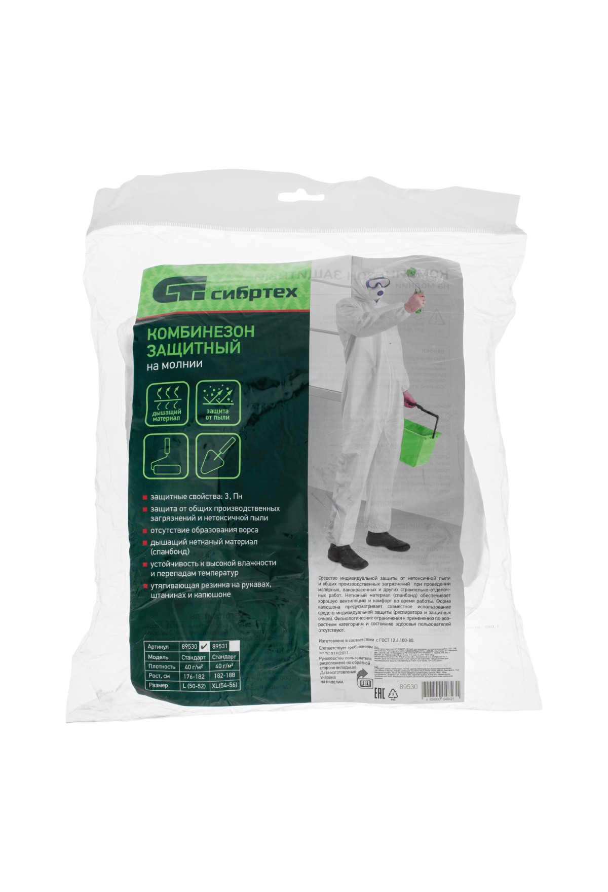 Технические характеристики Комбинезон защитный СТАНДАРТ, 40 г/м2, для малярных и строительных работ, 176 - 182 см Сибртех