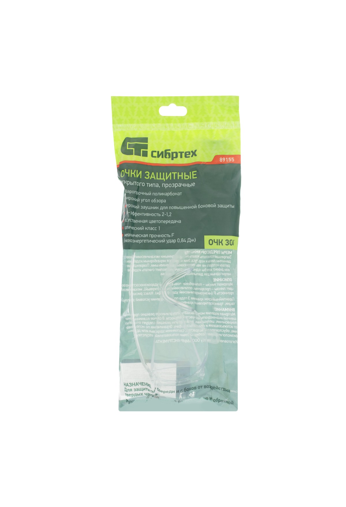 Технические характеристики Очки защитные открытого типа, прозрачные, ударопрочный поликарбонат Россия Сибртех