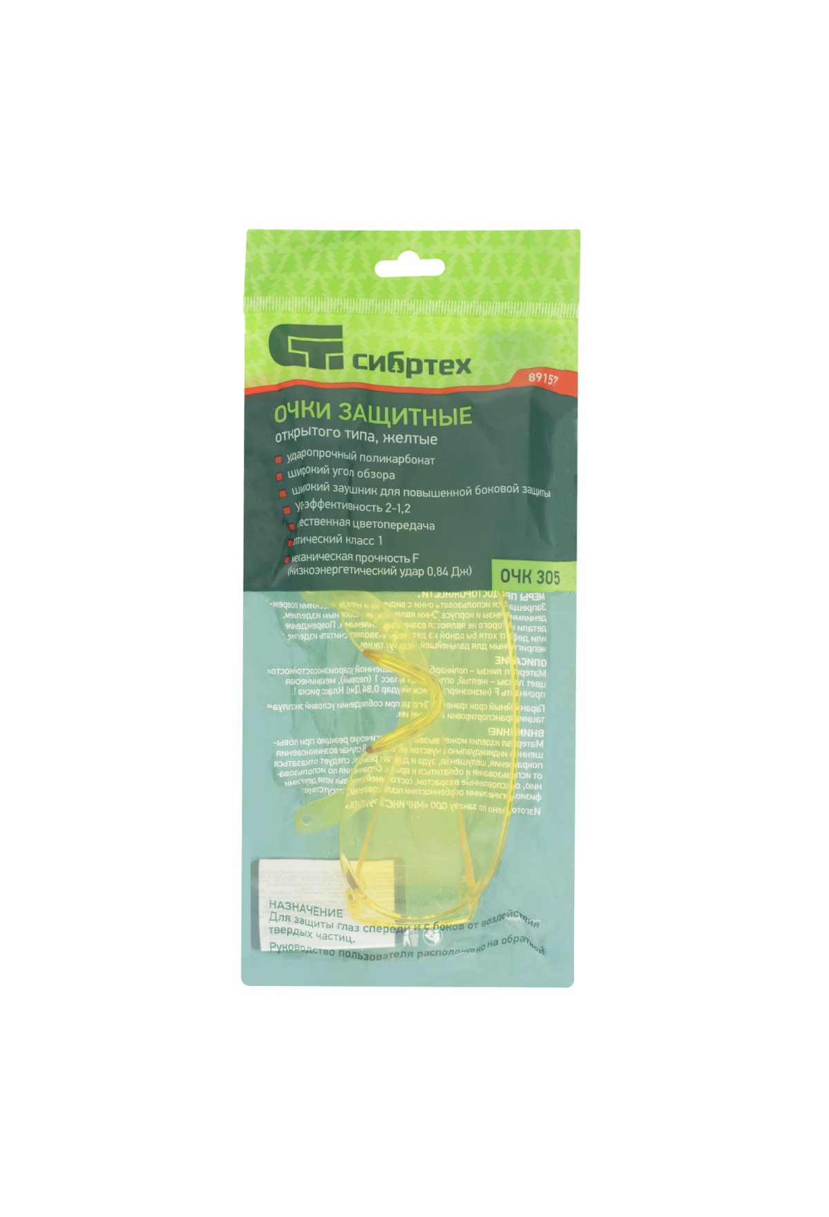 Технические характеристики Очки защитные открытого типа, желтые, ударопрочный поликарбонат Россия Сибртех