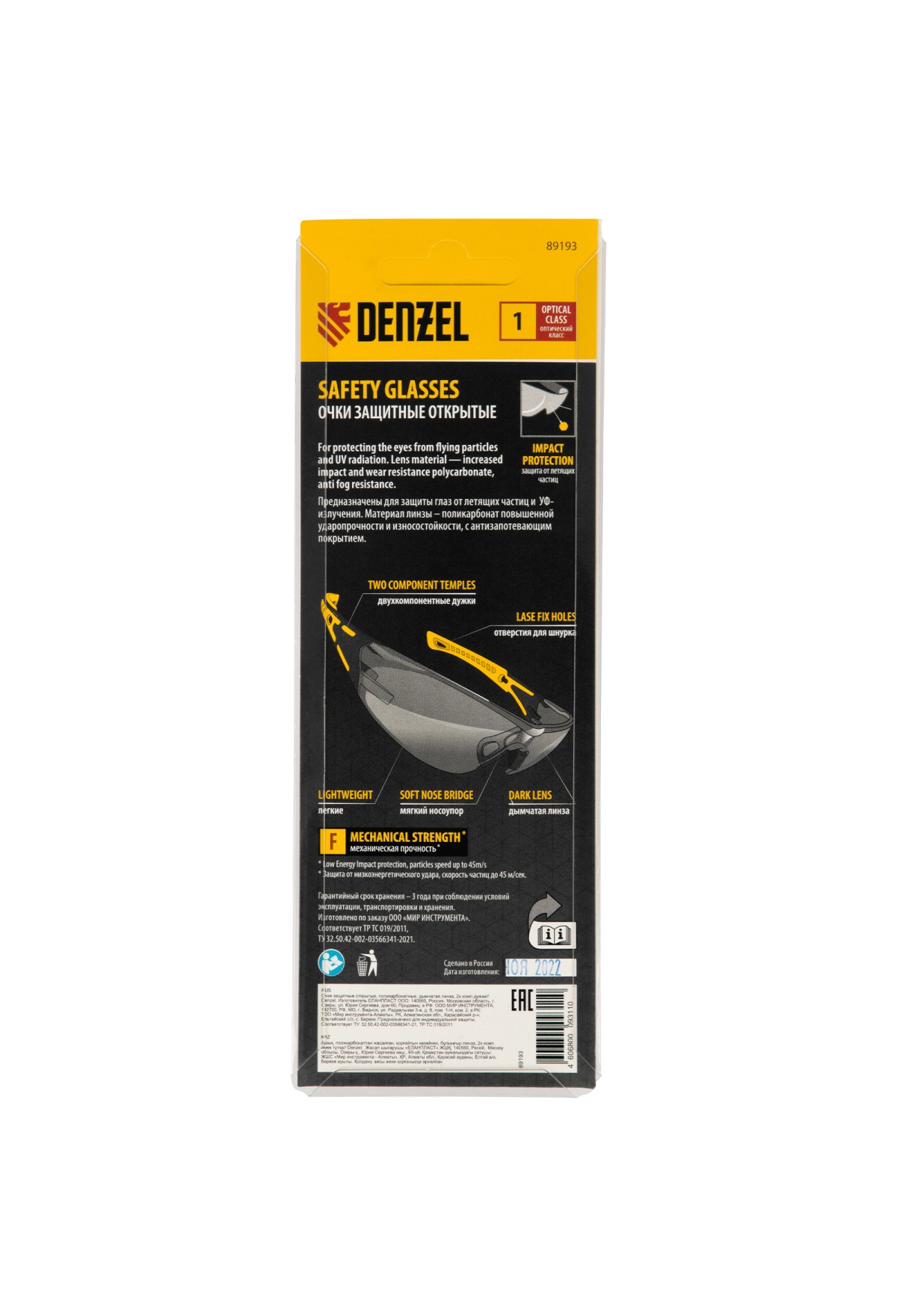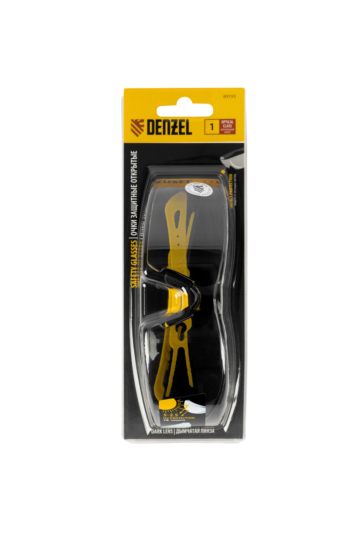 Легкие универсальные защитные очки открытого типа Denzel 89193 с поликарбонатными дымчатыми линзами и 2-компонентными дужками предназначены для защиты глаз от механических повреждений и УФ-излучения. Очкам присвоен класс механической прочности F, они обеспечивают защиту от высокоскоростных частиц с низкоэнергетическим ударом V=45 м/с. Очки используются во время работы с электро- и бензоинструментом, на производстве и в быту.