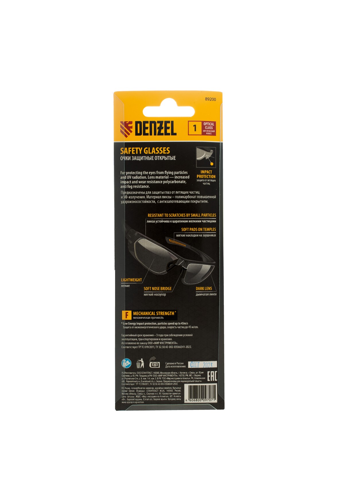 Очки защитные открытые Denzel 89200 с поликарбонатными дымчатыми линзами предназначены для защиты глаз от механических повреждений и УФ-излучения. Очкам присвоен класс механической прочности F, они обеспечивают защиту от высокоскоростных частиц с низкоэнергетическим ударом (скорость частиц до 45 м/с). Легкие универсальные очки используются во время работы с электро- и бензоинструментом, на производстве и в быту.