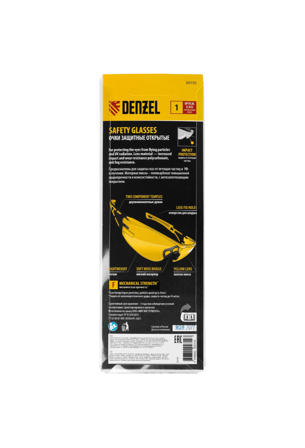 Легкие универсальные защитные очки открытого типа Denzel 89192 с поликарбонатными желтыми линзами и 2-компонентными дужками предназначены для защиты глаз от механических повреждений и УФ-излучения. Очкам присвоен класс механической прочности F, они обеспечивают защиту от высокоскоростных частиц с низкоэнергетическим ударом V=45 м/с. Очки используются во время работы с электро- и бензоинструментом, на производстве и в быту.
