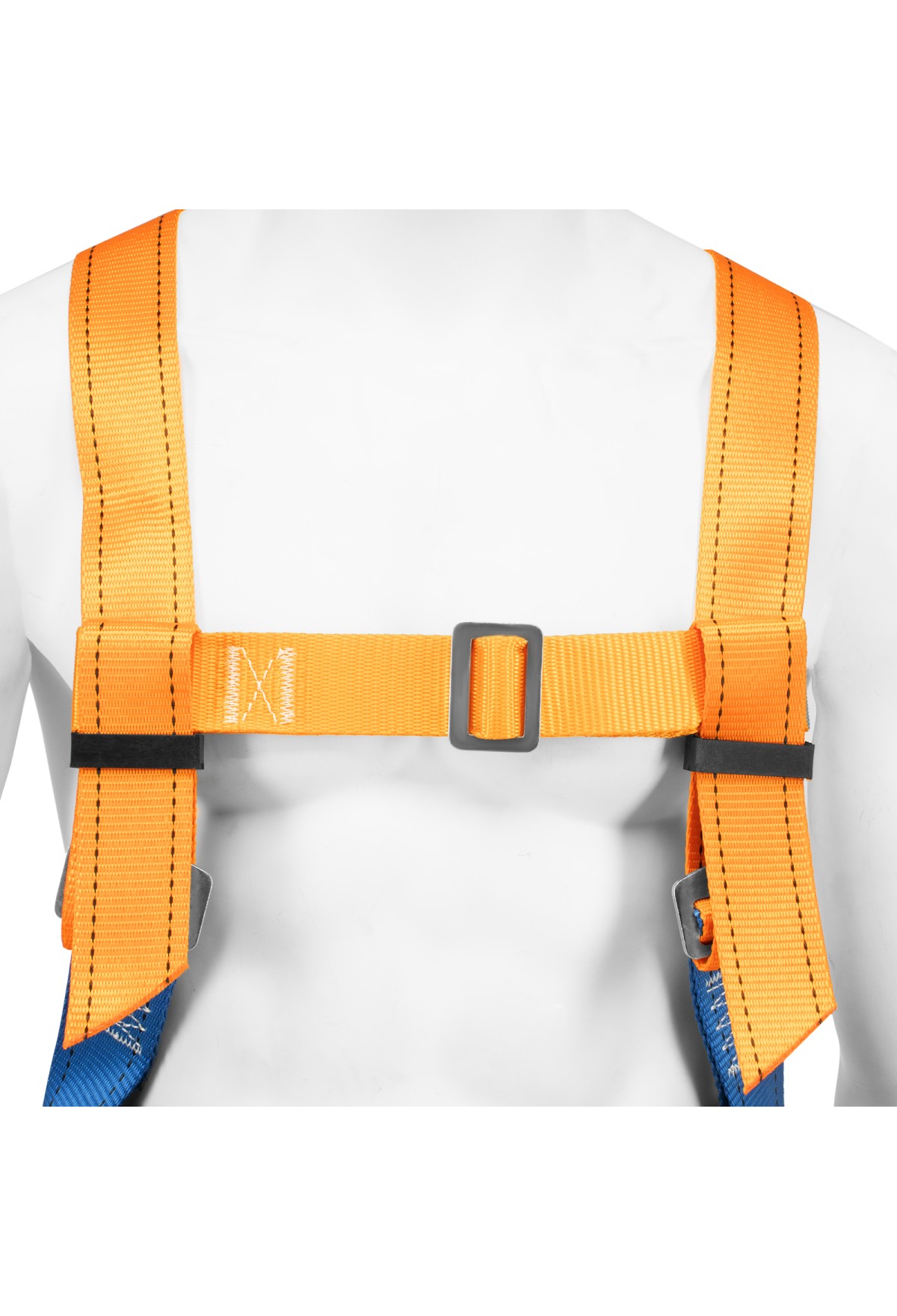 - Быстрая подготовка к работе — привязь универсального размера легко застегивается при помощи быстрозатягивающихся регулировочных пряжек и вспомогательной ленты в области груди.