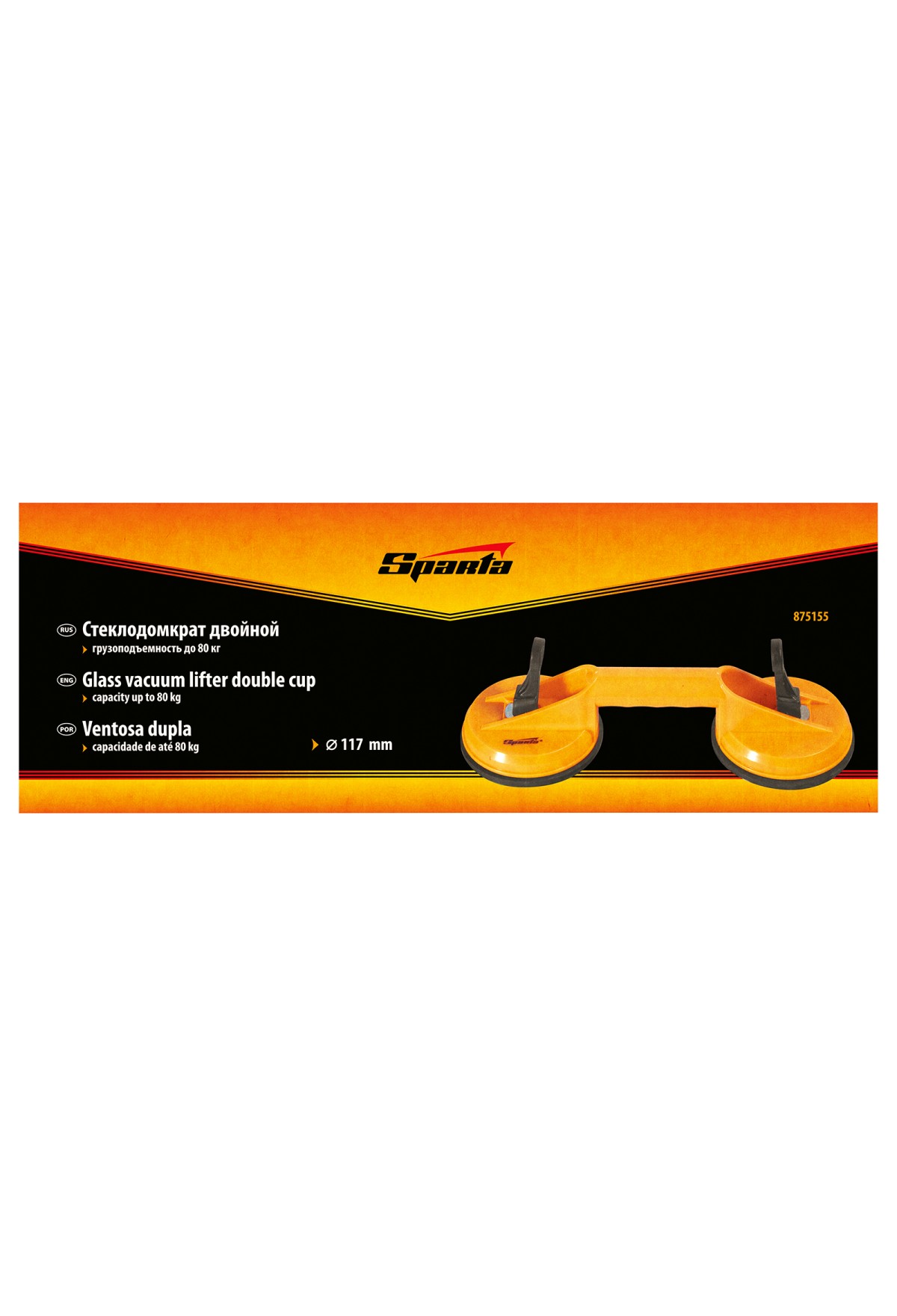Двойной стеклодомкрат Sparta 875155 предназначен для удержания, переноски и установки зеркал, стекол, столешниц, кафельной плитки и других плоских гладких предметов массой до 80 кг. Две вакуумные присоски бережно, но надежно фиксируются на поверхности при помощи зажимов. Стеклодомкрат будет полезен во время проведения ремонта, а также пригодится в быту.