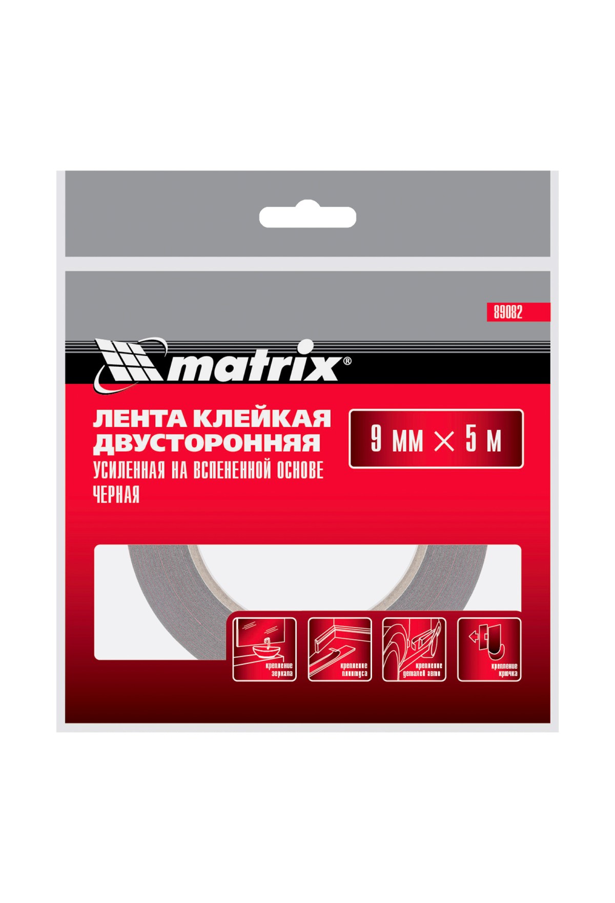Усиленная двусторонняя клейкая лента Matrix 89084 на вспененной основе, размером 9 мм х 5 м, черного цвета, надежно соединяет ровные и шероховатые поверхности без риска их повреждения. Подходит для склеивания предметов из металла, пластика, картона, керамики, стекла. Пригодится в ходе проведения ремонтных, монтажных работ, а также для занятий рукоделием. Лента может использоваться для монтажа предметов, подвергающихся вибронагрузкам и сдвигам: автомобильных молдингов, зеркал, крючков и т.д.