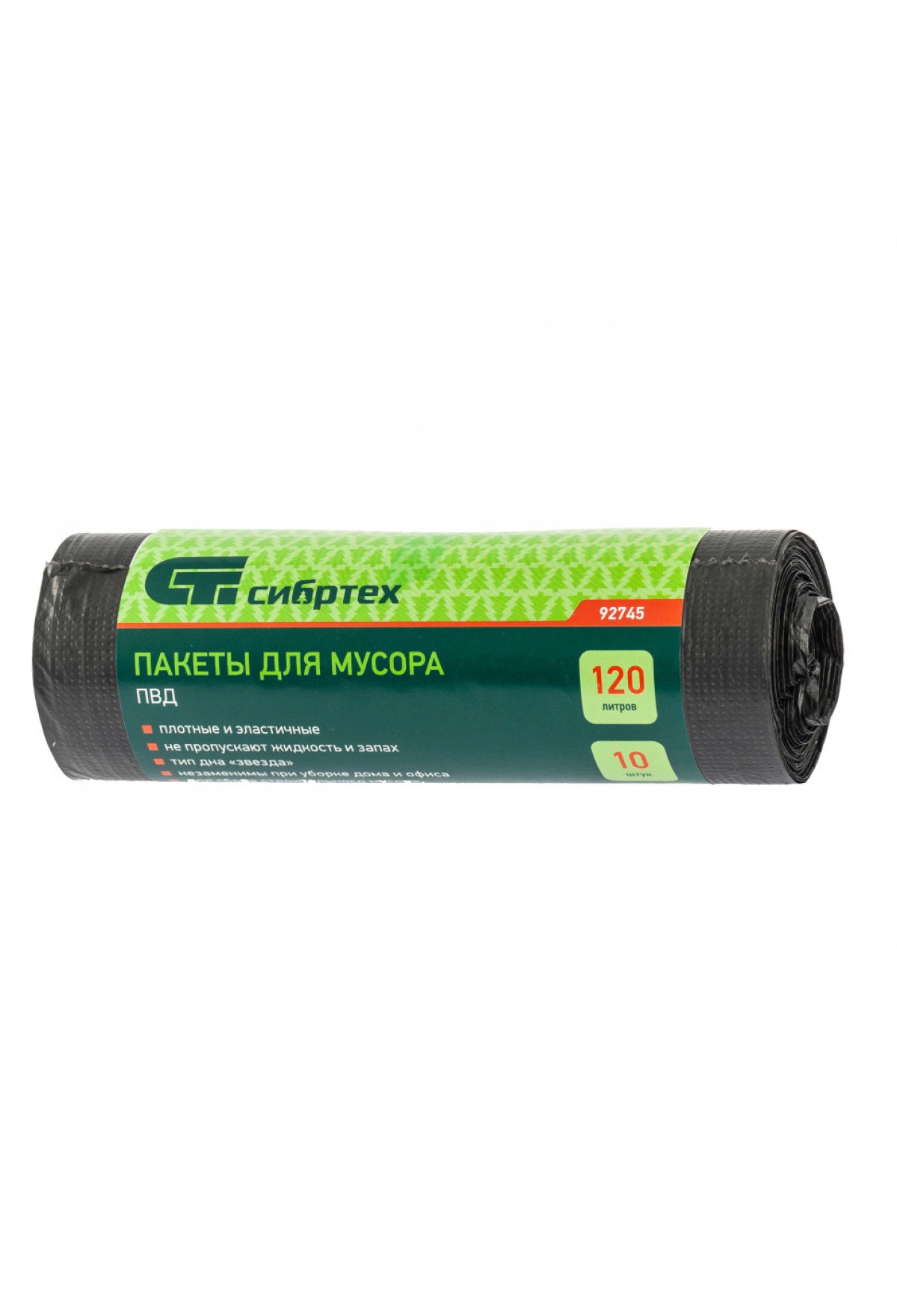 Пакеты для мусора 120 л x 10 шт, пвд, короткий ролик, тип дна "Звезда",Россия Сибртех