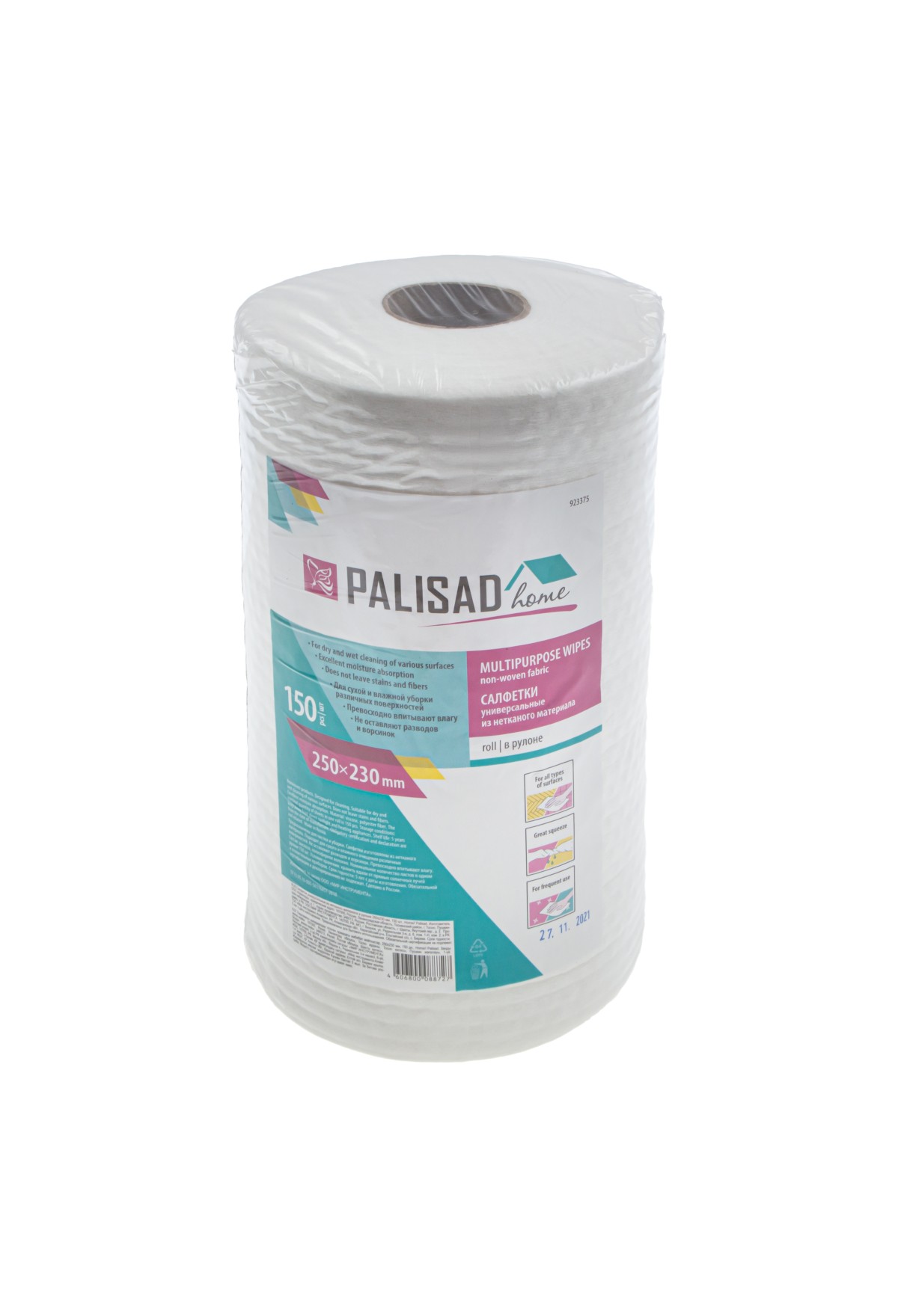 Салфетки универсальные из нетканого материала в рулоне Home Palisad 923375 размером 250 x 230 мм, 150 шт., отлично подходят для уборки дома, офиса или автомобиля. Благодаря своему составу (вискоза 50%, полиэстер 50%) хорошо собирают влагу и легко выжимаются. Салфетки удобно отделять от рулона по перфорированному краю.
