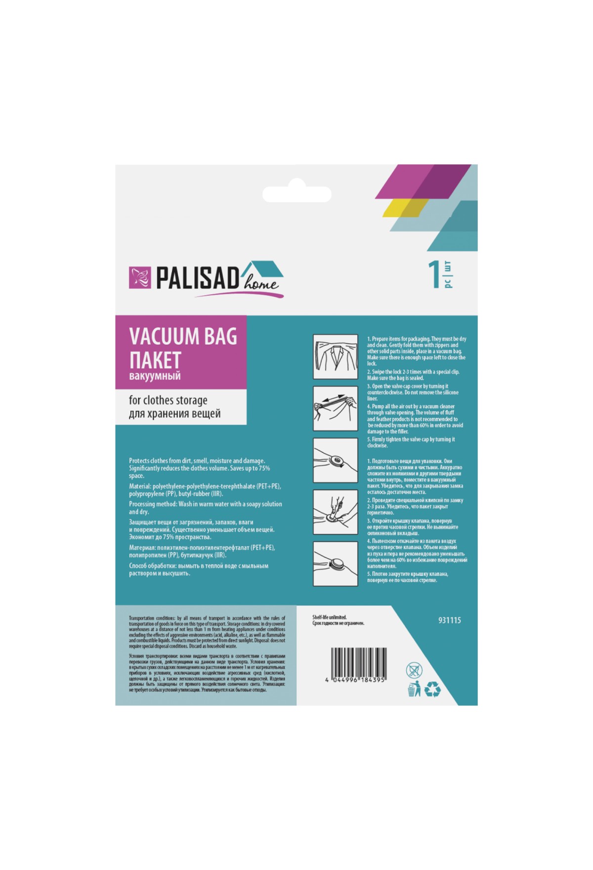 Вакуумный пакет для упаковки и хранения вещей Palisad Home 931115 размером 70 х 100 см позволяет компактно и аккуратно подготовить к транспортировке или разместить в зоне хранения одежду, игрушки, постельные принадлежности и т.д. Пакет из прочного полиэтилентерефталата толщиной 55 мкм надежно защищает вещи от повреждений, а также сырости, пыли, плесени, микробов и неприятных запахов.
