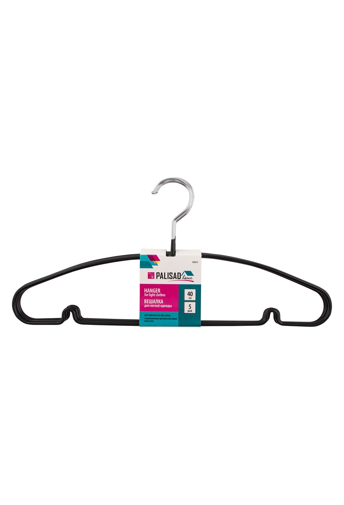 Комплект Palisad Home 929275 включает в себя 5 вешалок с прорезиненным противоскользящим покрытием, длиной 40 см каждая, обеспечивающих бережное хранения легкой одежды: блузок, рубашек, летних брюк и др. Специальная перекладина позволяет подвешивать брюки. А мягкое резиновое покрытие на плечиках и перекладине не допускает соскальзывания одежды и появления на ней заломов.