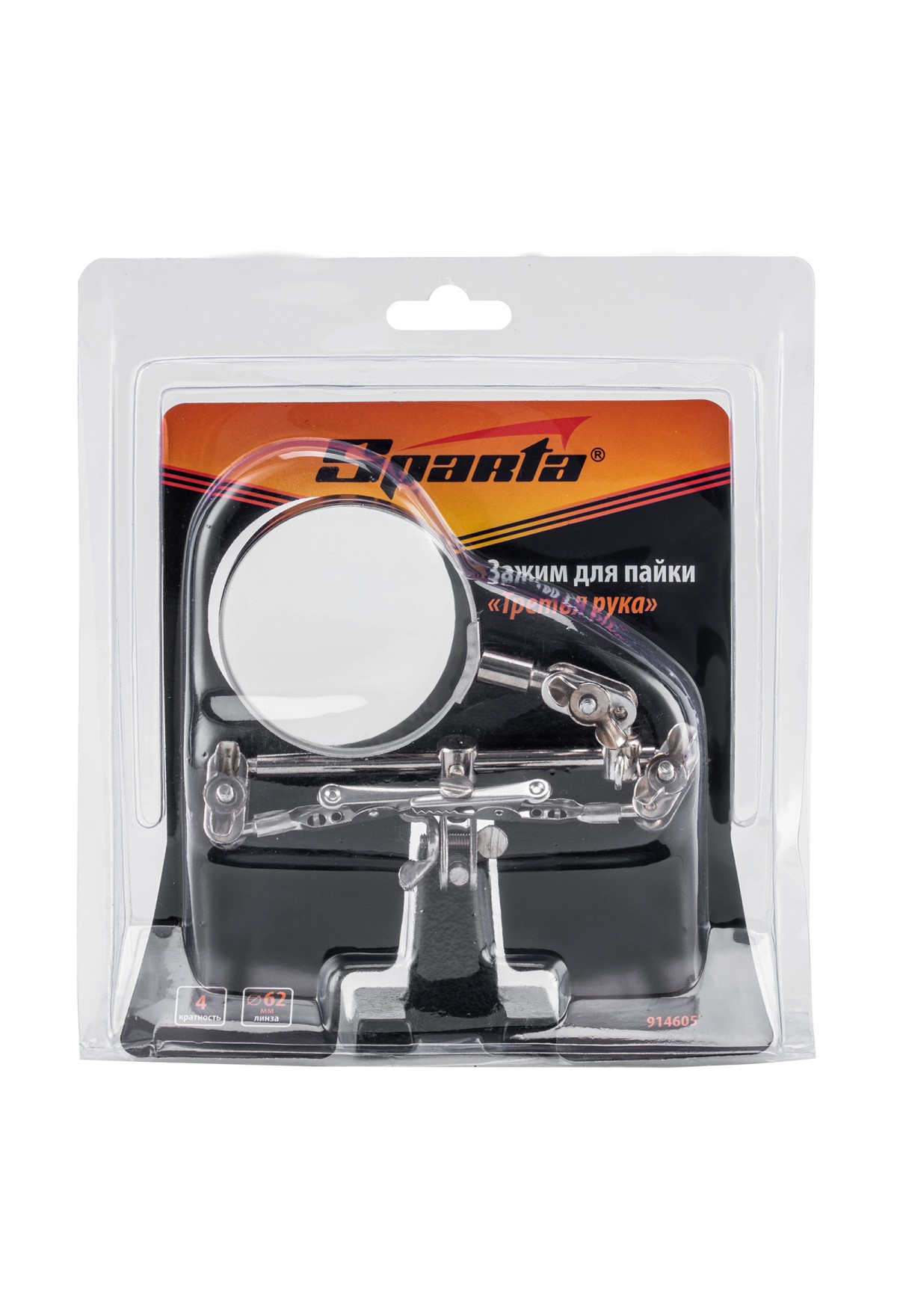 Зажим для пайки Sparta «Третья рука» 914605 предназначен для надежной фиксации плат, проводов и мелких деталей при пайке. Лупа с 4-кратным увеличением позволяет проводить микропайку с высокой точностью. Зажим будет полезен электрикам, мастерам по ремонту техники, а также пригодится в бытовой сфере.