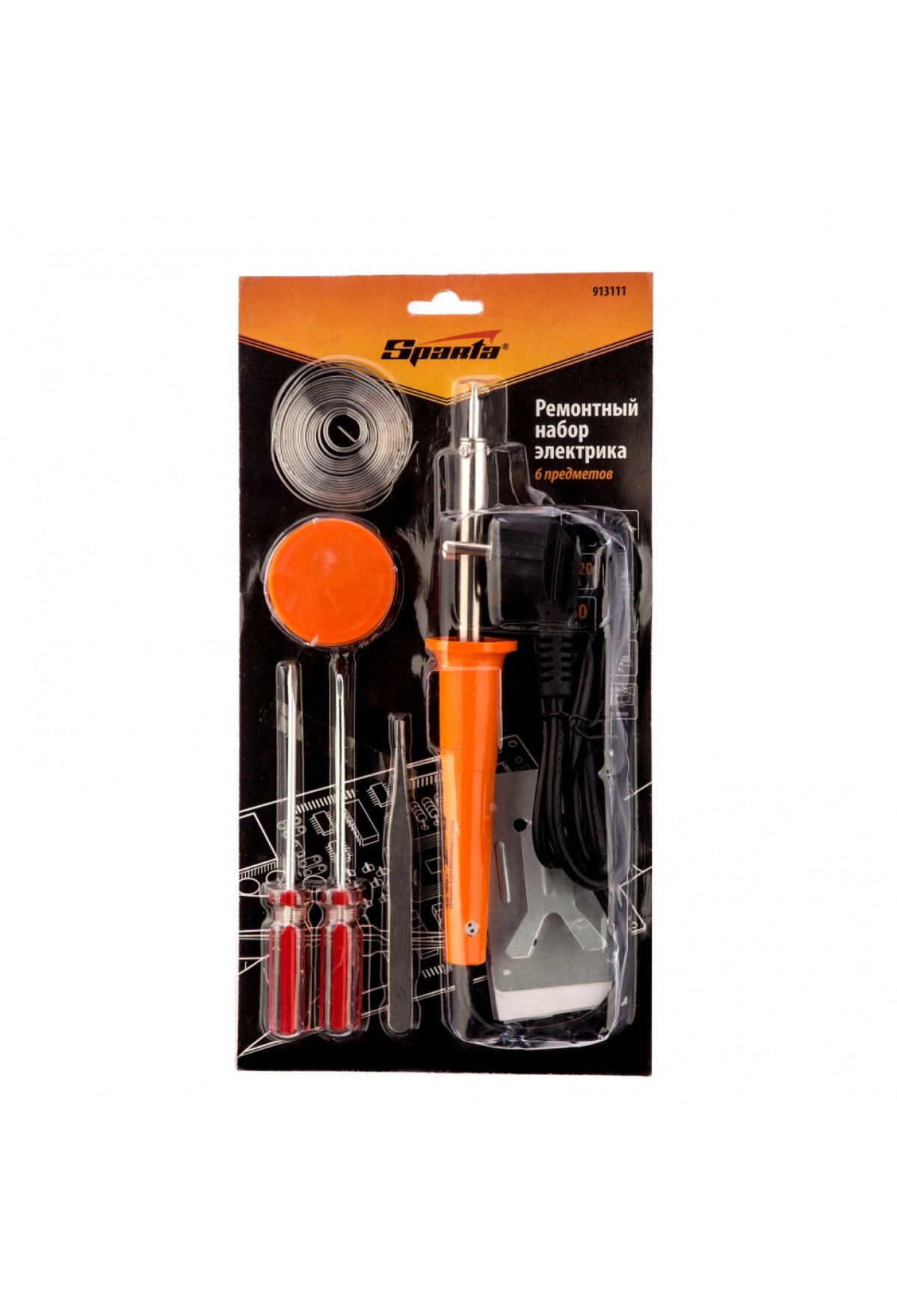 Ремонтный набор электрика Sparta 913111 включает 7 предметов, позволяющих незамедлительно приступить к работе, — паяльник мощностью 30 Вт, припой, флюс, две отвертки, пинцет и подставку. Используется для пайки микросхем, транзисторов, проводов и других деталей. Нагревательный элемент паяльника — нихромовая спираль, поэтому прибор устойчив к повреждениям. Благодаря пластиковой рукоятке паяльник весит немного, что удобно для длительной работы. Набор будет полезен для ремонта электротехники в мастерской или дома.