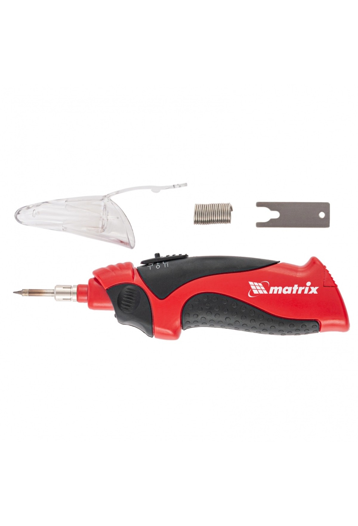 Беспроводной паяльник Matrix 91351 с рабочим напряжением 4,5 В и мощностью 8 Вт, с припоем 10 г и подставкой, работает от 3 элементов питания AA, жало разогревается до 350 °C. Прибор позволяет отремонтировать электротехнику в условиях отсутствия подключения к сети 220 В. Необходимый для этого припой входит в комплект поставки. Медное жало быстро нагревается, а защитное покрытие препятствует его обгоранию. Нихромовая спираль устойчива к повреждениям, что обеспечивает надежность прибора.