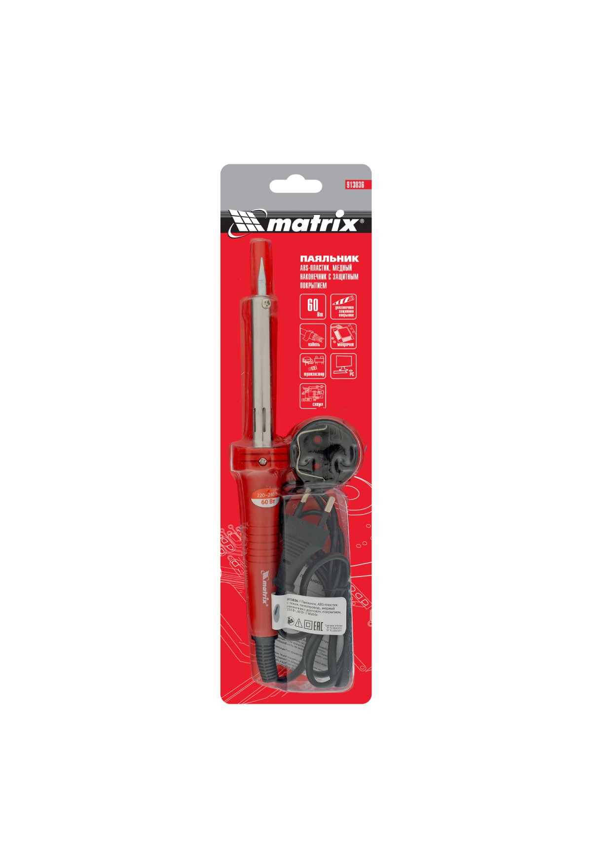 Паяльник Matrix 913036 мощностью 60 Вт используется для пайки транзисторов, микрочипов, электросхем и проводов. В качестве нагревательного элемента использована нихромовая спираль, что снижает риск поломки в случае падения или удара. Конусовидное жало оптимально для проведения точной пайки. Гальваническое покрытие защищает наконечник от внешних воздействий, что продлевает срок службы инструмента. Паяльник пригодится радиолюбителям и домашним мастерам.
