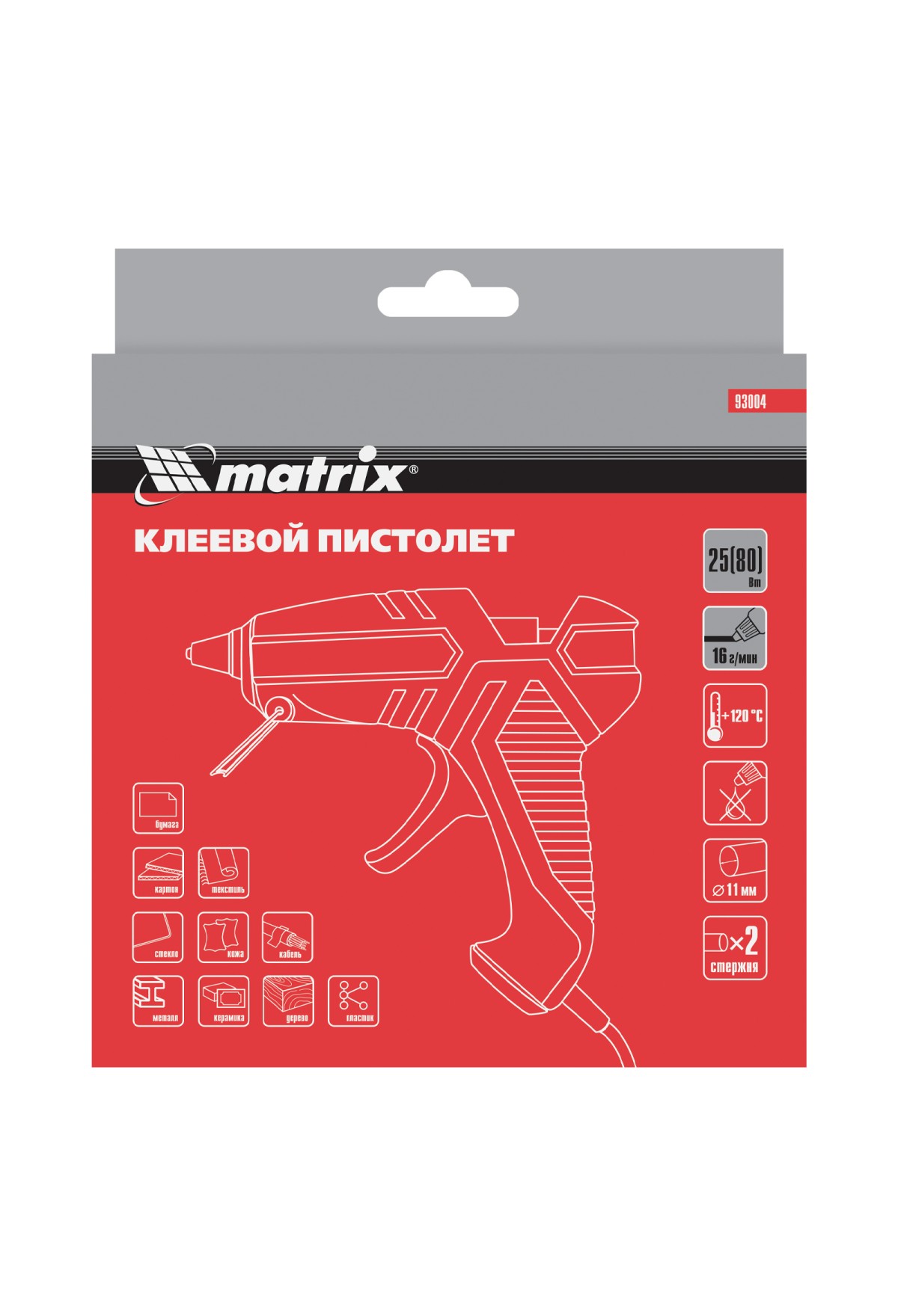 Клеевой пистолет Matrix 93004 потребляет мощность до 80 Вт, расходует 16 г клея в минуту и совместим со стержнями диаметром 11 мм. Позволяет склеивать бумагу, картон, текстиль, кожу, пластик и другие материалы. Время нагрева до рабочей температуры 120 °C — не более 6 минут, что позволяет быстрее приступить к работе. Инструмент используется для бытовых и полупрофессиональных нужд: выполнения мелкого ремонта, упаковки товаров, фиксации деталей, изготовления игрушек и объемных украшений, декорирования и т.д. Инструмент пригодится отделочникам, моделистам и тем, кто занимается хенд-мейдом.