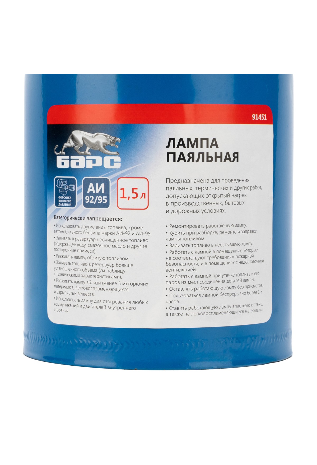 Паяльная лампа Барс 91451 с объемом бака 1,5 л предназначена для нагрева поверхностей при помощи открытого направленного пламени. Полной заправки 1,1 л топлива хватает почти на час работы при расходе 1,2 л/ч. Устройство используется для выполнения ремонтных и демонтажных работ — для пайки, термообработки деталей, установки термоусадочных трубок, снятия лакокрасочного покрытия. Также лампа будет полезна в сельском хозяйстве и в быту.