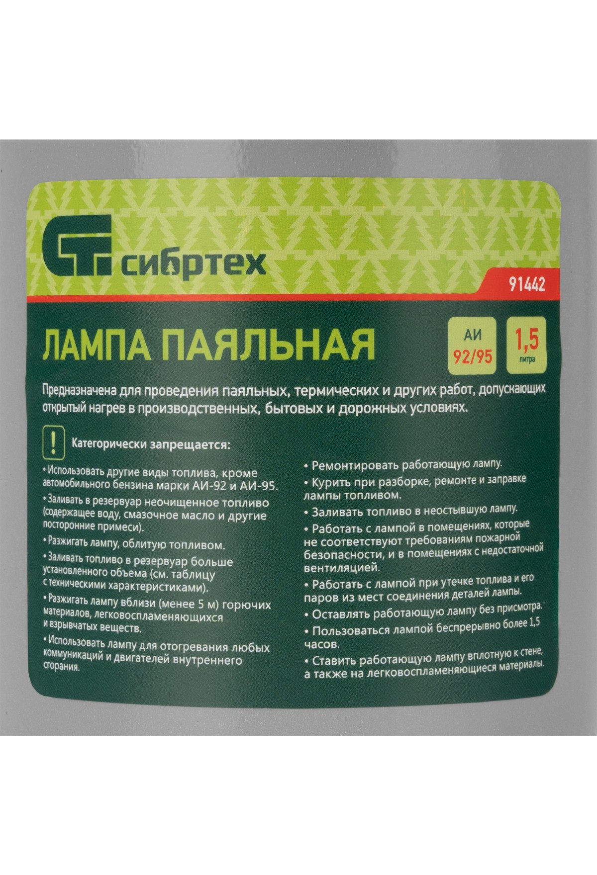 Паяльная лампа Сибртех 91442 с баком объемом 1,5 л используется для нагрева поверхностей. Применяется для выполнения монтажных и демонтажных работ, полезна также и для решения бытовых задач. Паяльной лампой можно разогревать жало паяльника и припой, варить медные трубы, нагревать заржавевшие или замерзшие соединения, снимать лакокрасочные покрытия, устанавливать термоусадочные трубки, а при наличии специальной подставки лампа поможет даже приготовить пищу. Она работает на любом бензине, кроме этилированного, а значит, проблем с заправкой не будет — достаточно заехать на АЗС.