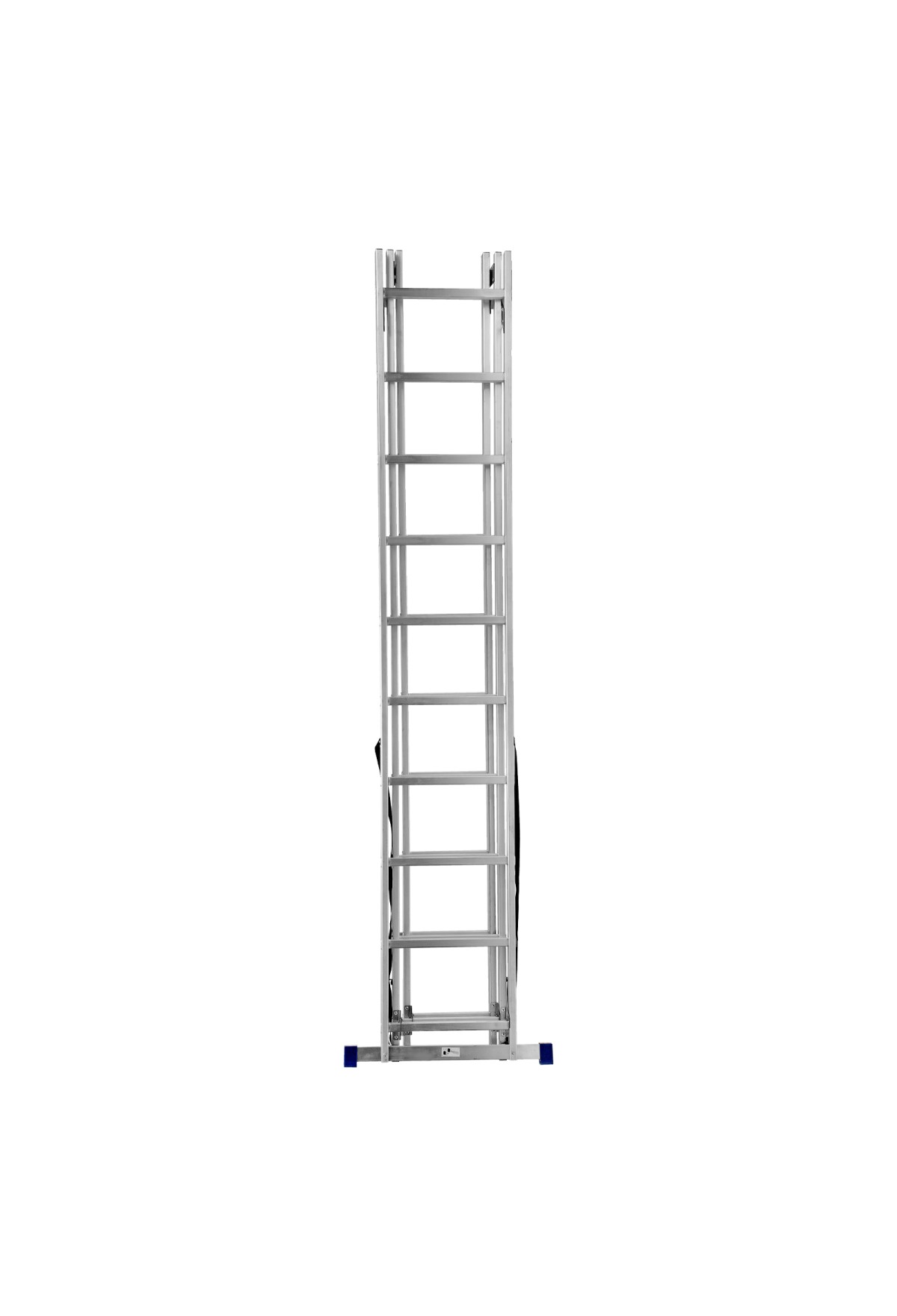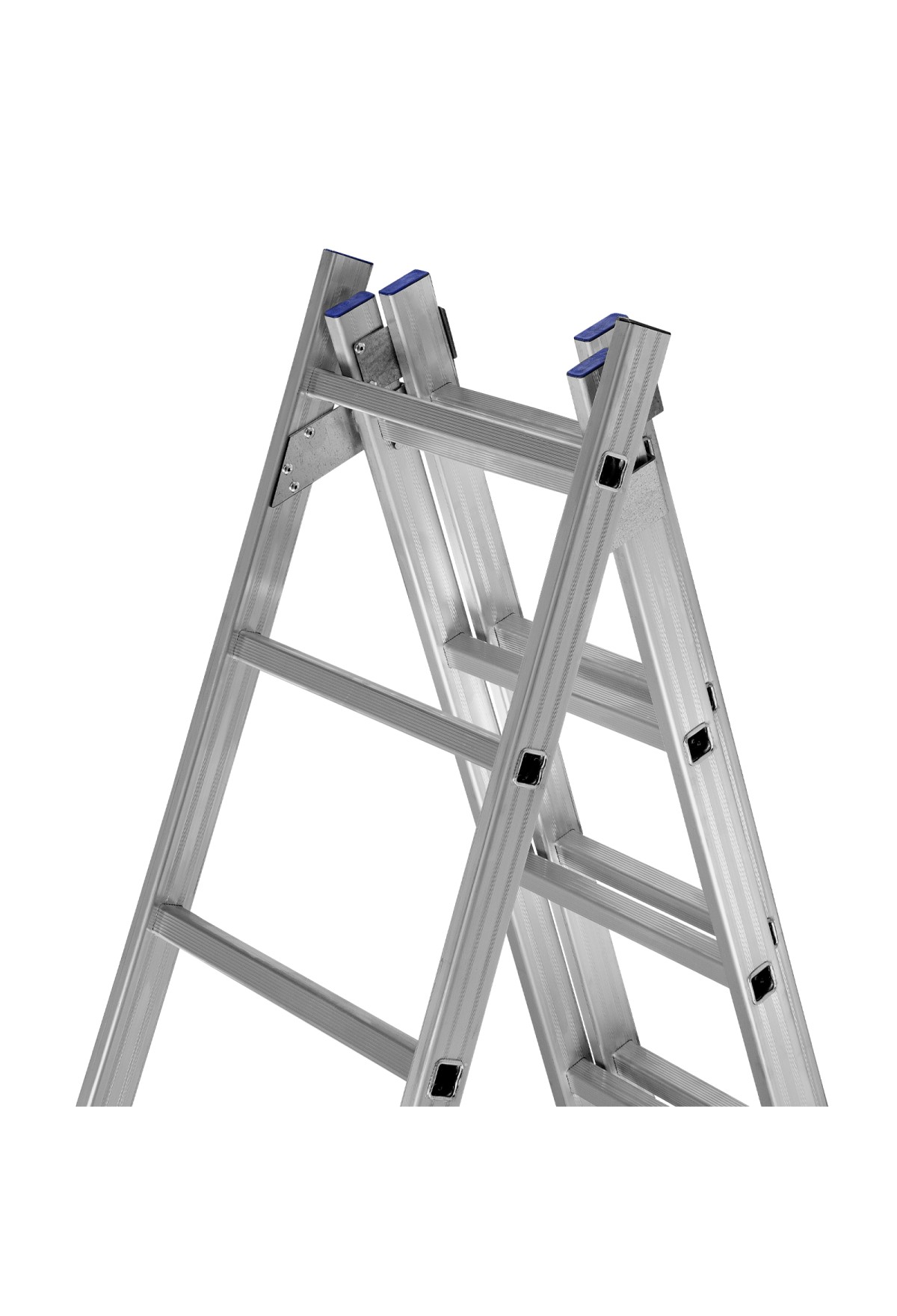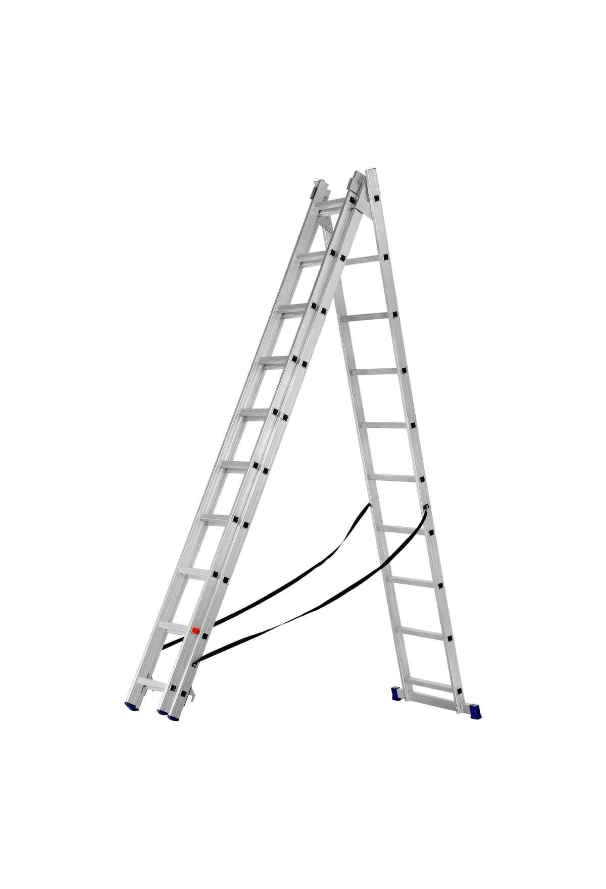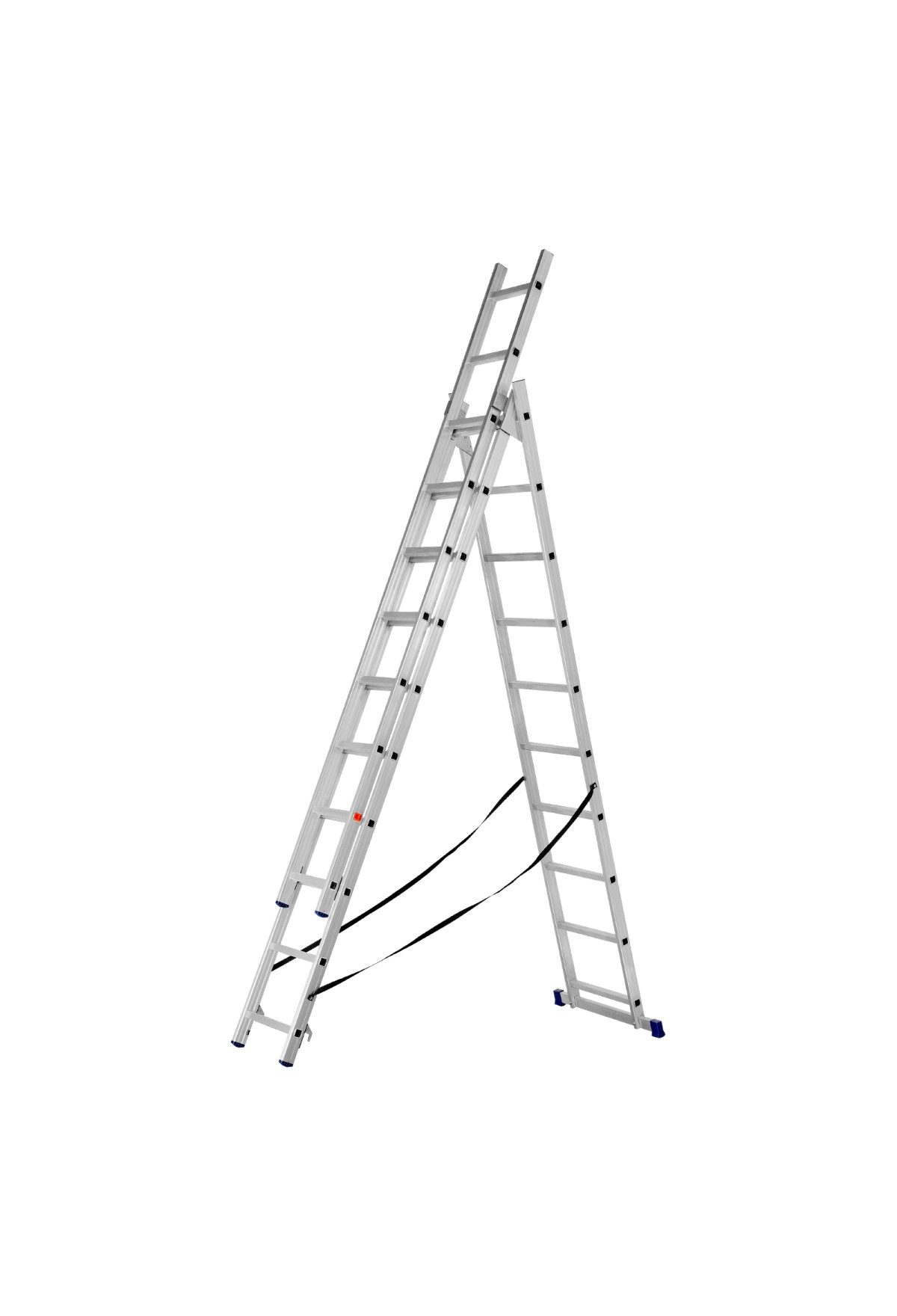 • Многофункциональность — лестница может использоваться в 3-х различных вариациях — в качестве стремянки (с двумя расставленными и одной выдвинутой вверх секцией), двухсторонней стремянки (две секции расставлены, третья демонтирована) и приставной лестницы.