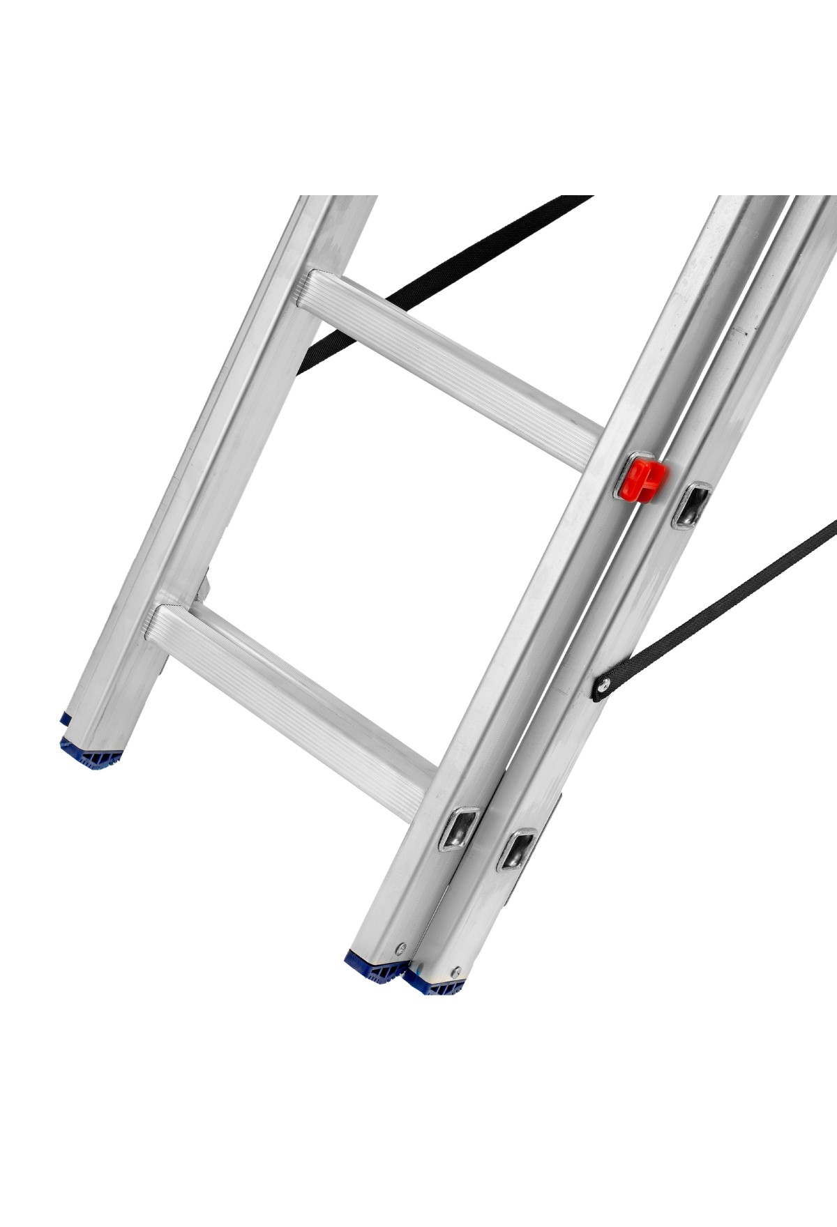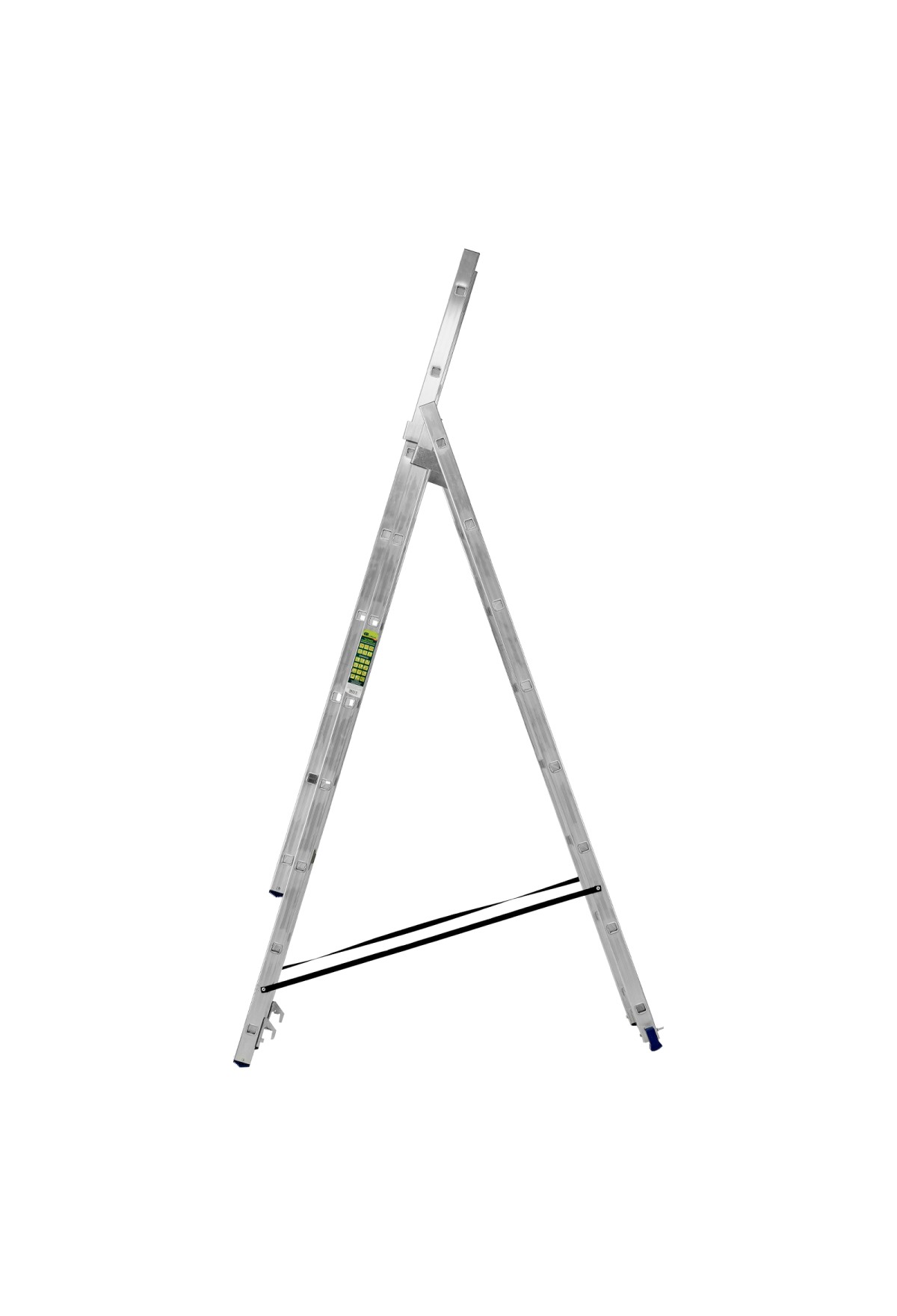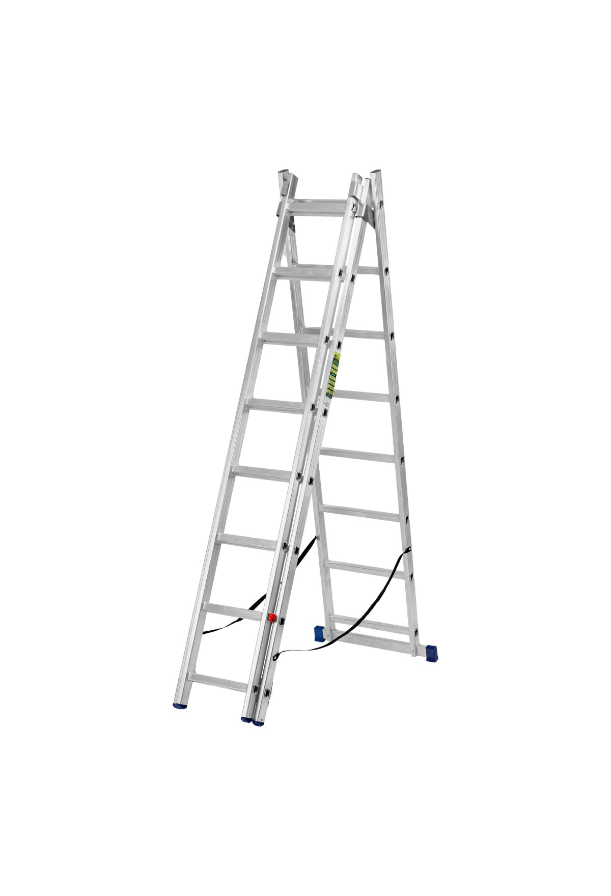 • Многофункциональность — лестница может использоваться в 3-х различных вариациях — в качестве стремянки (с двумя расставленными и одной выдвинутой вверх секцией), двухсторонней стремянки (две секции расставлены, третья демонтирована) и приставной лестницы.
