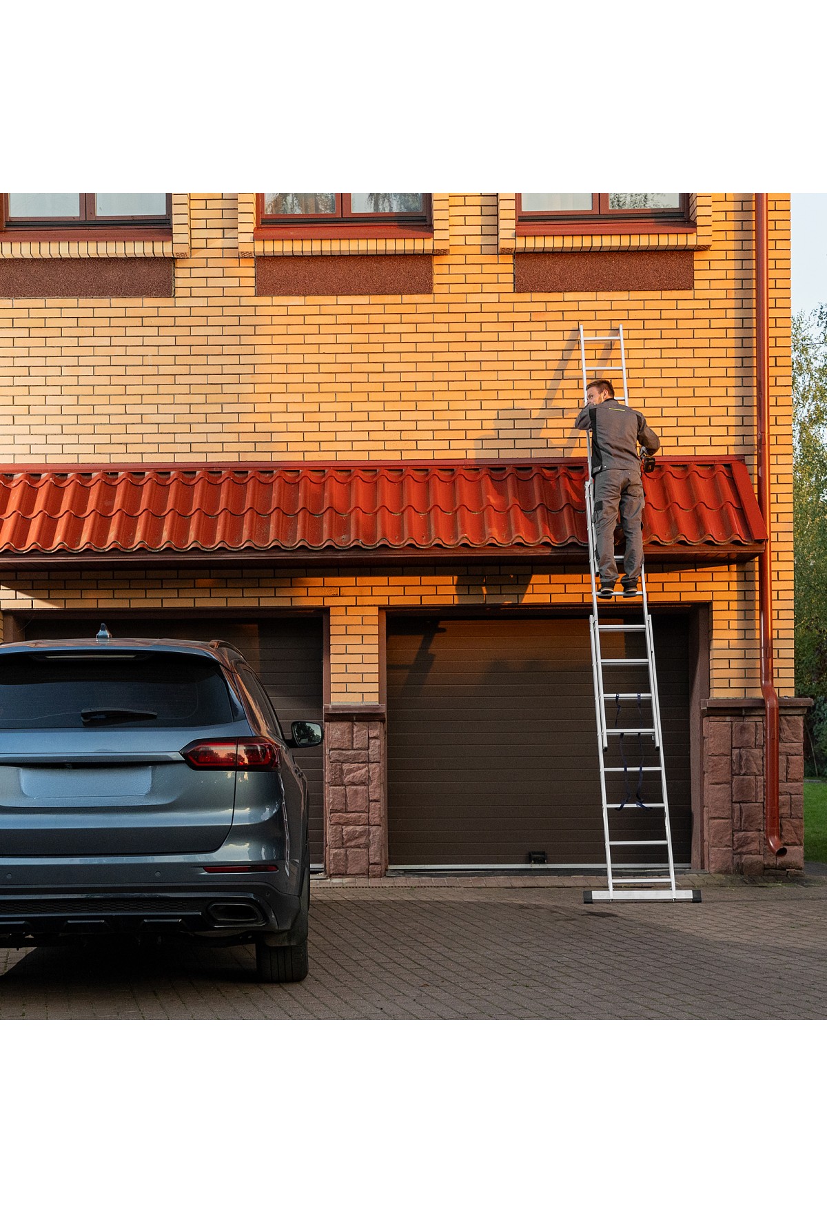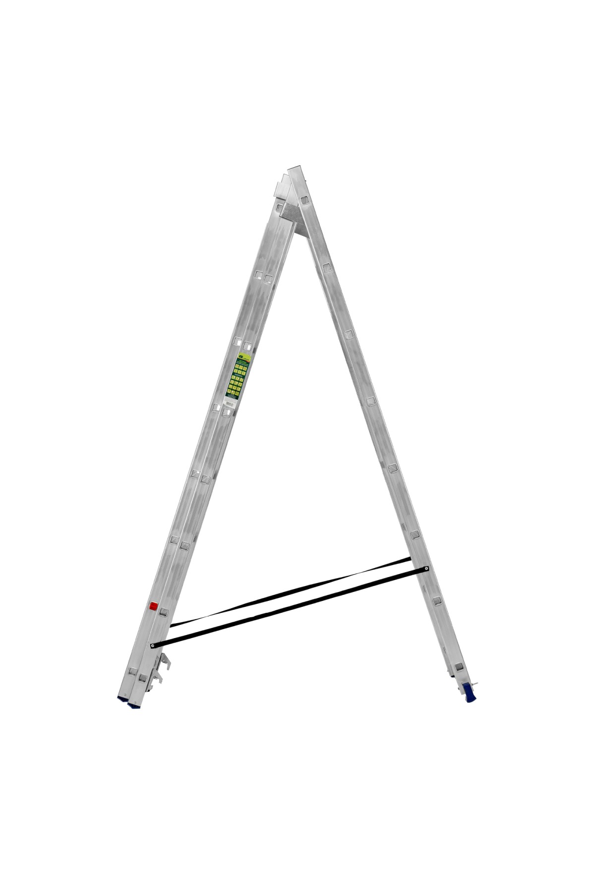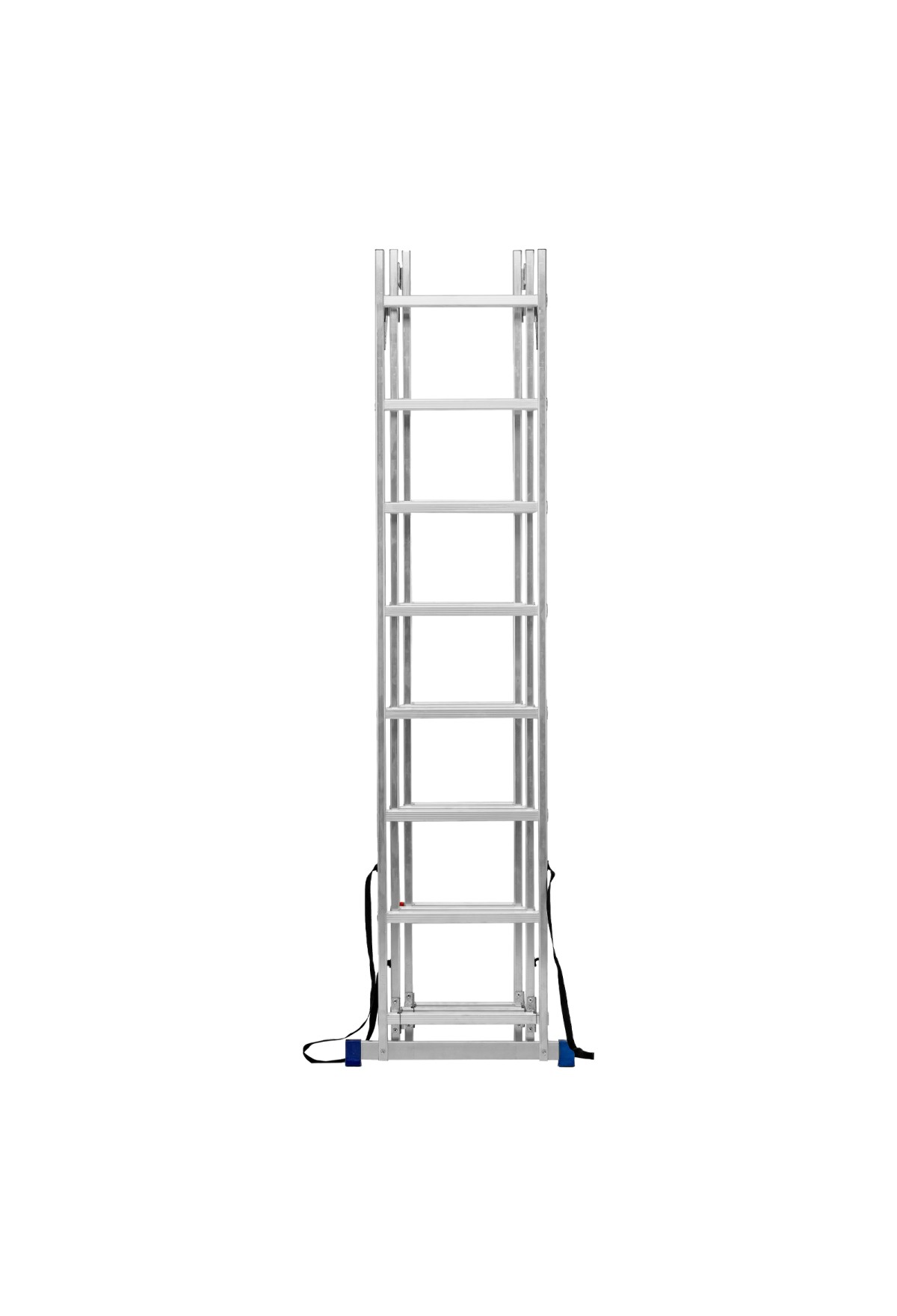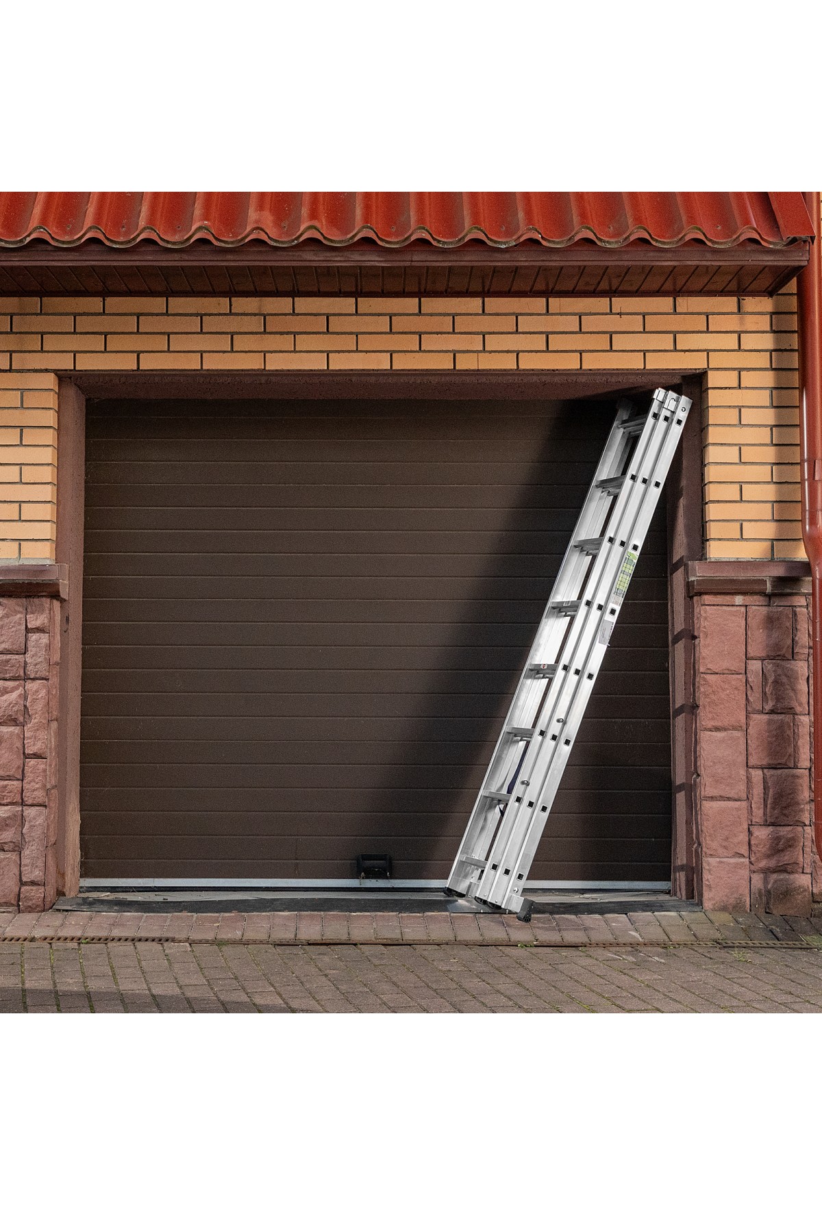 • Многофункциональность — лестница может использоваться в 3-х различных вариациях — в качестве стремянки (с двумя расставленными и одной выдвинутой вверх секцией), двухсторонней стремянки (две секции расставлены, третья демонтирована) и приставной лестницы.
