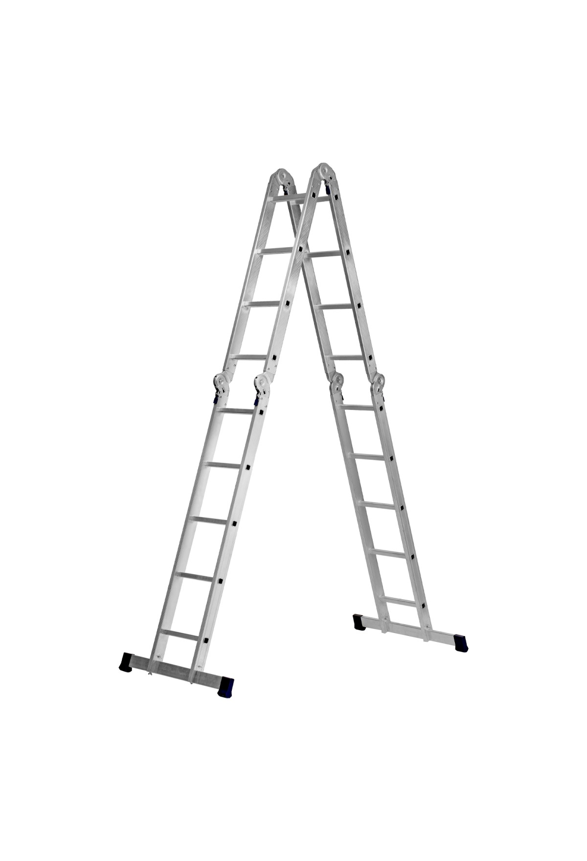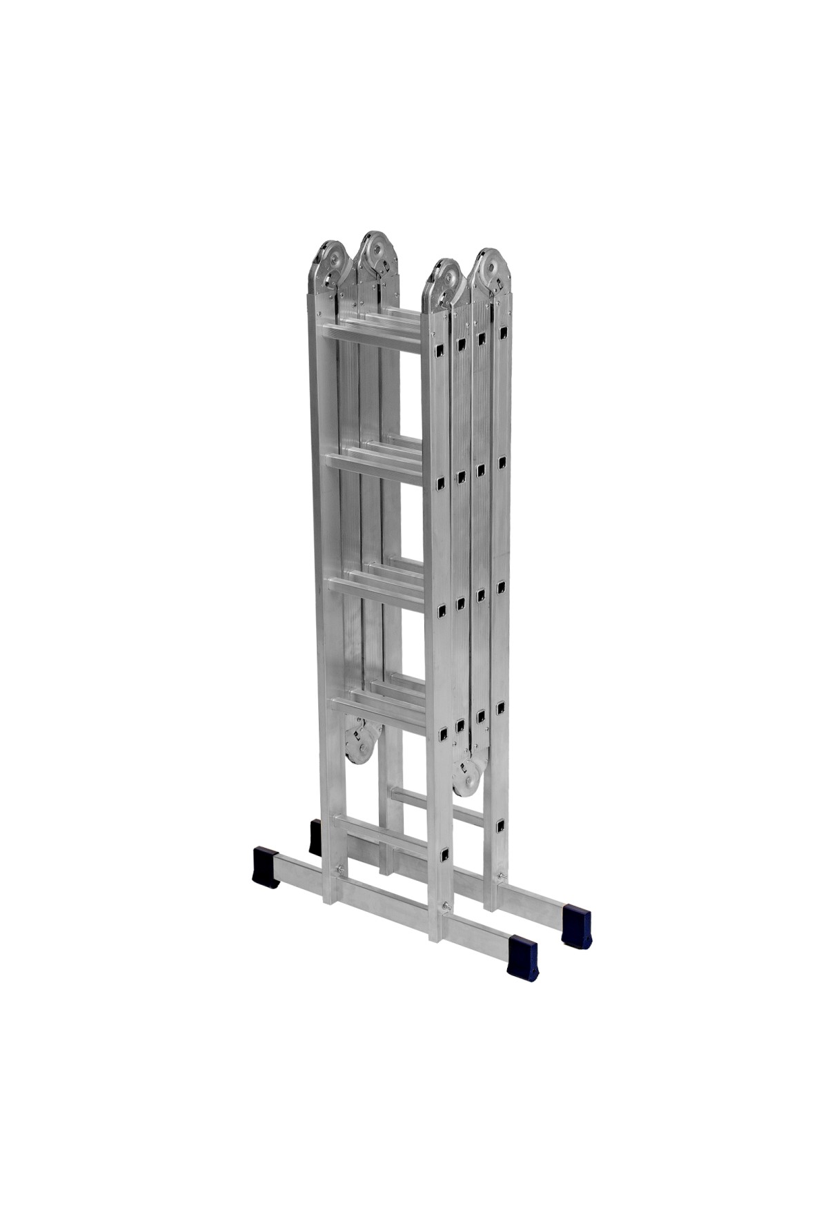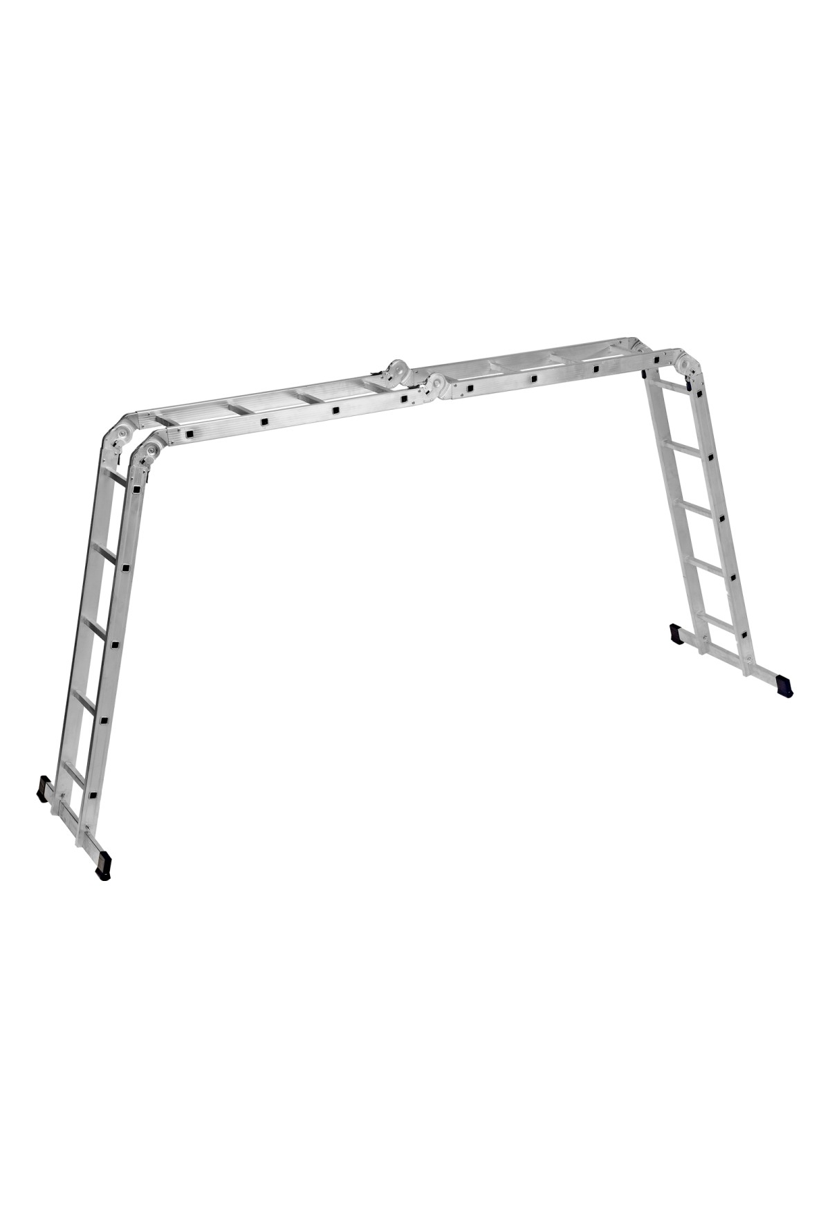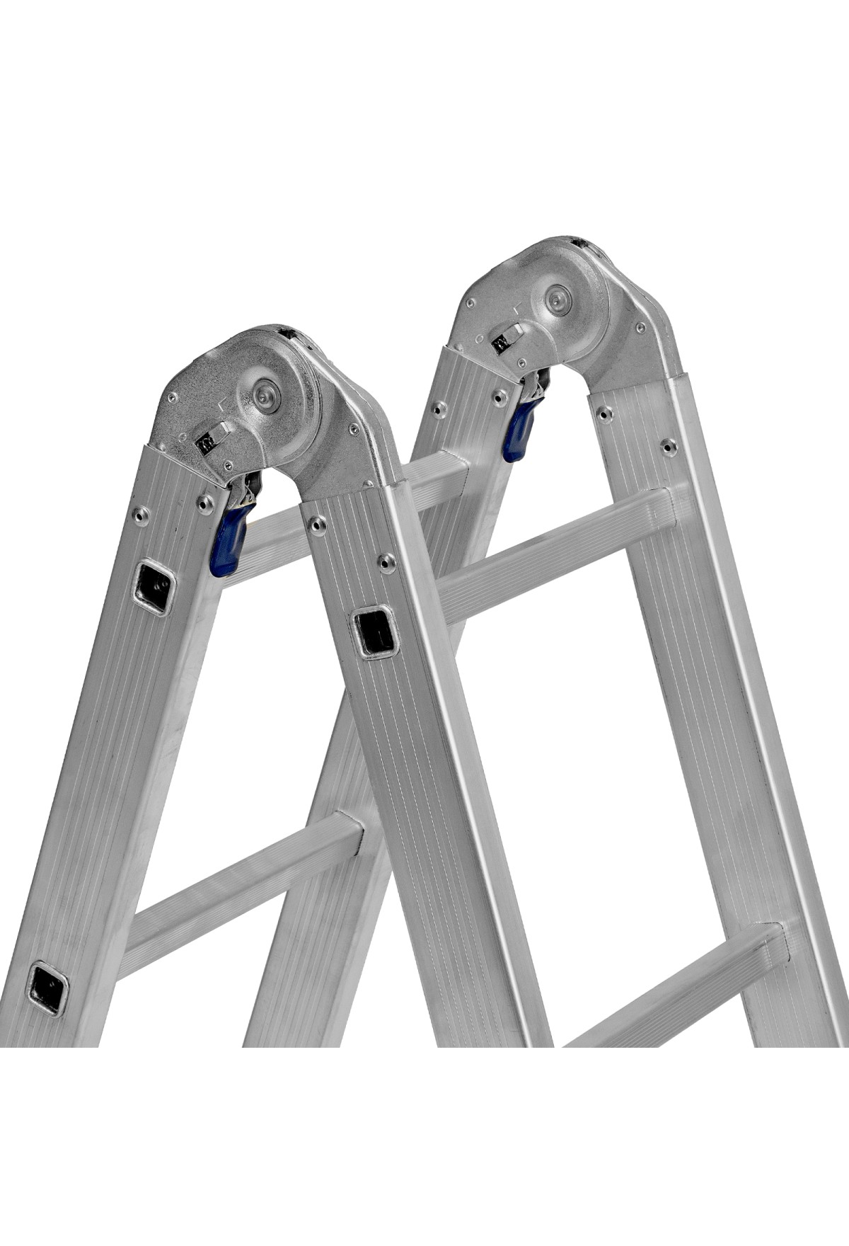 Шарнирная алюминиевая лестница Сибртех 97884 представляет собой 2 секции по 4 ступени и 2 секции по 5 ступеней, которые можно настроить в нескольких рабочих положениях. Она может использоваться в качестве приставной лестницы, двухсторонней стремянки и помоста. Будет полезна как в быту, так и на небольших стройках, в гараже и магазинах.