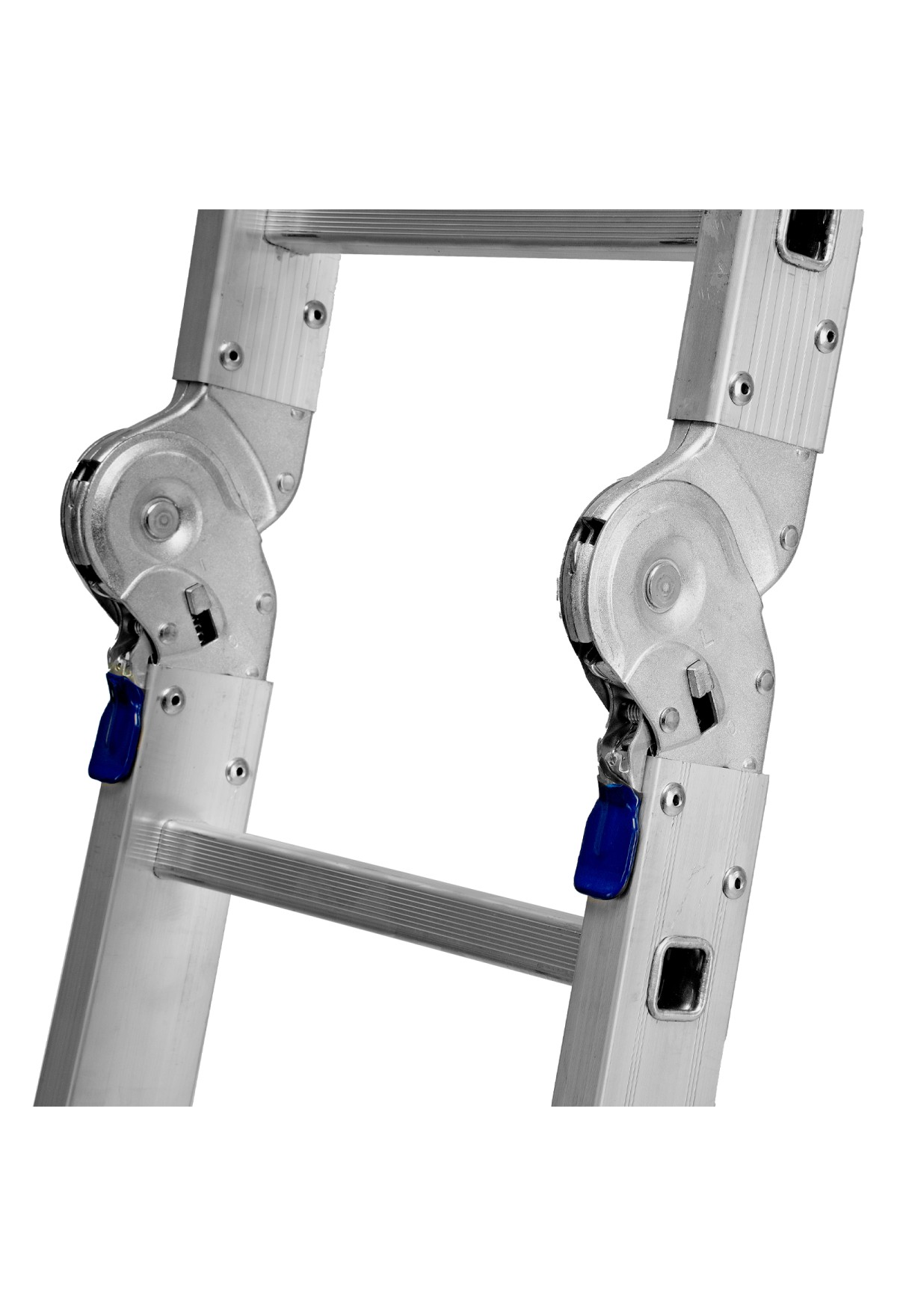 • Надежные шарнирные механизмы — лестница не шатается в рабочих положениях, смена рабочих положений происходит быстро и легко.