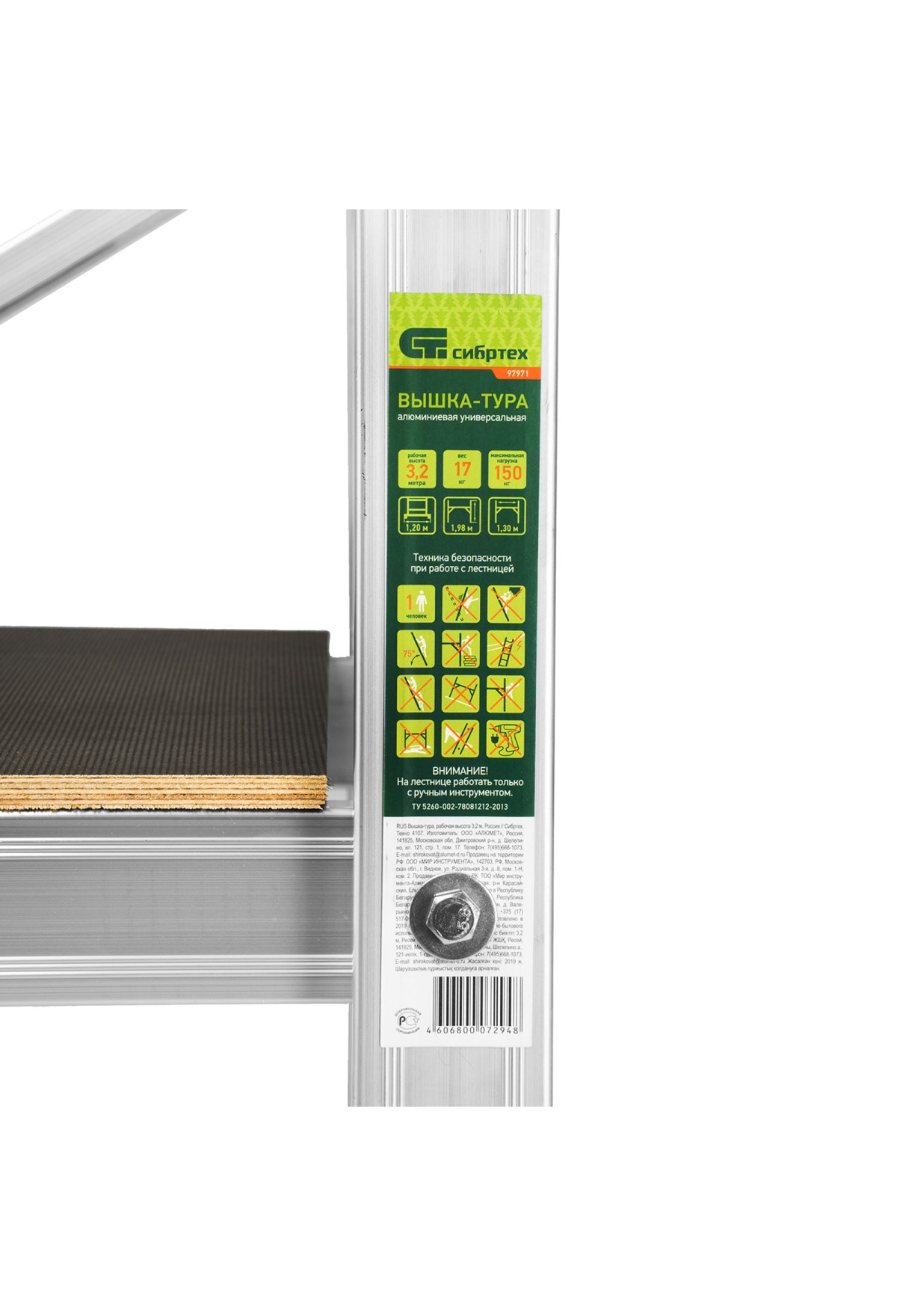 Вышка-тура 97971 используется для проведения строительных, ремонтных, отделочных и монтажных работ на высоте до 3,2 м. Грузоподъемность конструкции 150 кг — на площадке мастер может расположиться сам и разместить необходимые инструменты и материалы. Вышка быстро собирается и устанавливается, а благодаря колесам ее легко можно переместить в нужное место.
