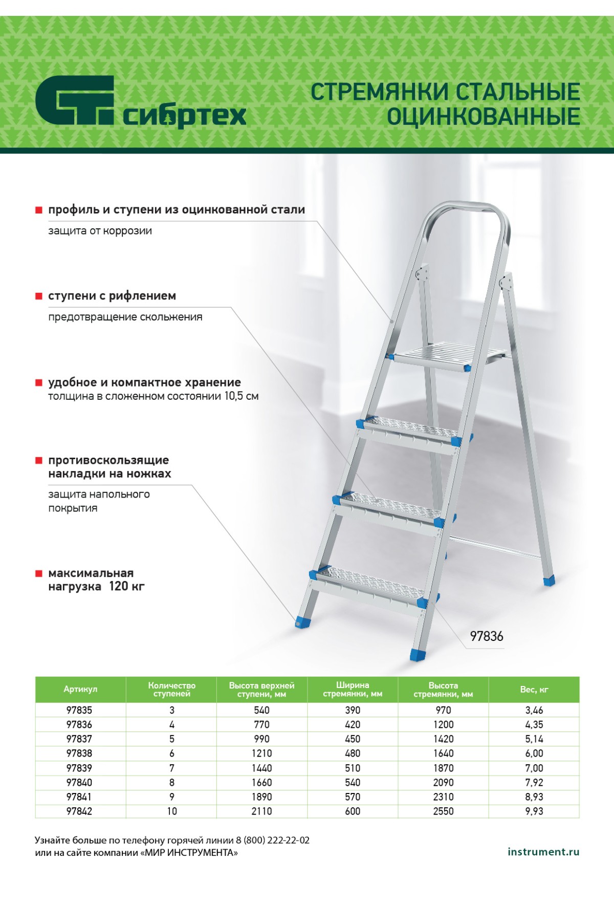 Стальная оцинкованная стремянка Сибртех 97842 с 10 ступенями позволяет выполнять ремонтные и садовые работы, для которых требуется доступ к предметам на высоте. Рама и ступени из стального профиля выдерживают вес до 120 кг. Расстояние от опорной поверхности до площадки составляет 211 см, при среднем росте пользователя 170 см рабочая высота лестницы — 411 см. Необходимо соблюдать технику безопасности: размещать стремянку только на ровной плоскости и не использовать ее для работы с дрелью, шуруповертом и другим электроинструментом.
