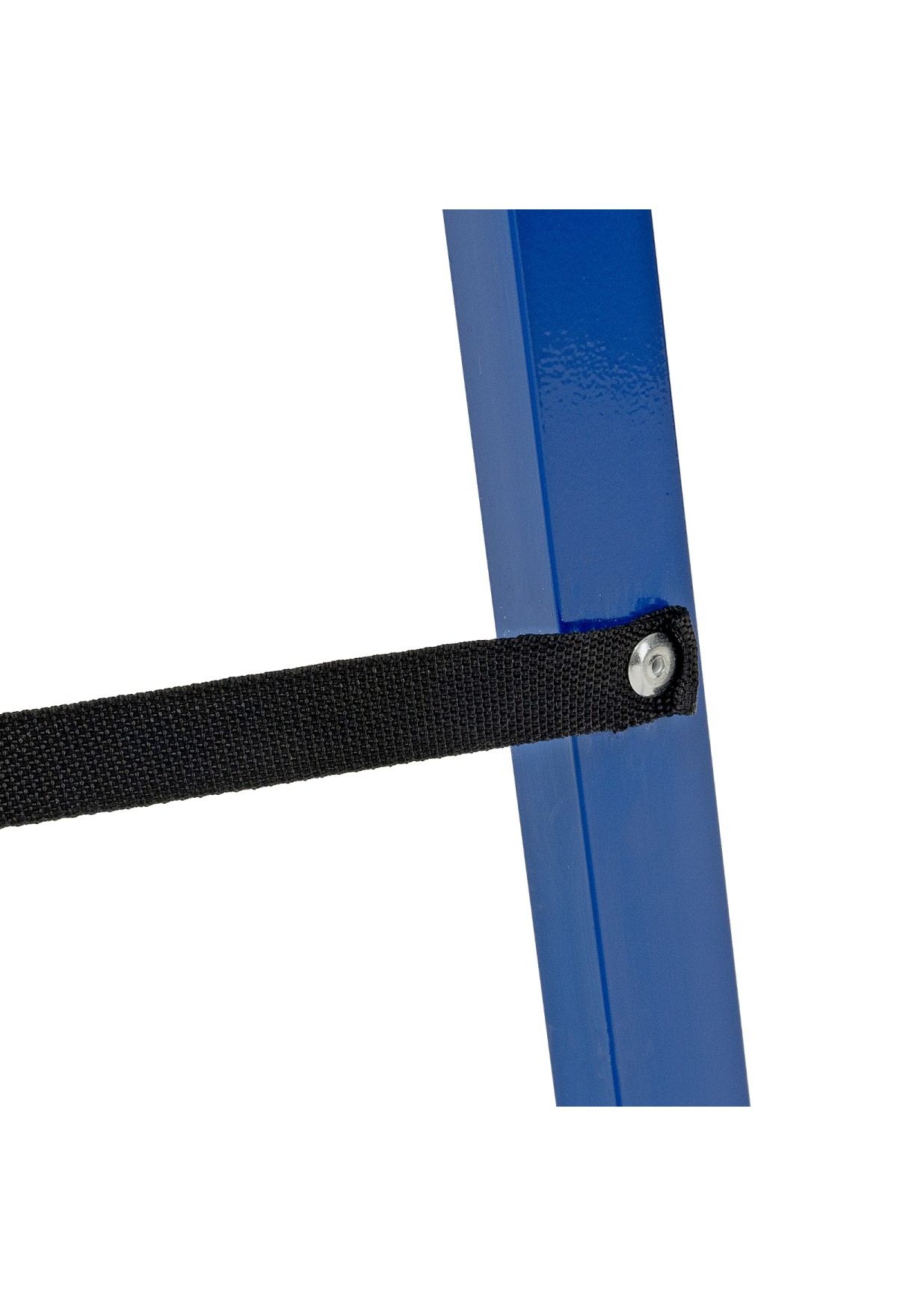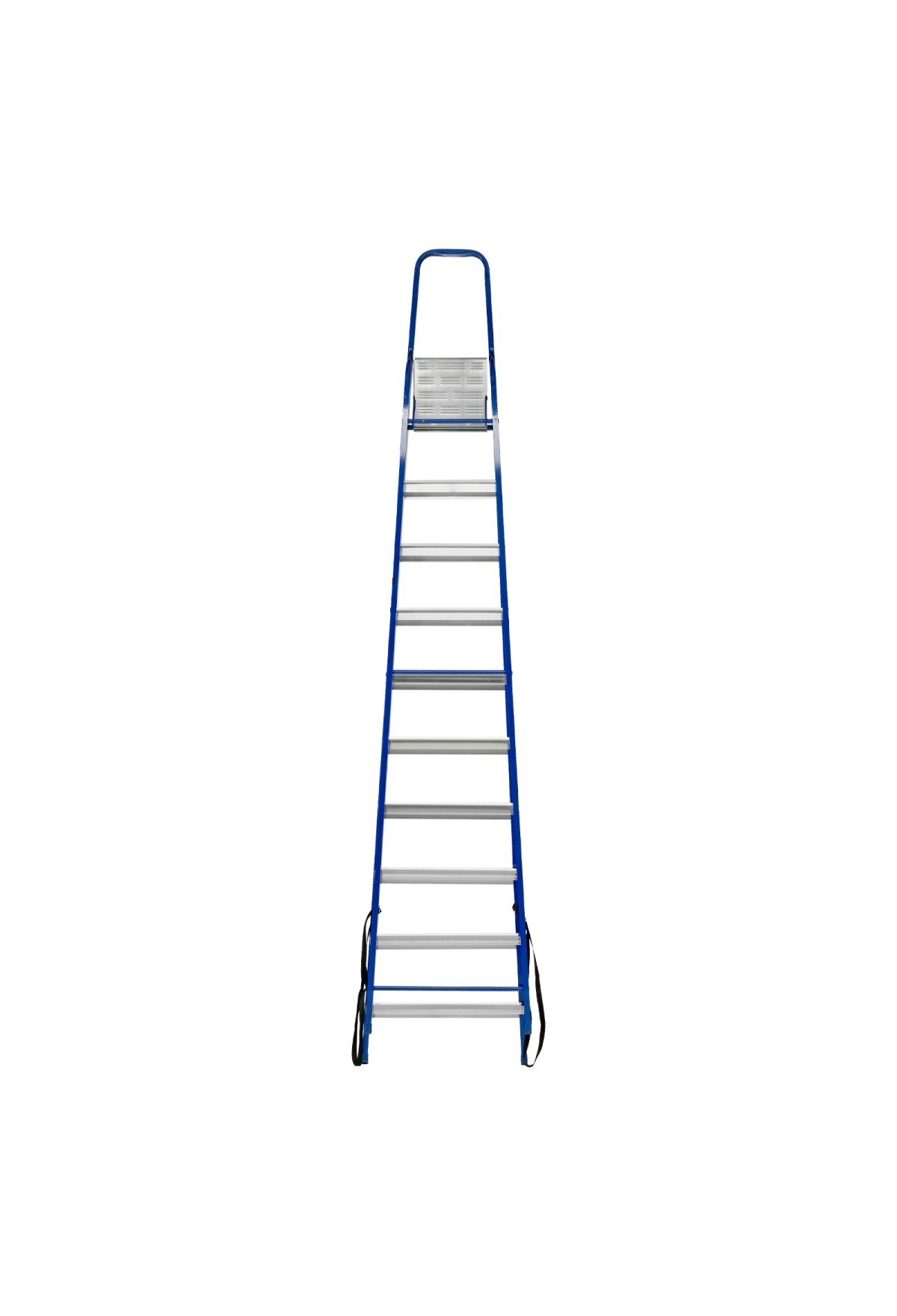 - Надежность — рама изготовлена из профилированной стали, стальная верхняя площадка с зацепами прочно фиксирует стремянку в рабочем положении, страховочные ленты придают дополнительную прочность конструкции.