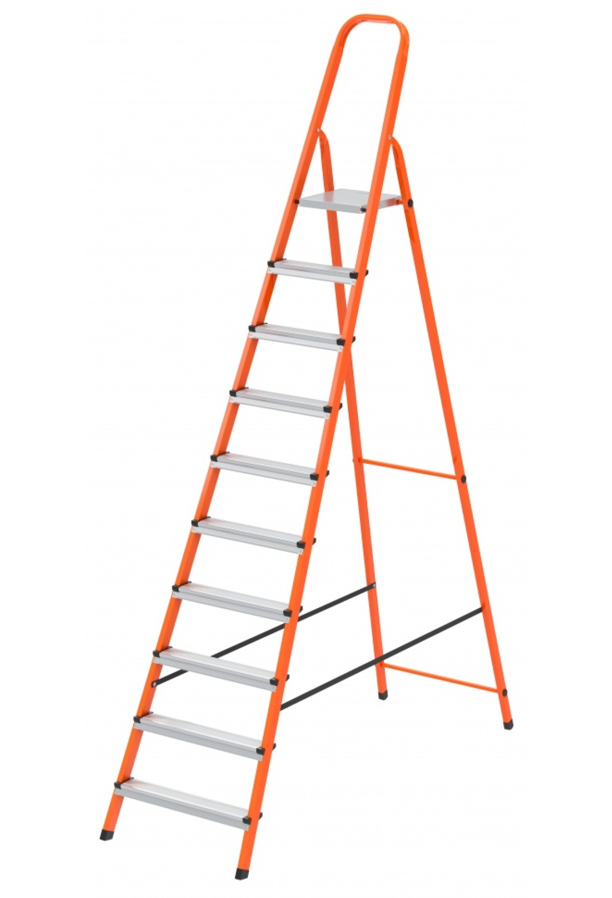 Стремянка оранжевая Сибртех 97973 со стальным профилем и 10 ступенями из стали используется, чтобы достать нужный предмет с антресолей или высокой полки, вытереть пыль на шкафу, заменить лампочку в люстре, а также решить другие бытовые вопросы. Также будет полезна для выполнения малярных и монтажных работ. Лестница рассчитана на нагрузку до 150 кг. Площадка находится на высоте 206 см от опорной поверхности, рабочая высота стремянки составляет 406 см (при среднем росте пользователя 170 см). Стремянка имеет широкое основание и характеризуется устойчивостью.