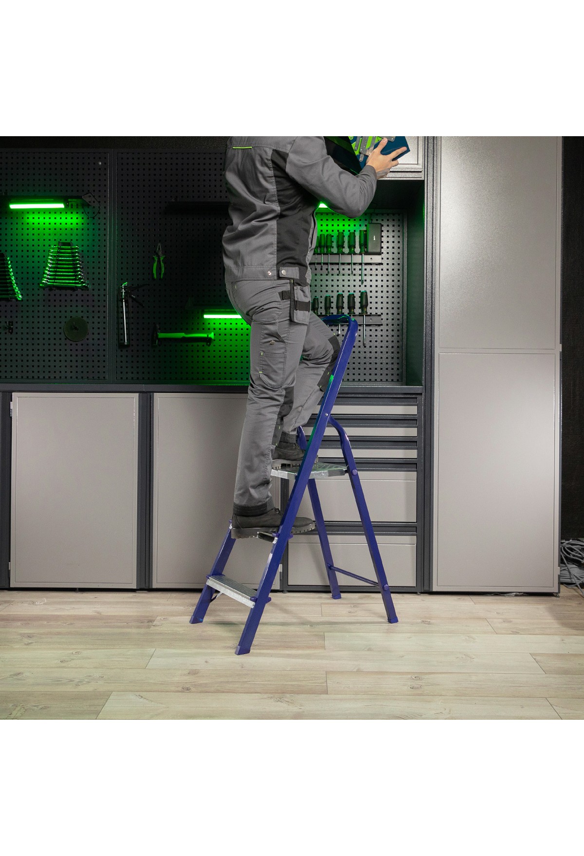 • Удобное хранение — размеры стремянки в сложенном состоянии составляют 1310 х 400 х 105 мм.