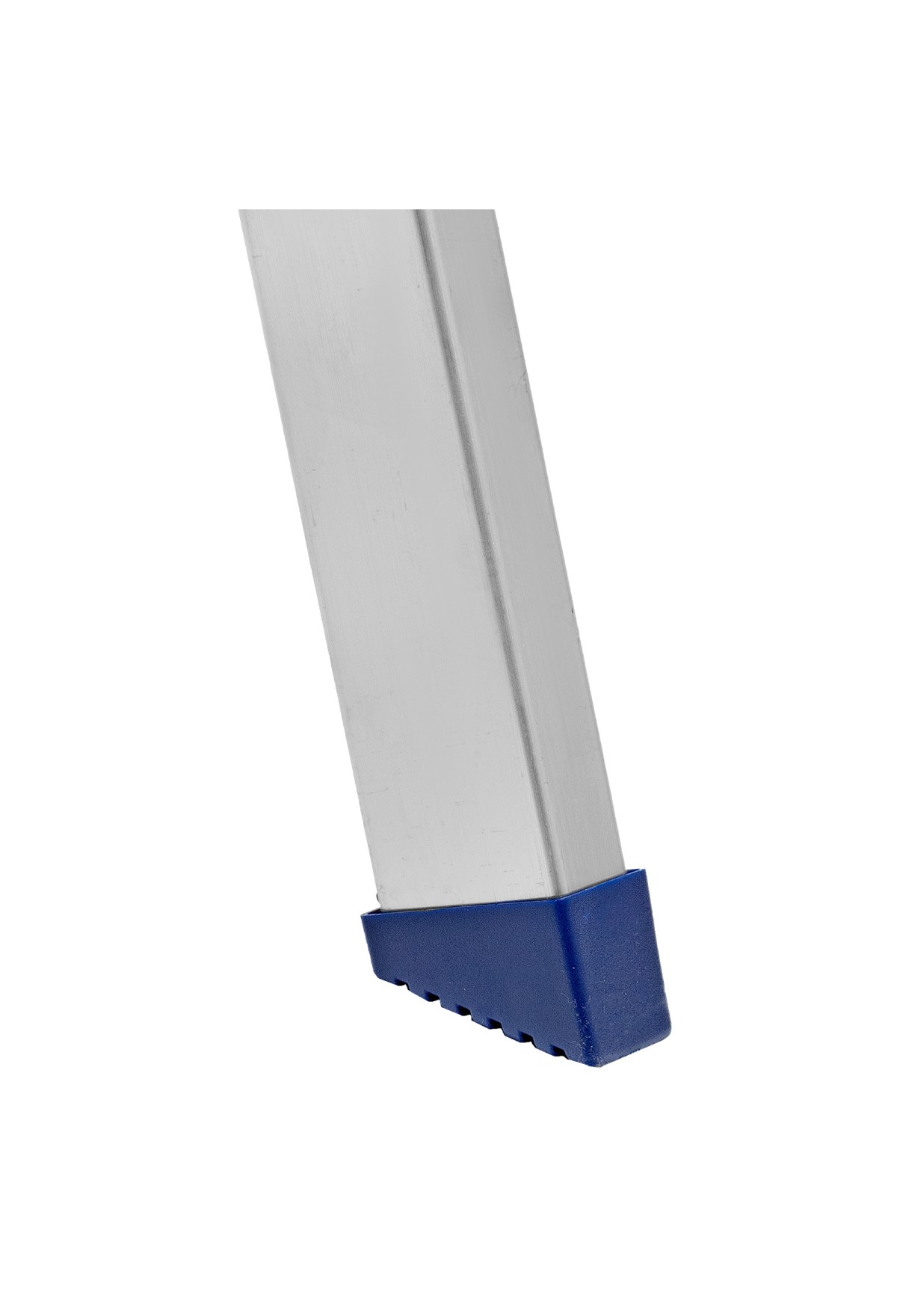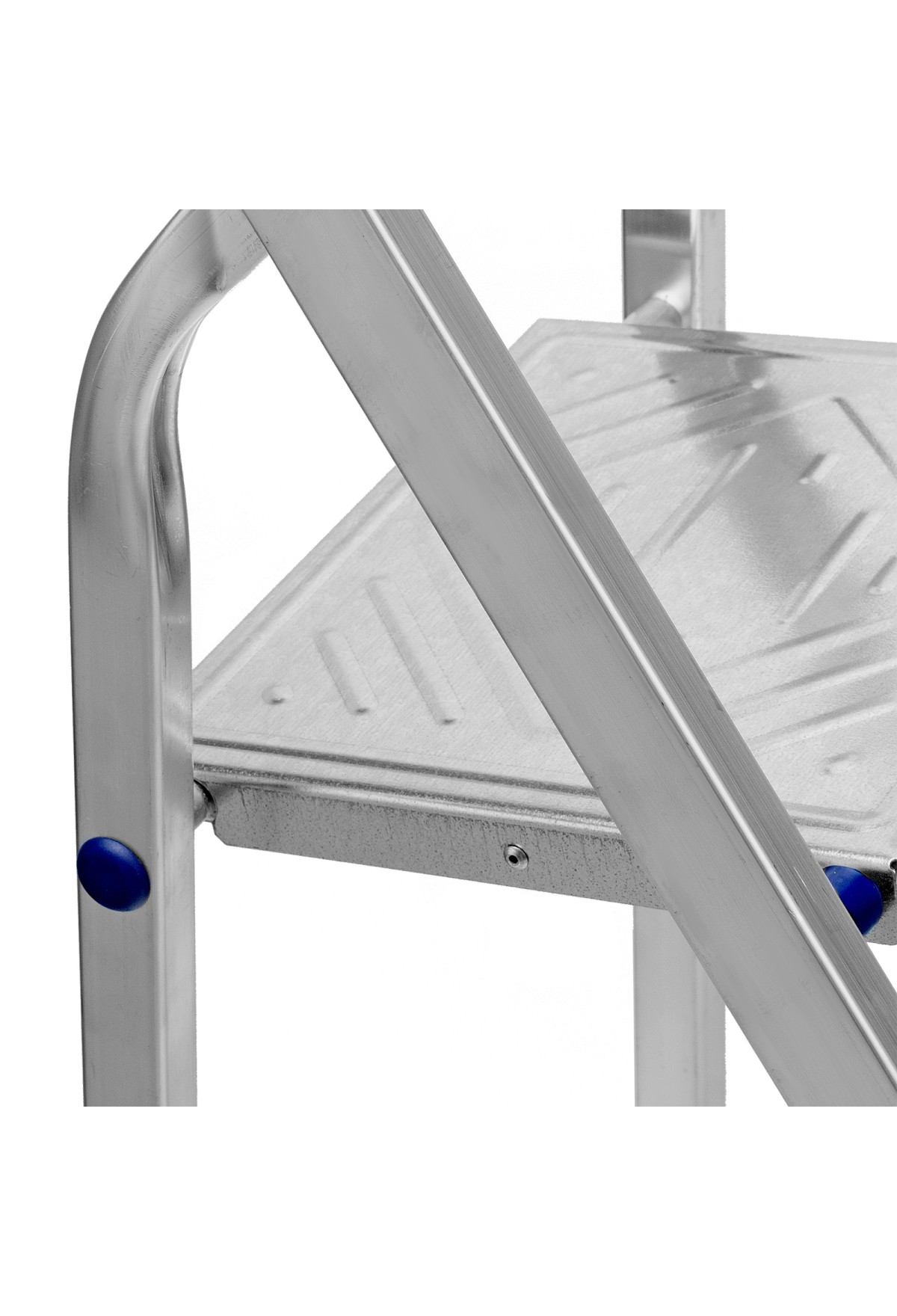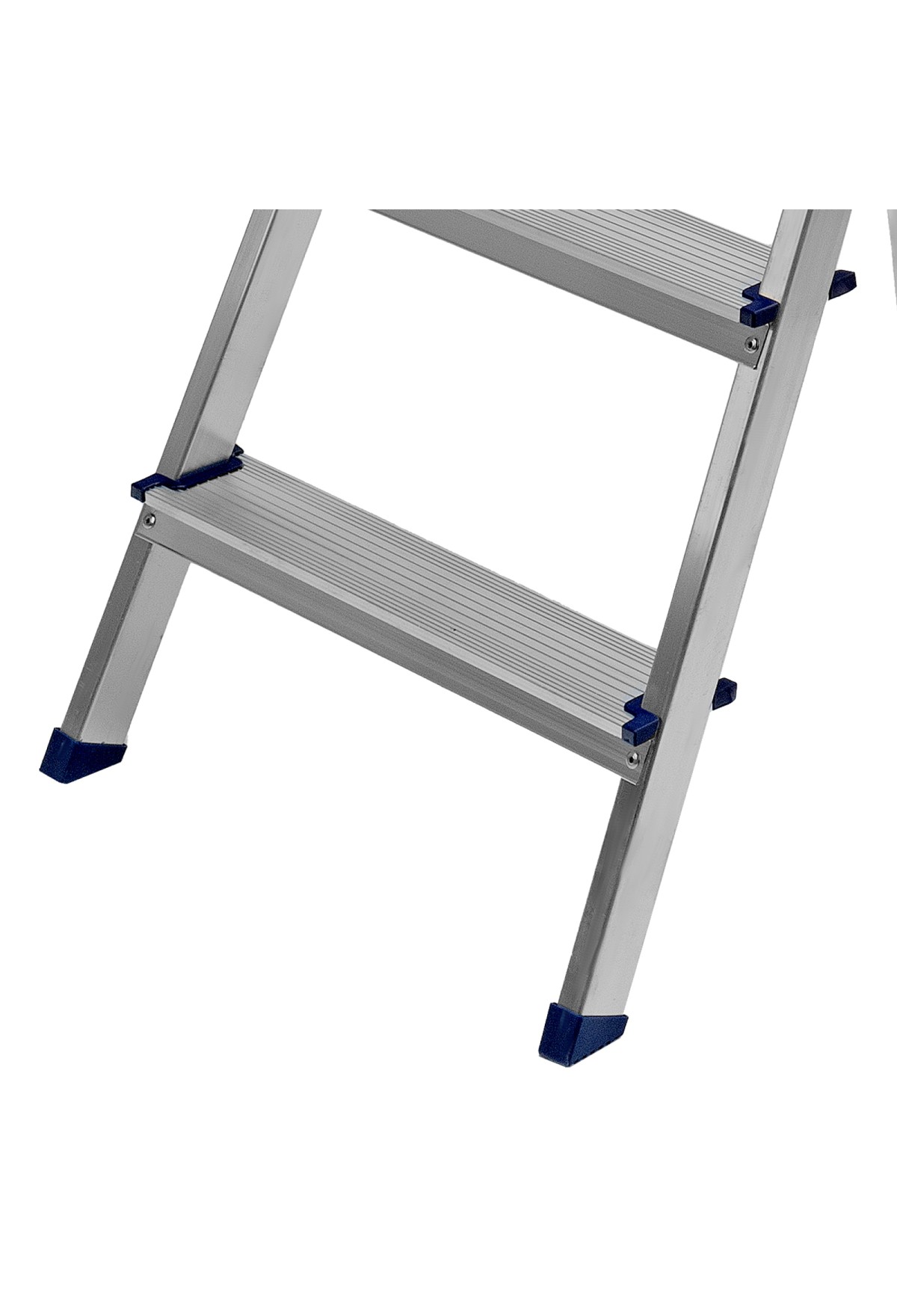 • Надежность — рама из прямоугольного алюминиевого профиля выдерживает нагрузку до 150 кг, широкие ступени закреплены заклепками.
