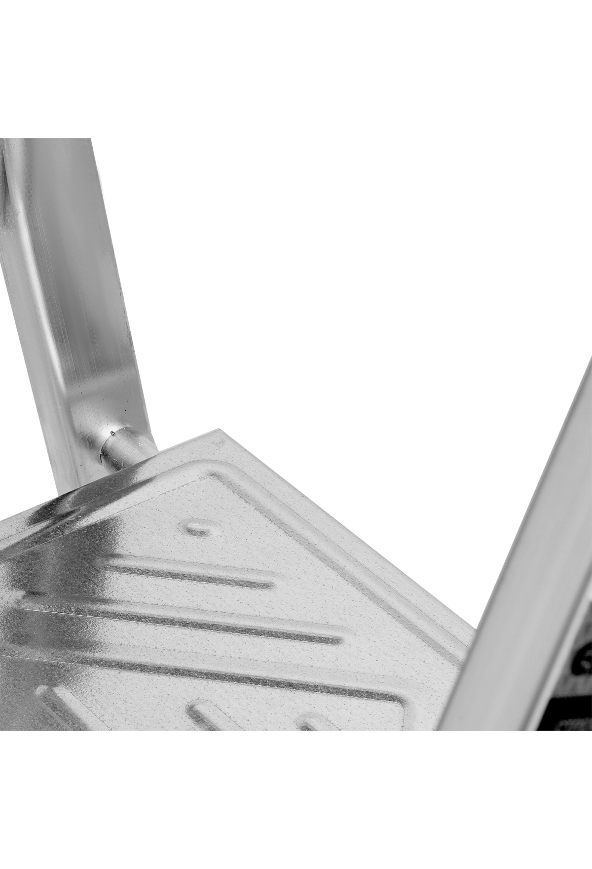 • Продуманная конструкция — стальная рабочая площадка с зацепами надежно фиксирует стремянку в разложенном положении.