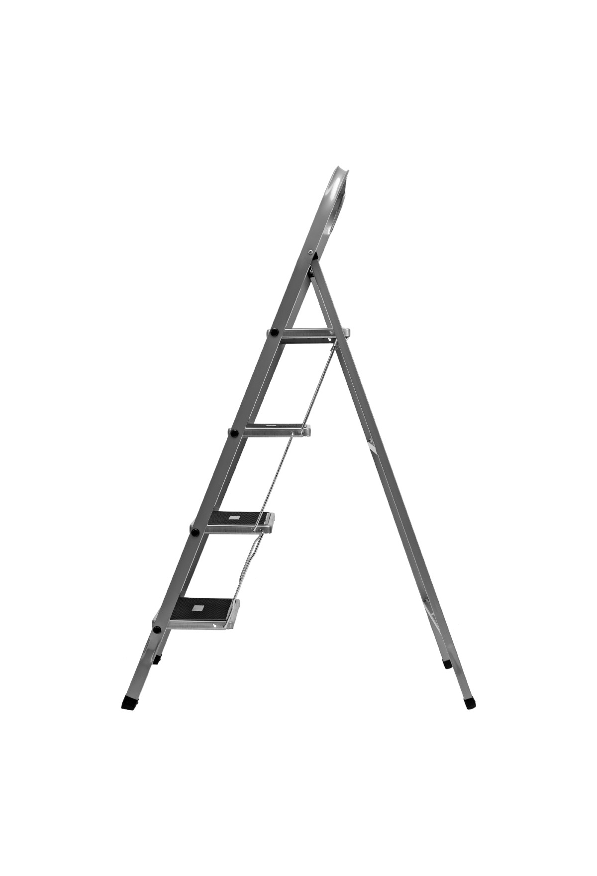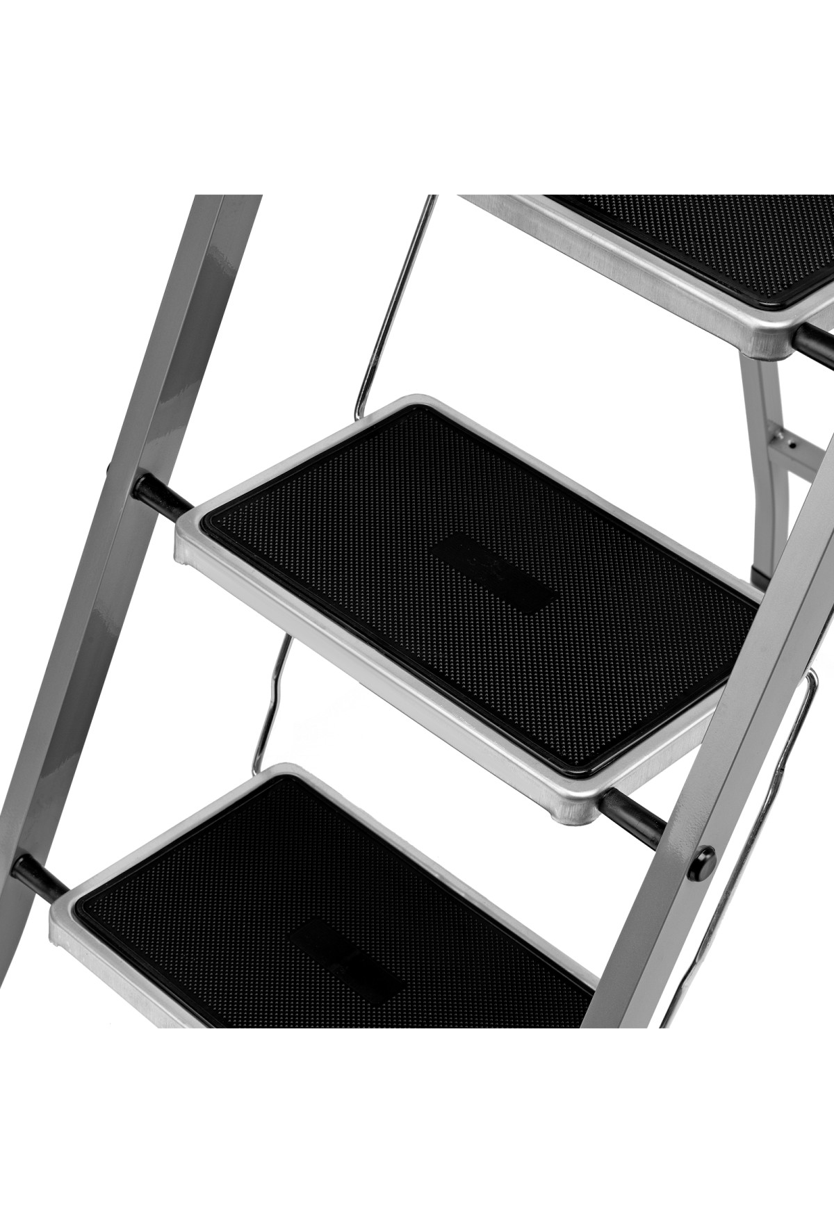 - Прочность — рама и ступени изготовлены из стали, поэтому стремянка выдерживает нагрузку 120 кг.