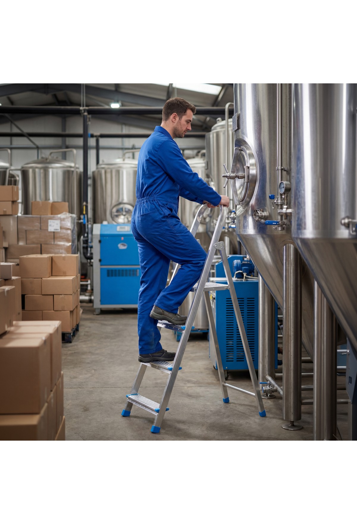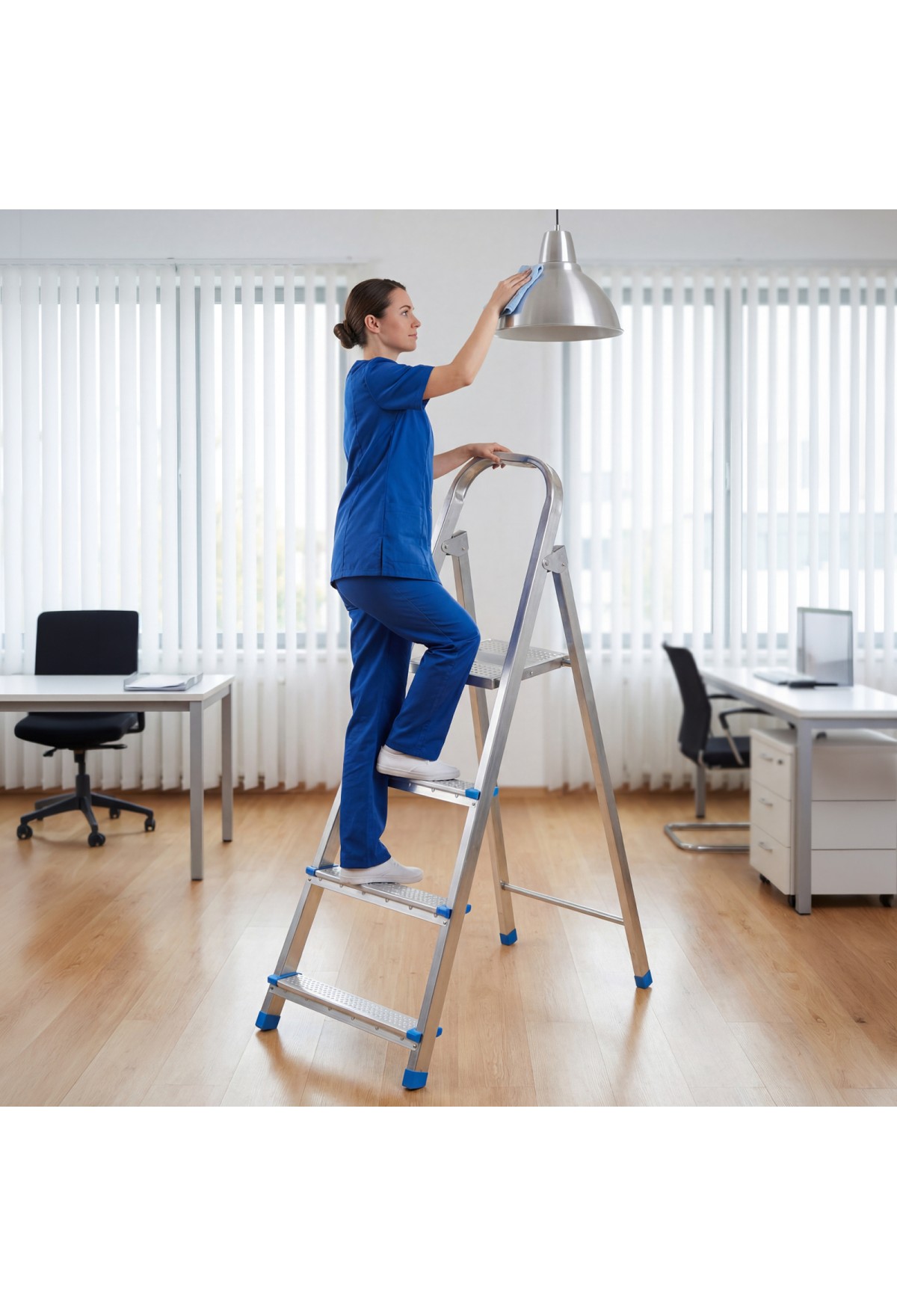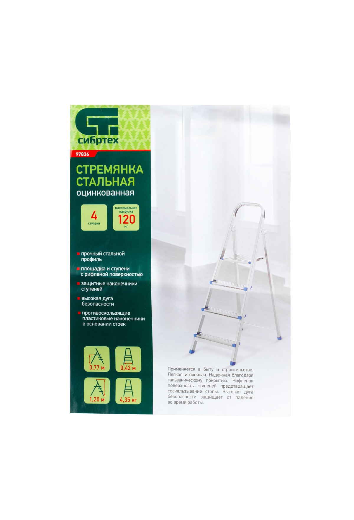 Стальная оцинкованная стремянка Сибртех 97836 с 4 ступенями позволяет повесить полку, картину или шкафчик, достать нужный предмет и решить другие задачи, для которых требуется доступ к предметам на высоте. Рама и ступени из стального профиля выдерживают вес до 120 кг. Расстояние от опорной поверхности до площадки составляет 76,5 см, при среднем росте пользователя 170 см рабочая высота лестницы — 276,5 см. Необходимо соблюдать технику безопасности: размещать стремянку только на ровной плоскости и не использовать ее для работы с дрелью, шуруповертом и другим электроинструментом.