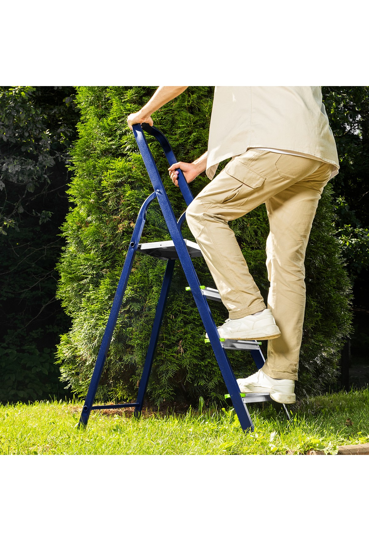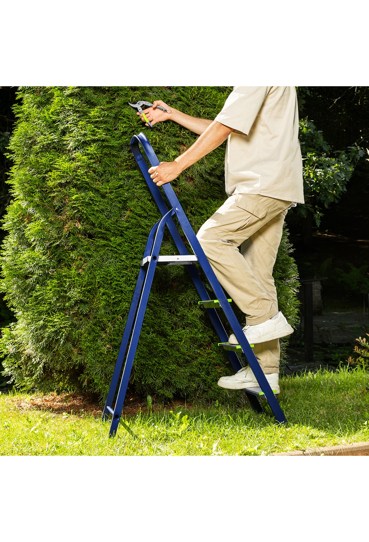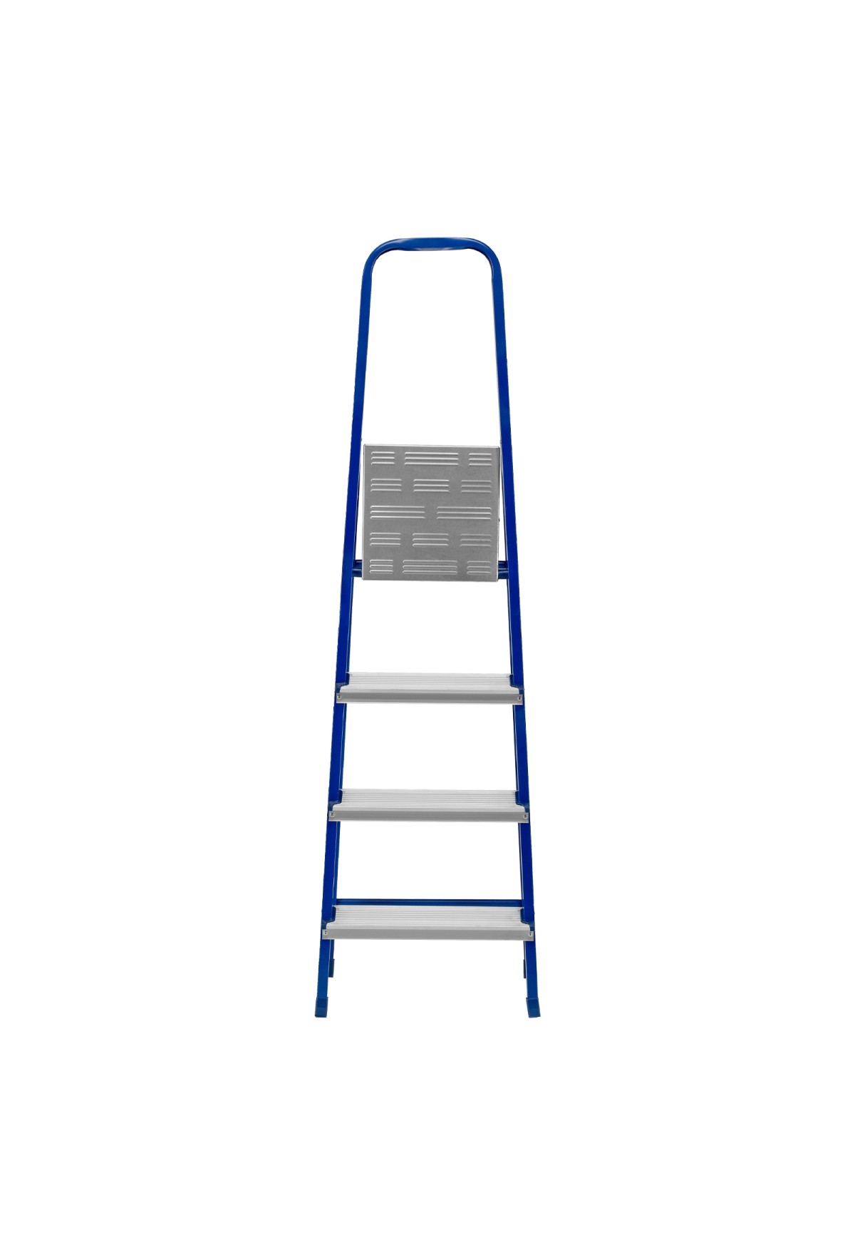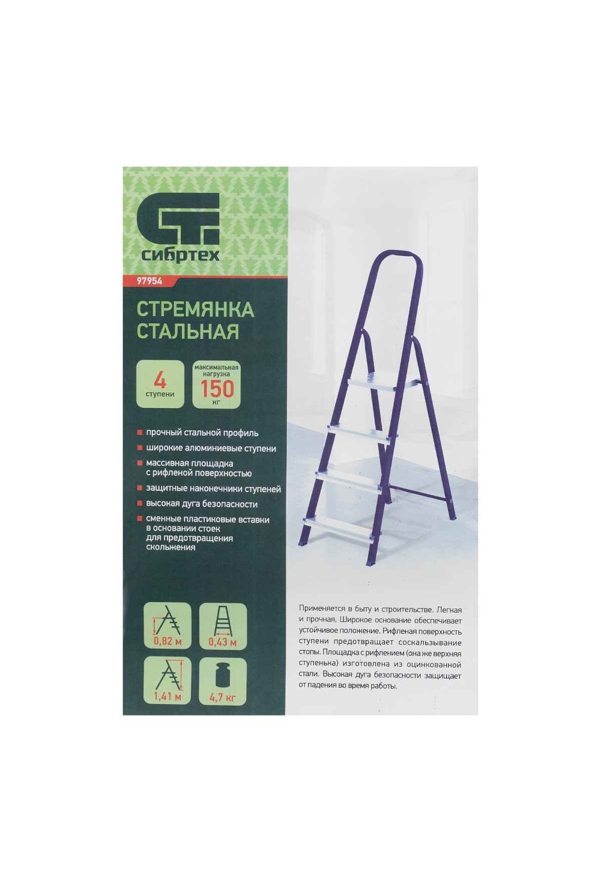 Стремянка Сибртех 97954 со стальным профилем и 4 ступенями, 3 из которых алюминиевые, упрощает доступ к предметам, расположенным на антресолях, шкафах, высоких полках. Также будет полезна для проведения отделочных и монтажных работ. Лестница обладает высокой прочностью при весе 5,2 кг и выдерживает нагрузку до 150 кг. Площадка находится на высоте 79,4 см от опорной поверхности, рабочая высота стремянки составляет 279,4 см (при среднем росте пользователя 170 см).