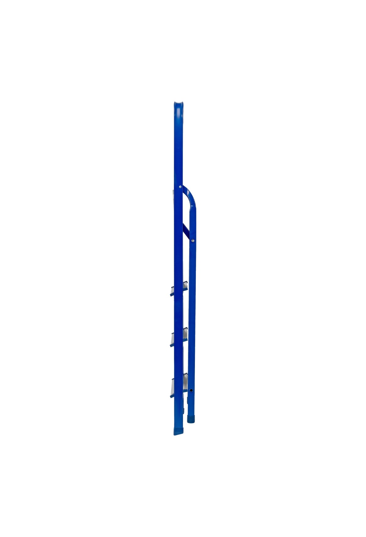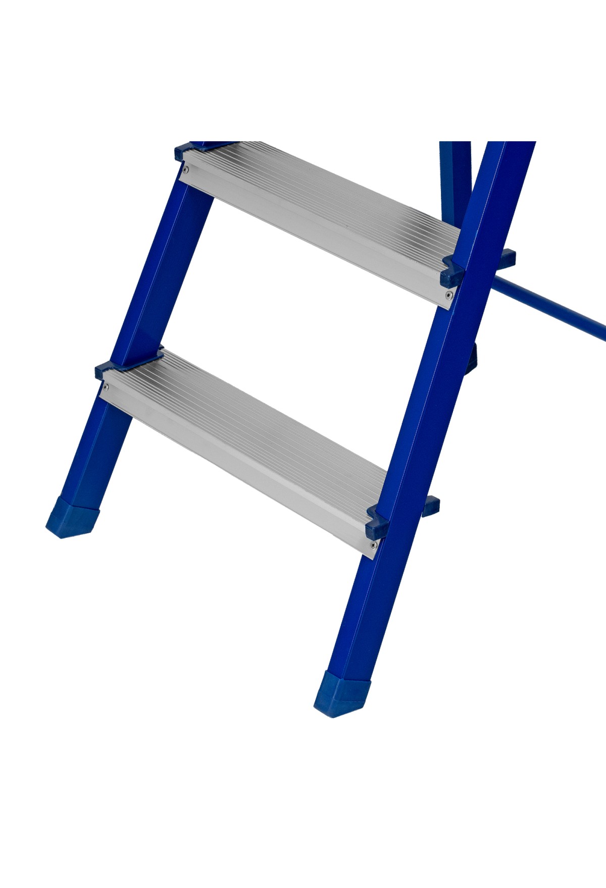 - Надежная конструкция — рама изготовлена из профилированной стали, стальная верхняя площадка с зацепами прочно фиксирует стремянку в рабочем положении.