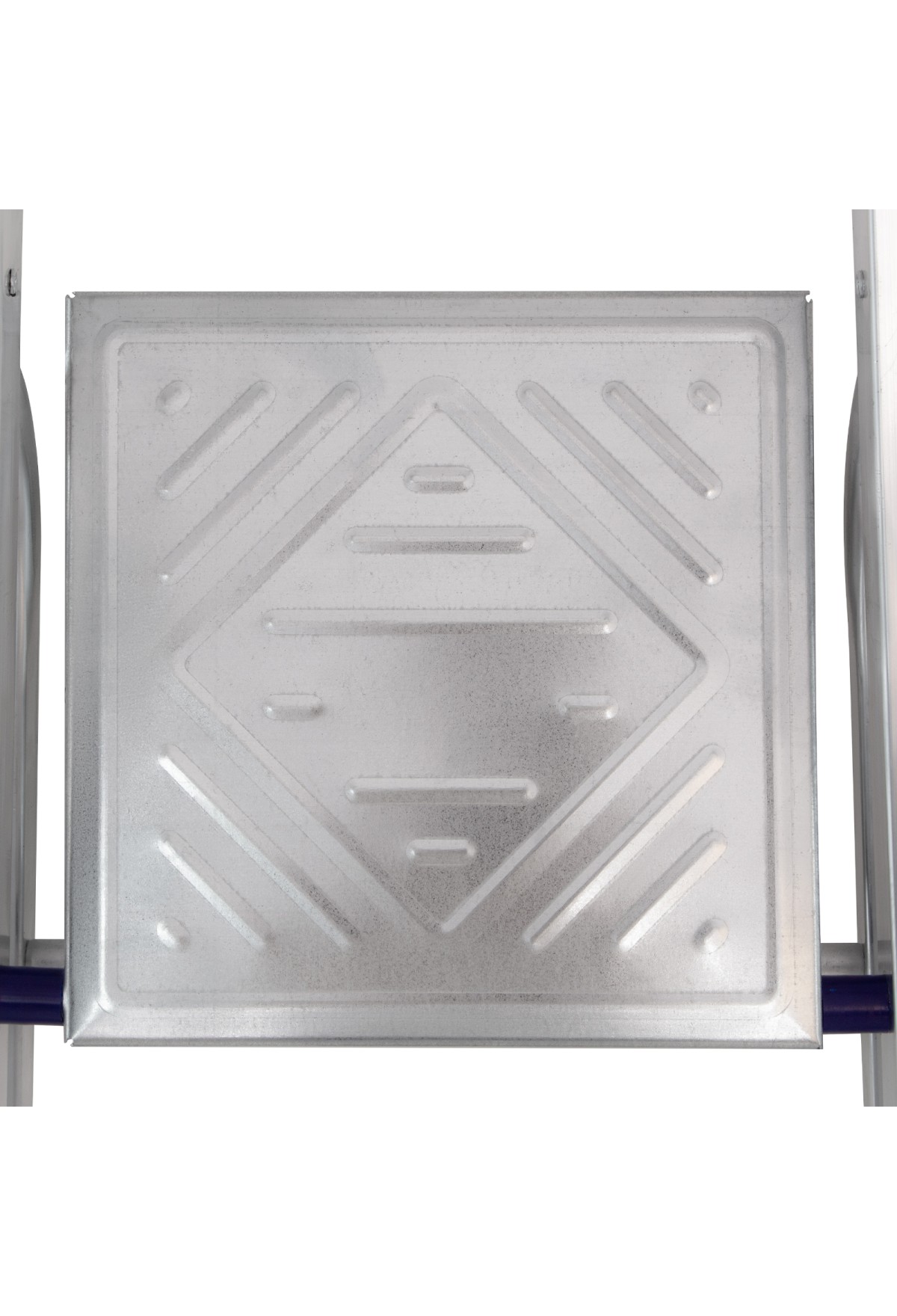 • Продуманная конструкция — стальная рабочая площадка с зацепами надежно фиксирует стремянку в разложенном положении.