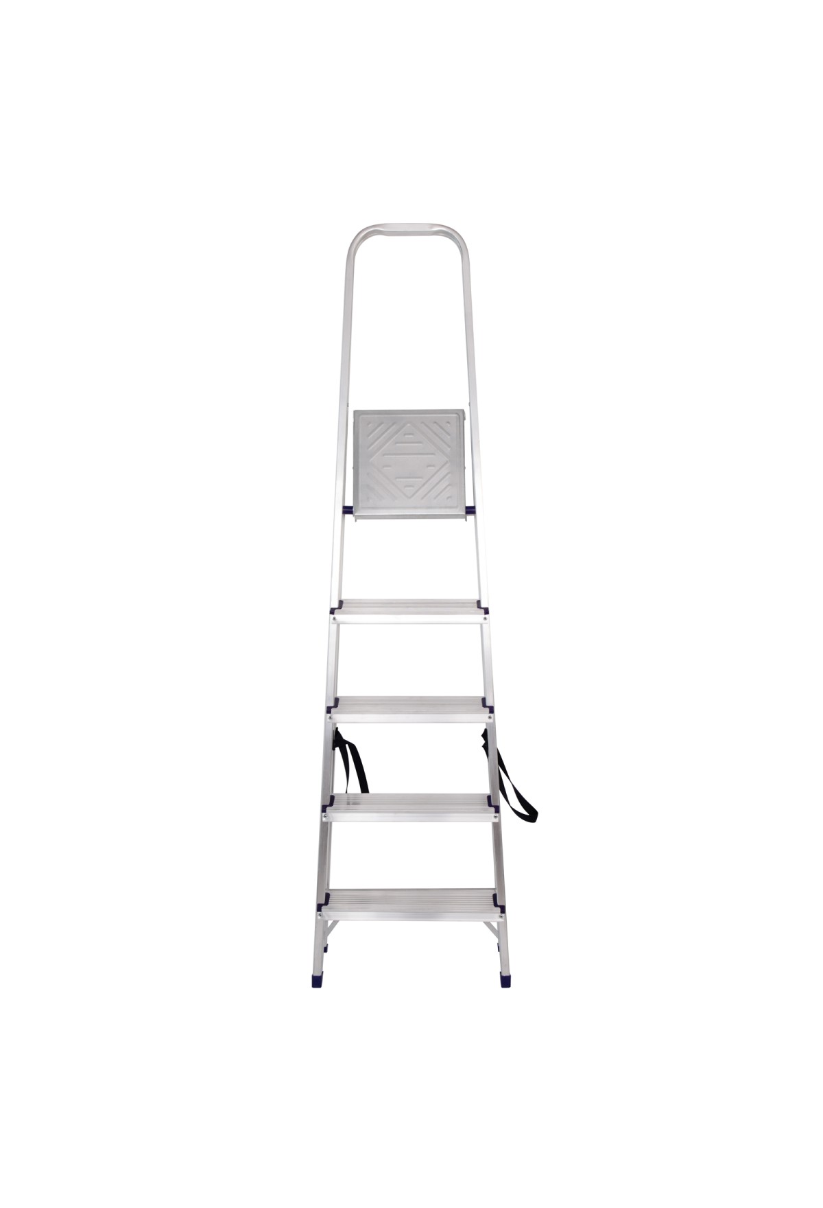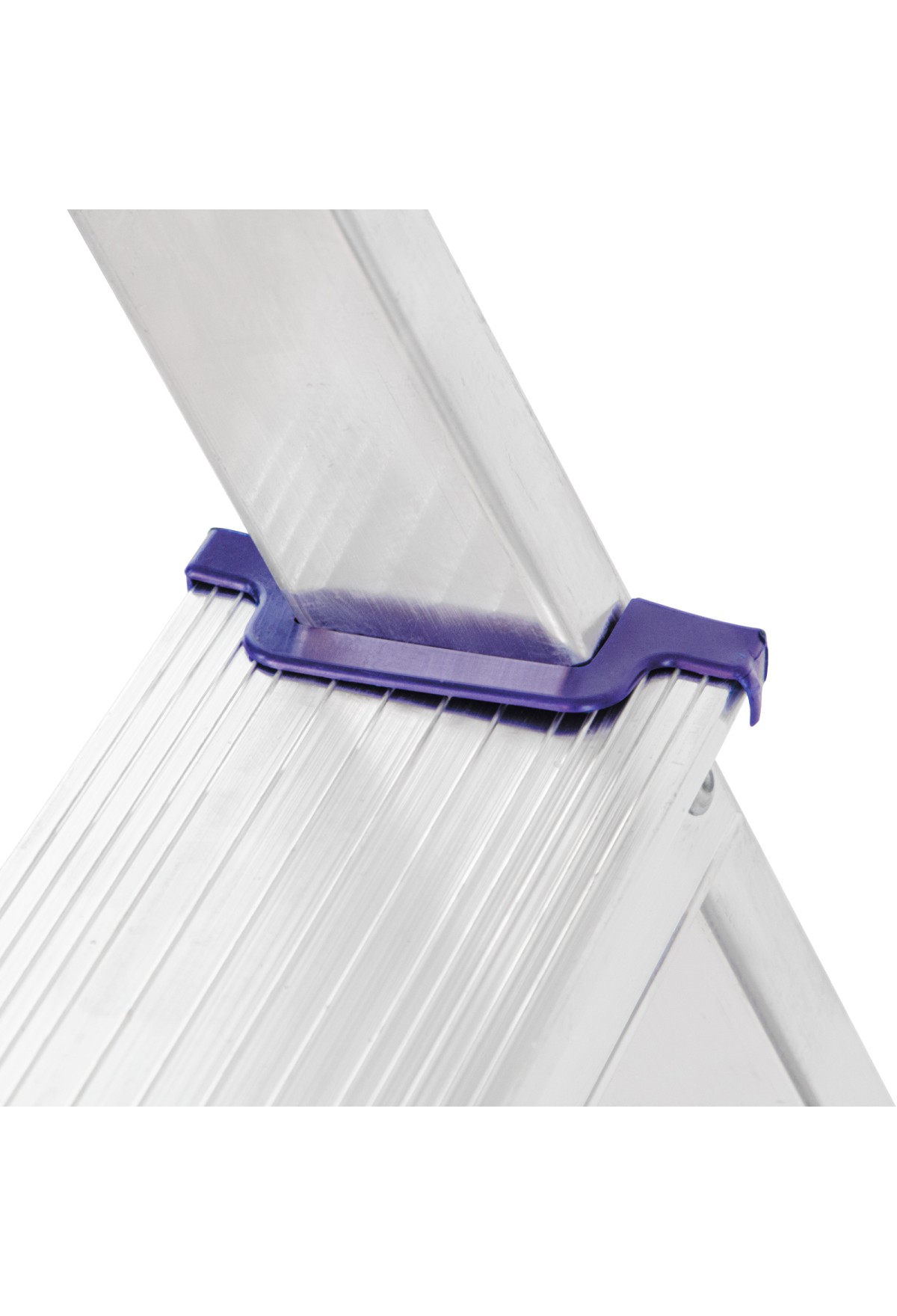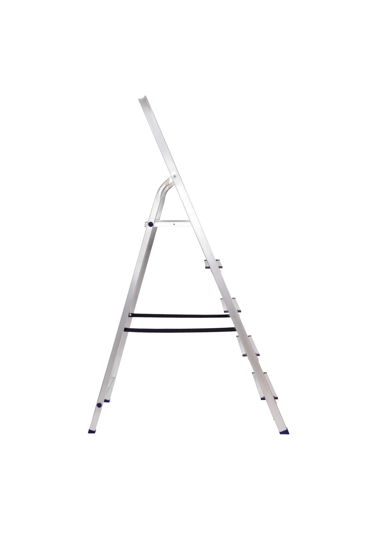 • Надежность — рама из прямоугольного алюминиевого профиля выдерживает нагрузку до 150 кг, широкие ступени закреплены заклепками, страховочные стяжки повышают прочность конструкции.
