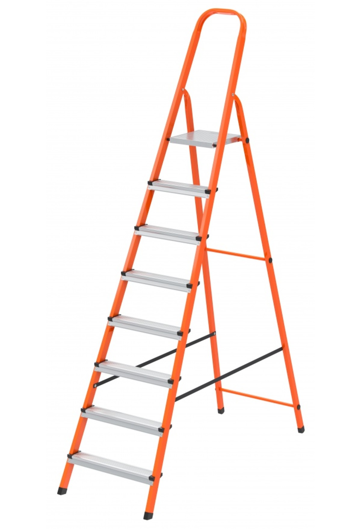 Стремянка оранжевая Сибртех 97968 со стальным профилем и 8 ступенями из стали используется, чтобы достать нужный предмет с антресолей или высокой полки, вытереть пыль на шкафу, заменить лампочку в люстре, а также решить другие бытовые вопросы. Также будет полезна для выполнения малярных и монтажных работ. Лестница рассчитана на нагрузку до 150 кг. Площадка находится на высоте 164 см от опорной поверхности, рабочая высота стремянки составляет 364 см (при среднем росте пользователя 170 см). Стремянка имеет широкое основание и характеризуется устойчивостью.