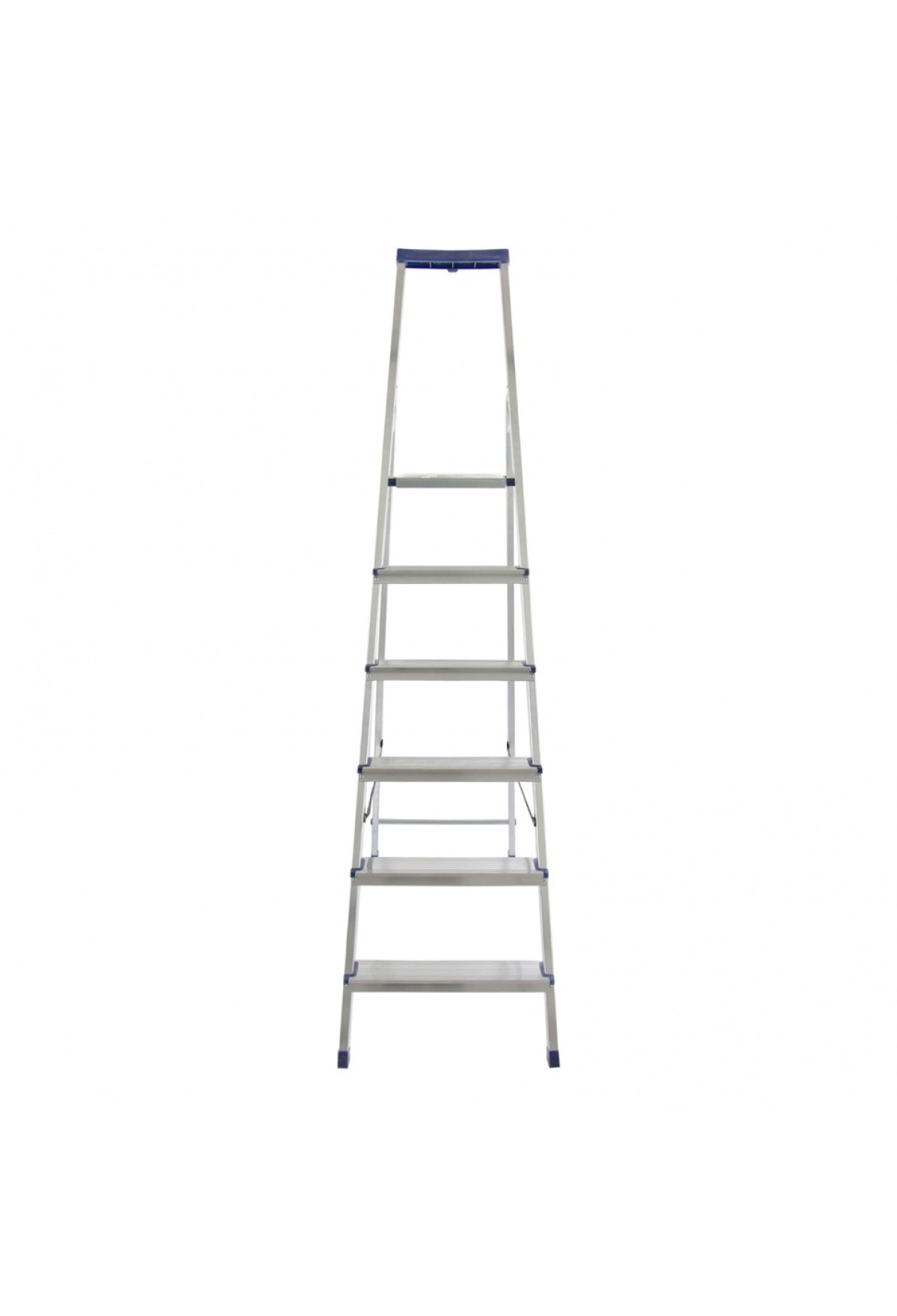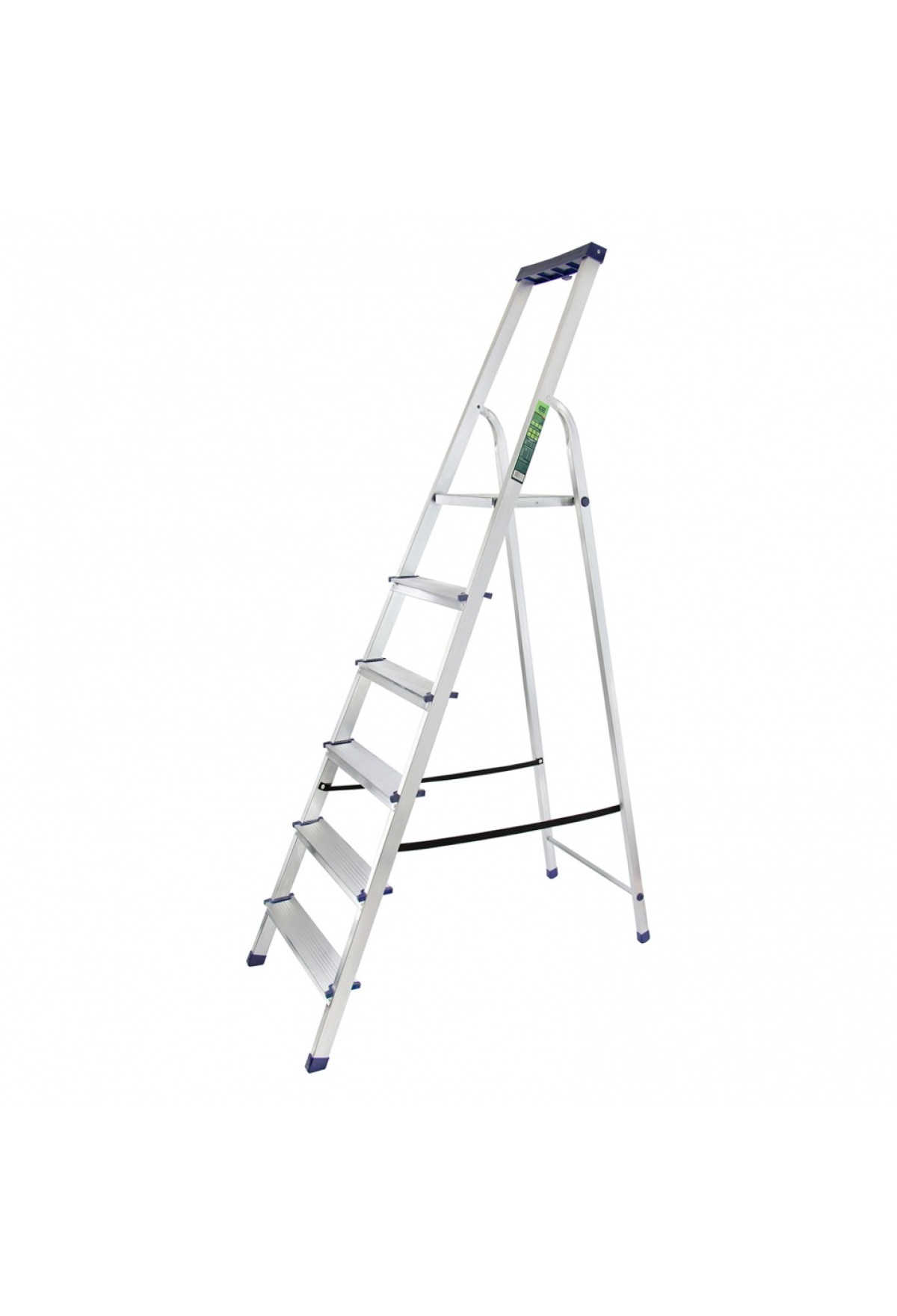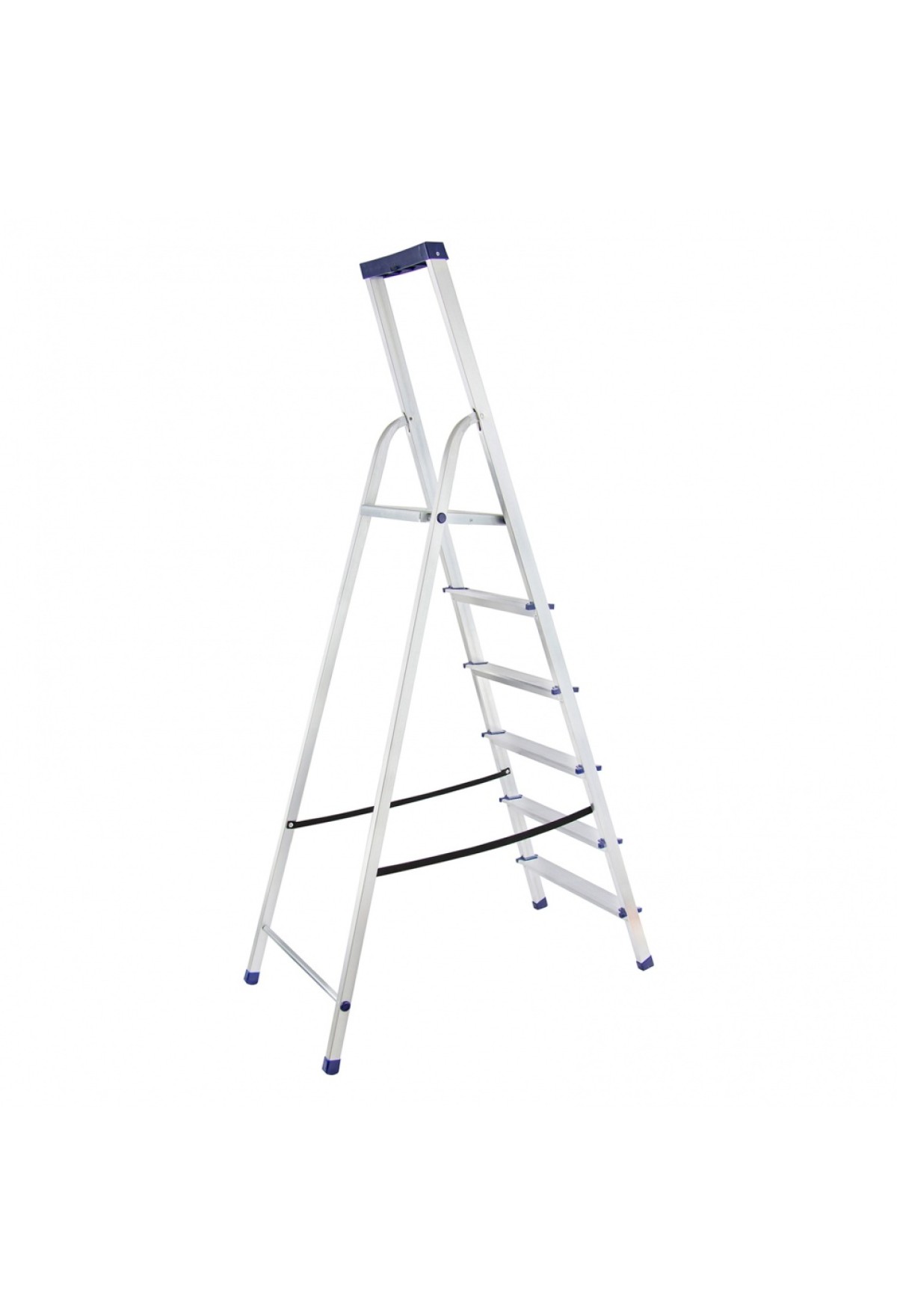 Стремянка алюминиевая Сибртех «Универсал» 97896 с 6 ступенями — складная лестница для отделочных и монтажных работ на высоте, превышающей человеческий рост. Площадка находится на высоте 124,5 см от опорной поверхности, рабочая высота стремянки составляет 324,5 см (при среднем росте пользователя 170 см). Высокая дуга обеспечивает безопасность пользователя. Стремянка удобна для длительной работы, используется во время строительства и ремонта, а также в быту.