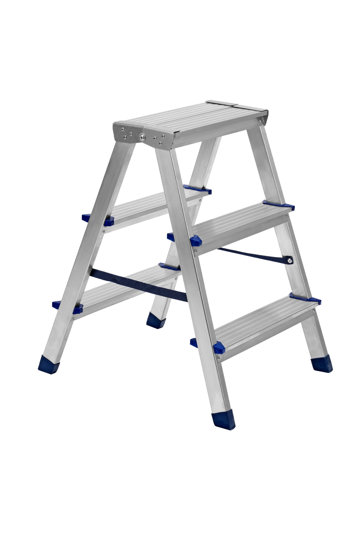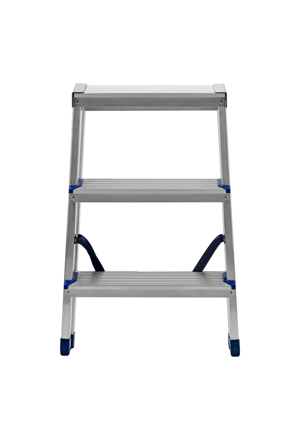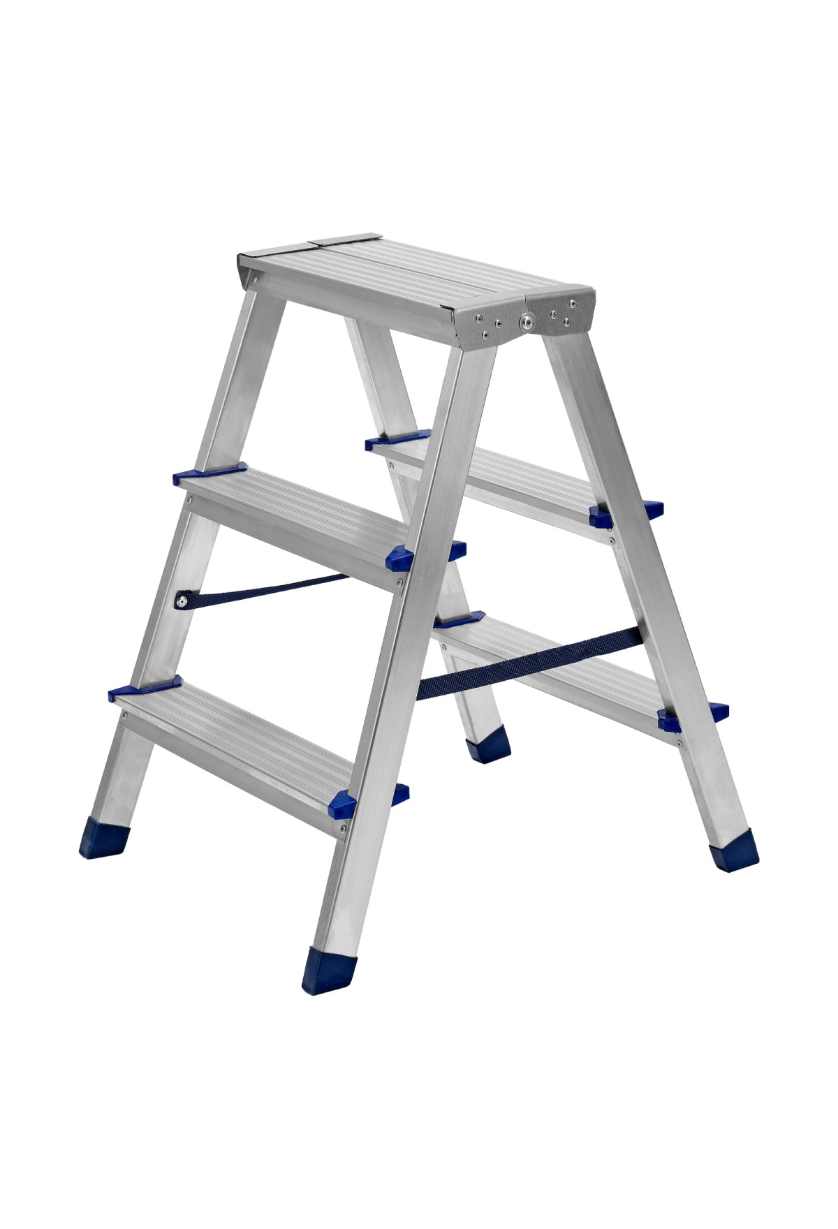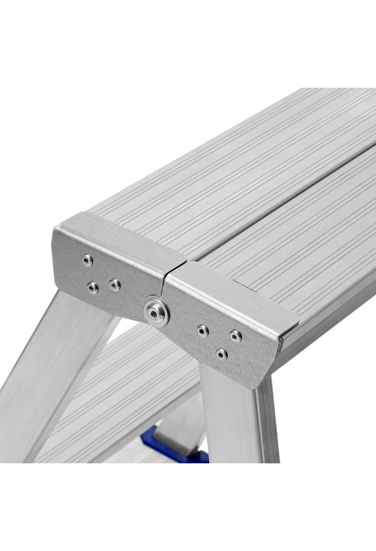 Стремянка двусторонняя алюминиевая Сибртех 97923 с 3 ступенями позволяет выполнять различные действия на высоте — штукатурить или красить стены, менять лампочки, вытирать пыль, доставать нужные предметы с верхних полок. Площадка находится на высоте 60,4 см от опорной поверхности, рабочая высота стремянки составляет 260,4 см (при среднем росте пользователя 170 см).