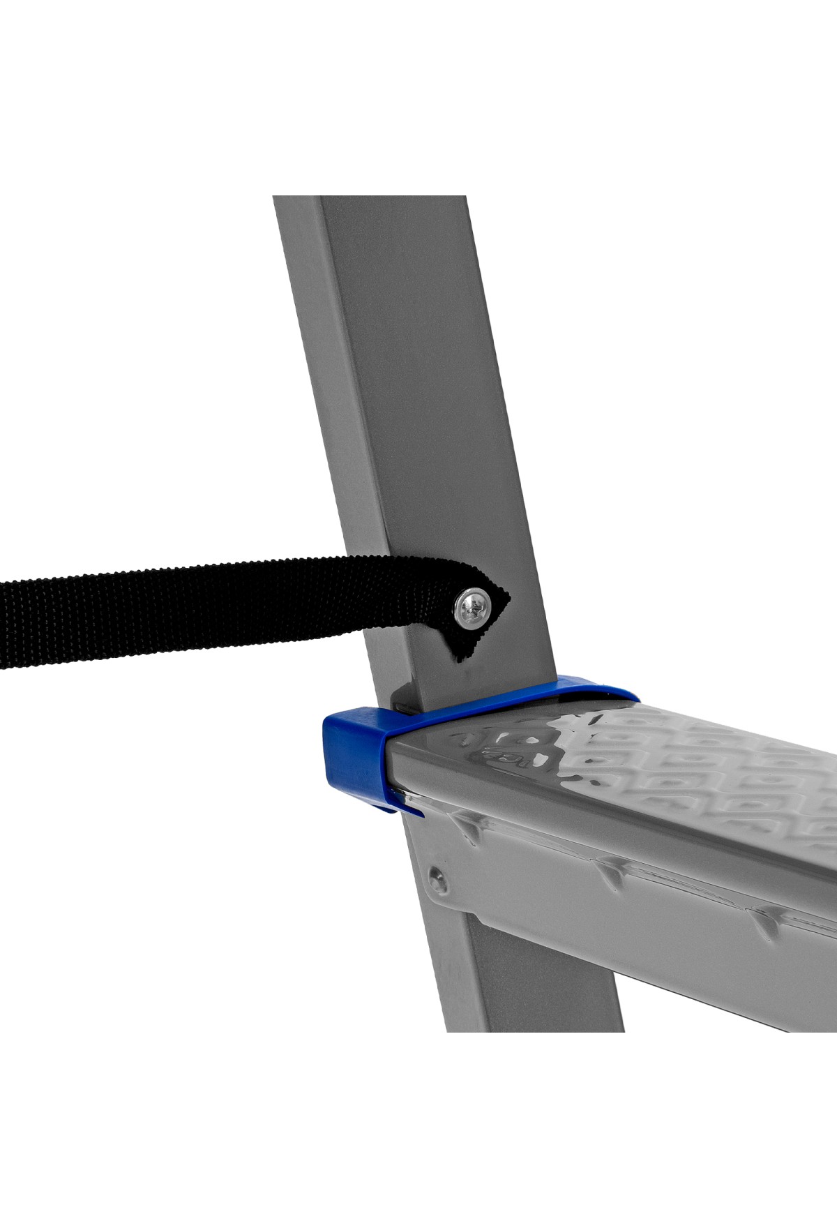 - Надежность — стремянка из стального профиля с широкими ступенями выдерживает вес до 120 кг, страховочные ленты из полиэстера повышают устойчивость.