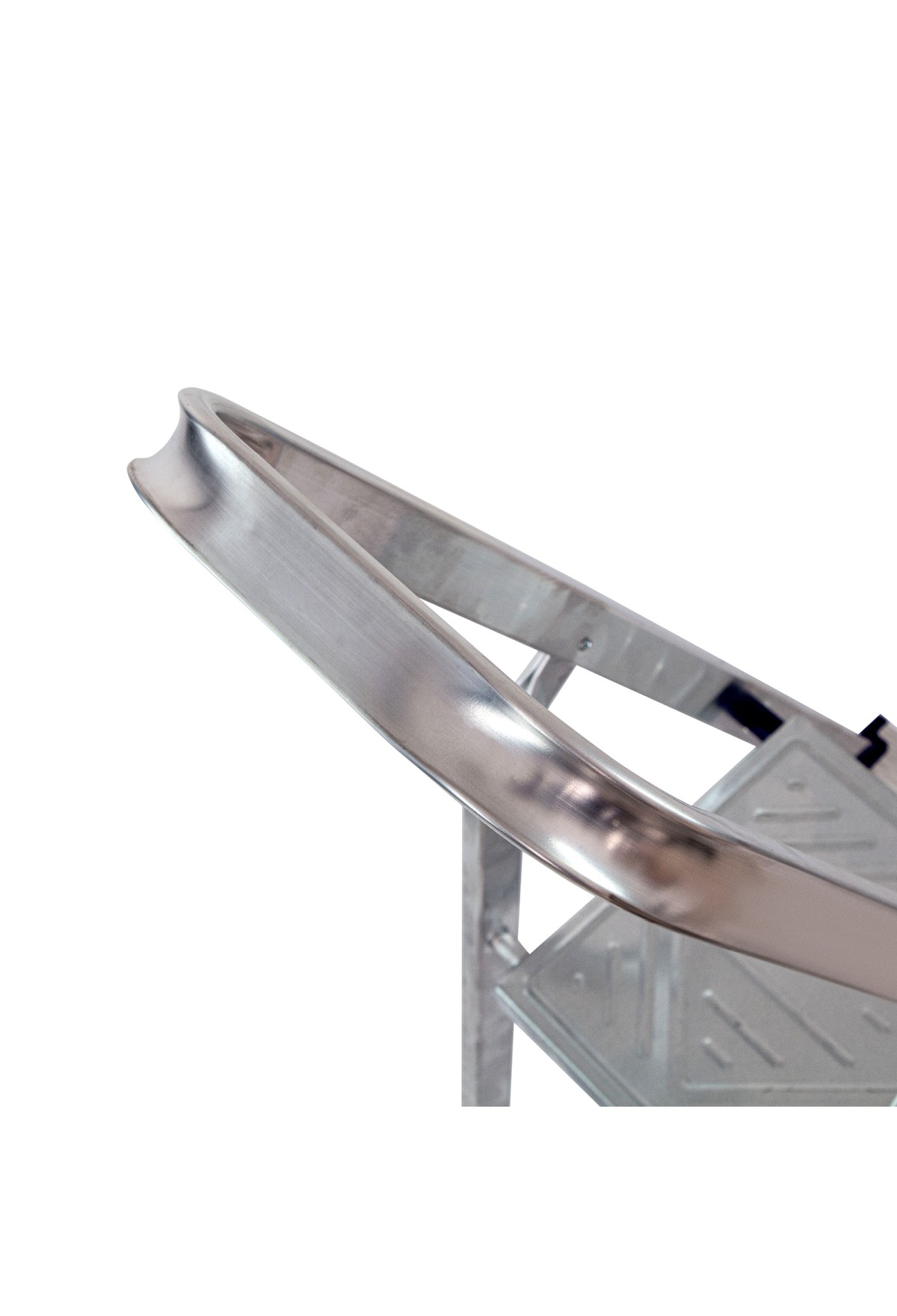 - Надежность — рама из прямоугольного алюминиевого профиля выдерживает нагрузку до 150 кг, широкие ступени закреплены заклепками, страховочные стяжки повышают прочность конструкции.