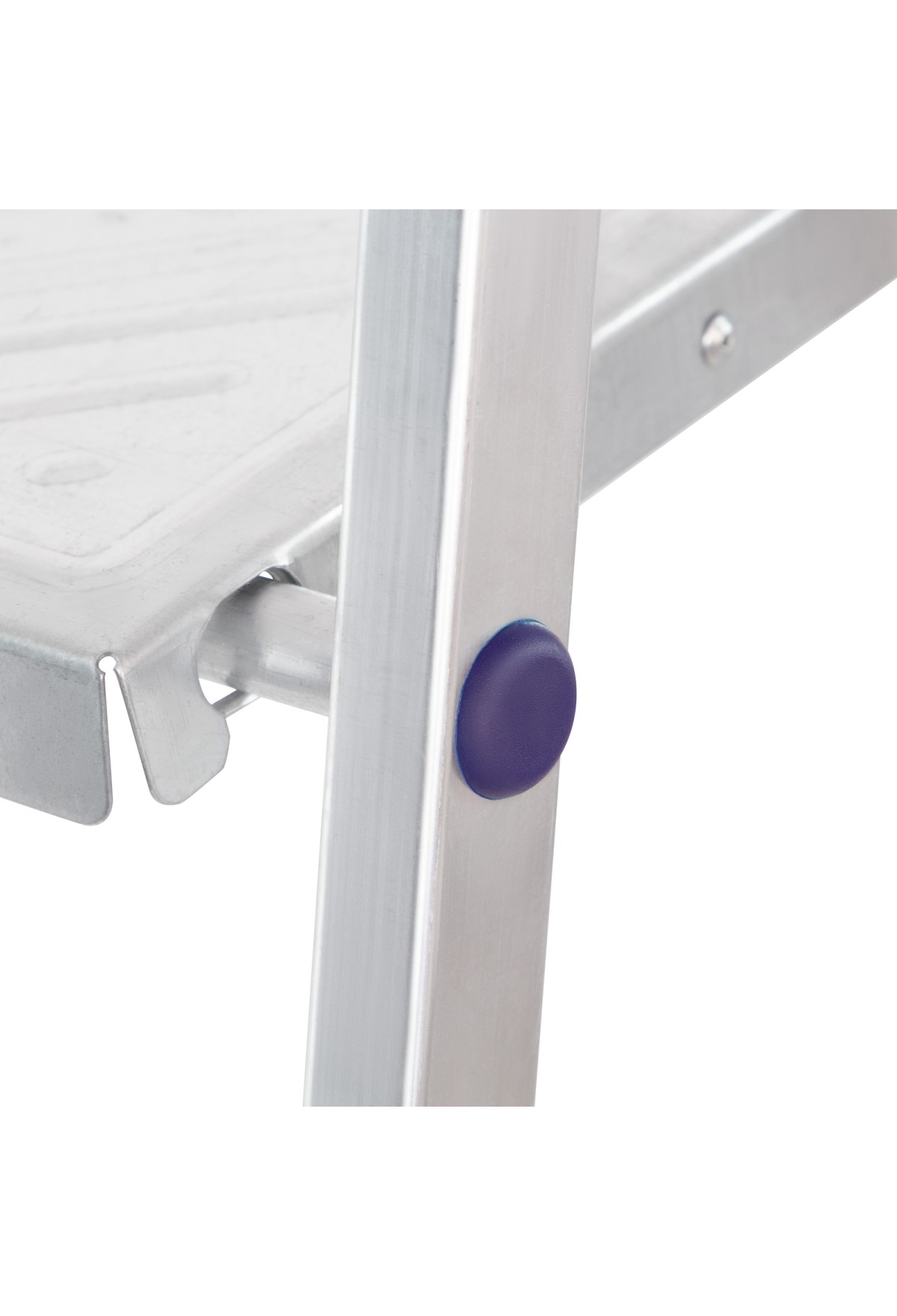- Продуманная конструкция — стальная рабочая площадка с зацепами надежно фиксирует стремянку в разложенном положении.