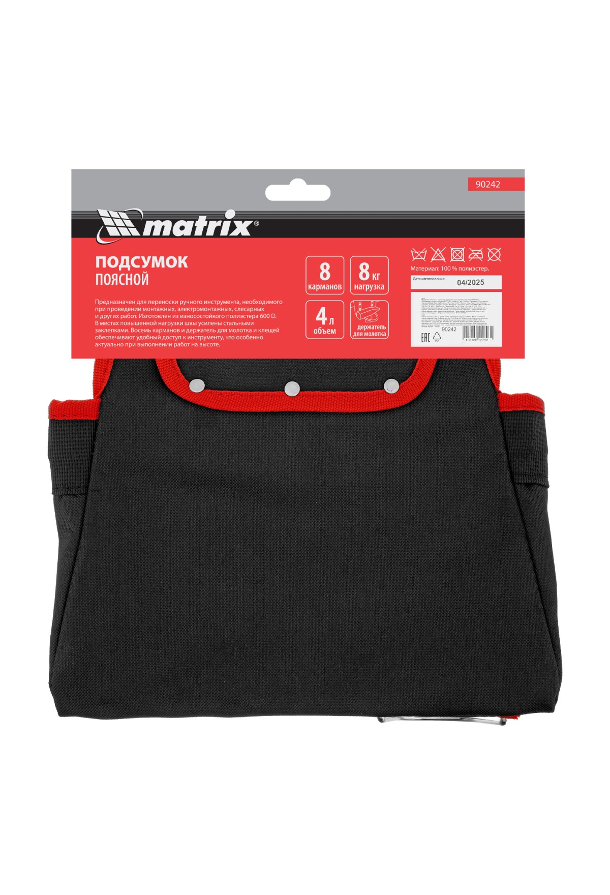 Поясной подсумок Matrix 90242 с 8 карманами и держателями для молотка и клещей используется для переноски инструментов. Крепится на ремень и позволяет иметь под рукой все необходимое, что особенно важно во время работы на высоте. Будет полезен для проведения монтажных, ремонтных и отделочных работ.